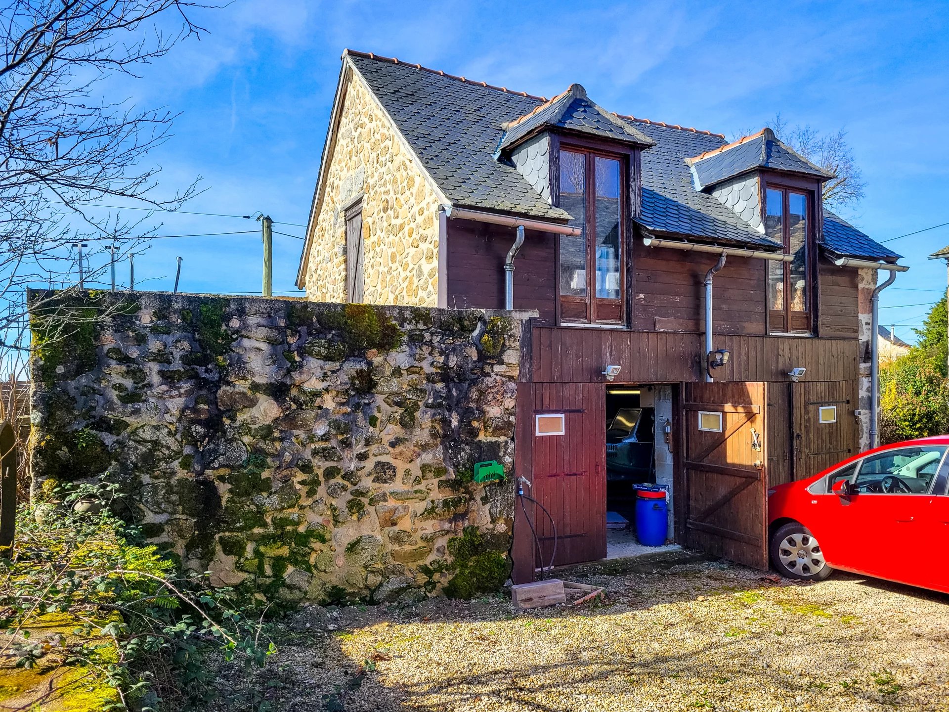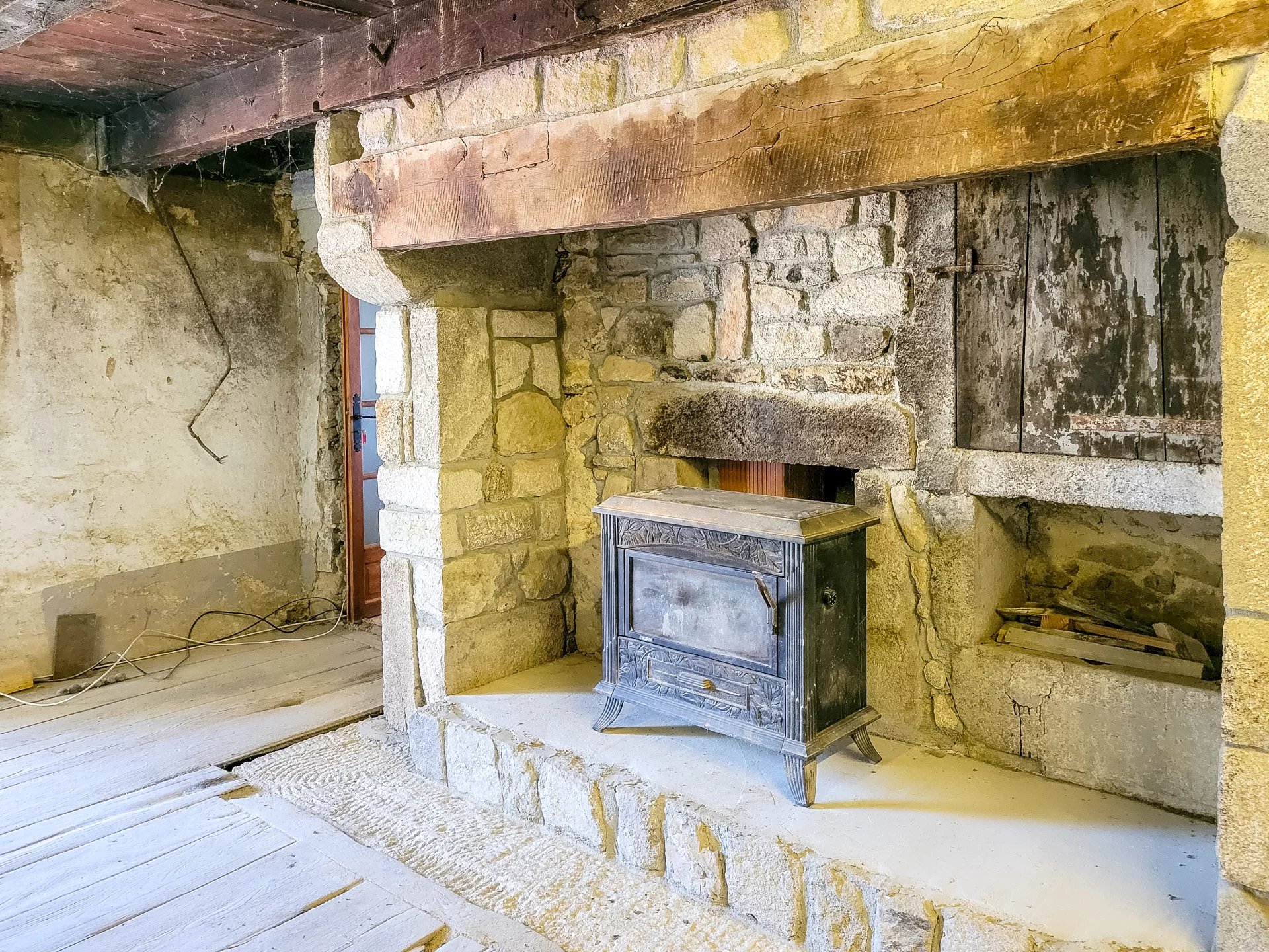 The former farmhouse, attached to the barn, offers 150 m² to restore—featuring original details like a stone fireplace, well, and wine cellar. With permissions, it could become a gîte, studio, or additional living space.