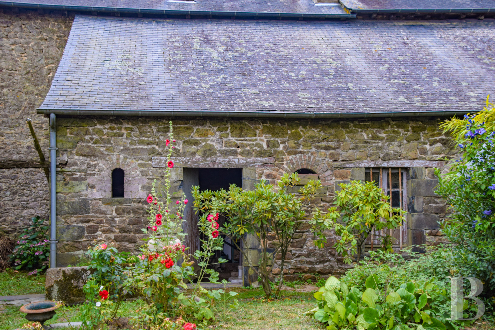 A private garden planted with birches, hydrangeas, and hollyhocks adds charm, while the outbuilding provides flexible space for parking or a workshop.
