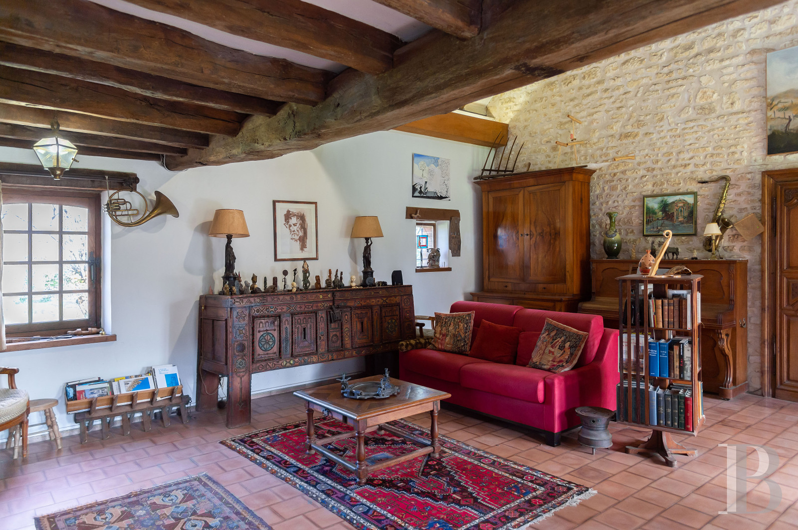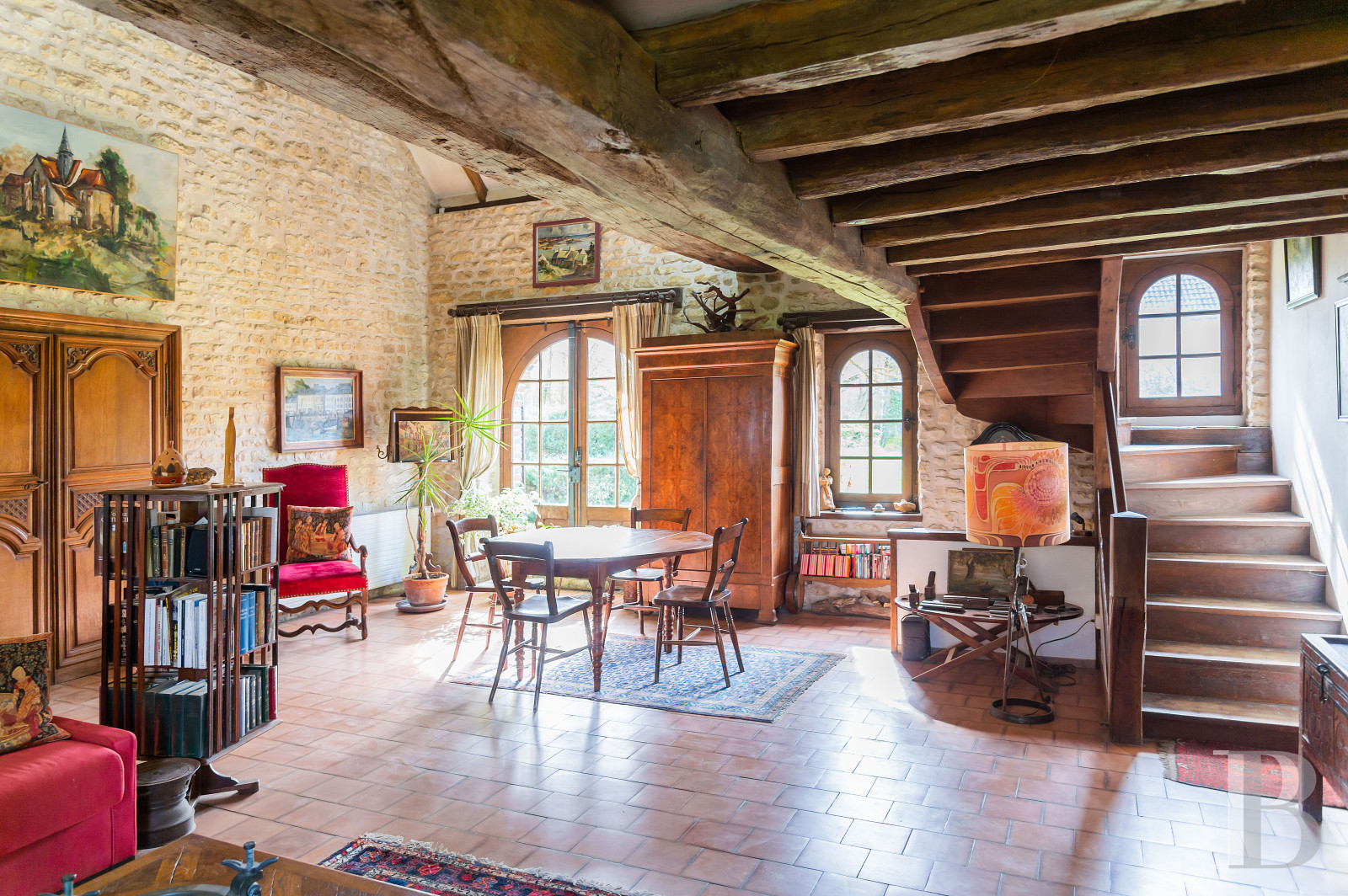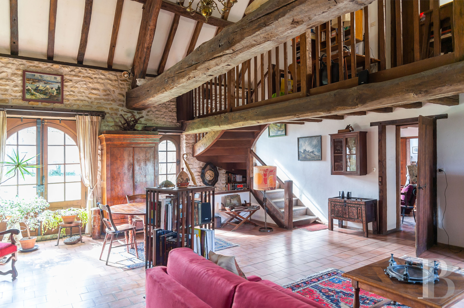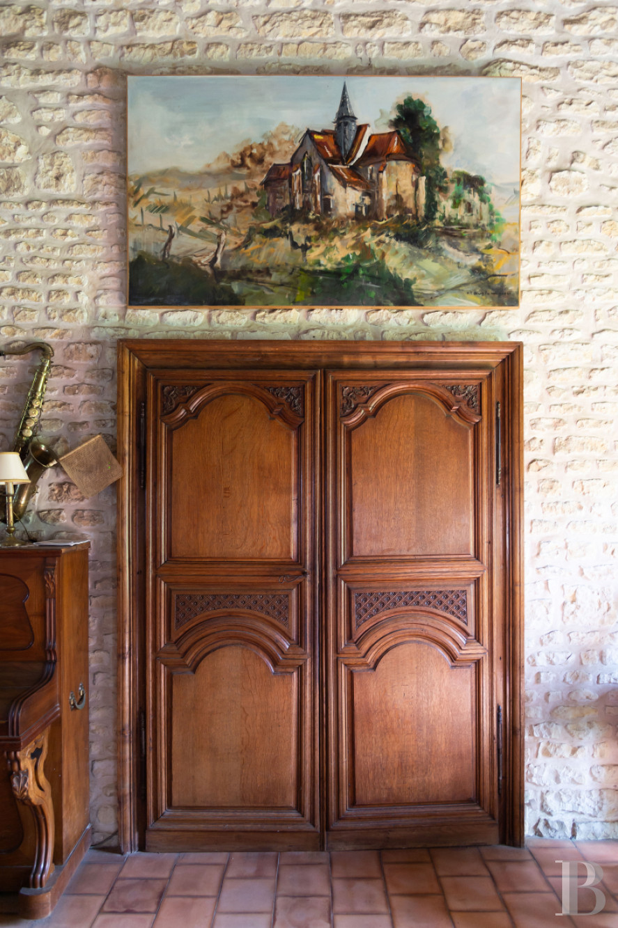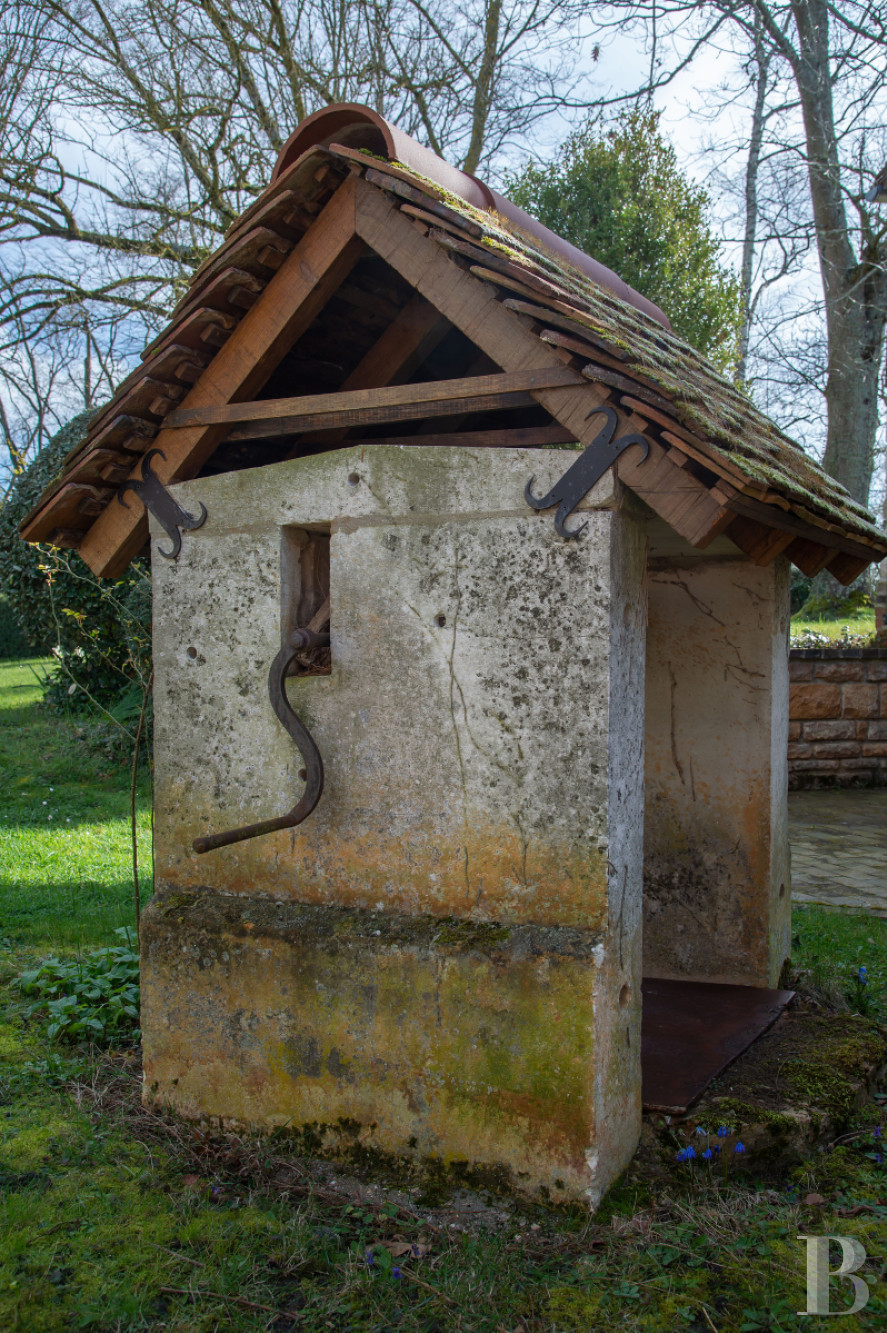 The main house and guesthouse share the same classic stonework and Burgundy-tile roofs. A courtyard links the buildings, while gardens, sculptures, and a historic well add character. Inside, original beams, terracotta tiles, fireplaces, and vaulted cellars create a warm and authentic atmosphere.
