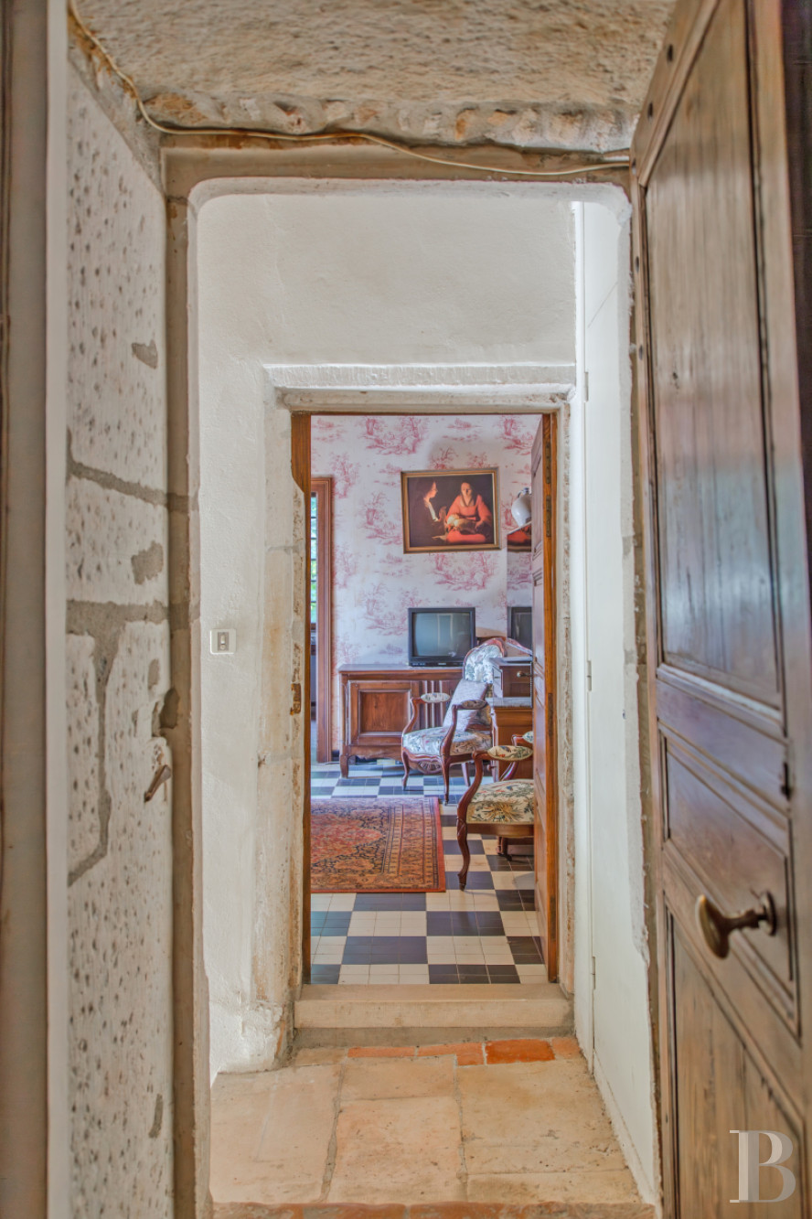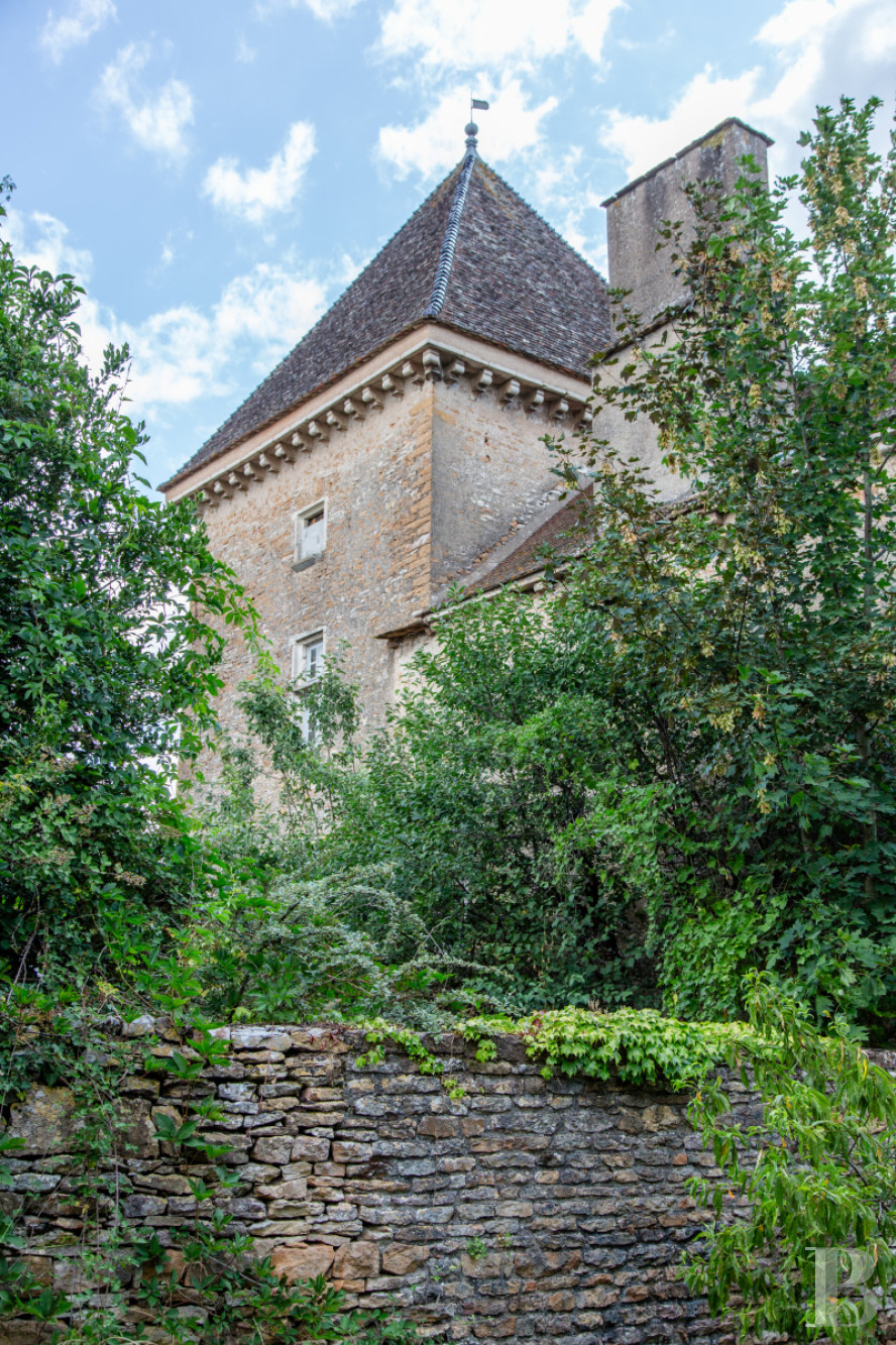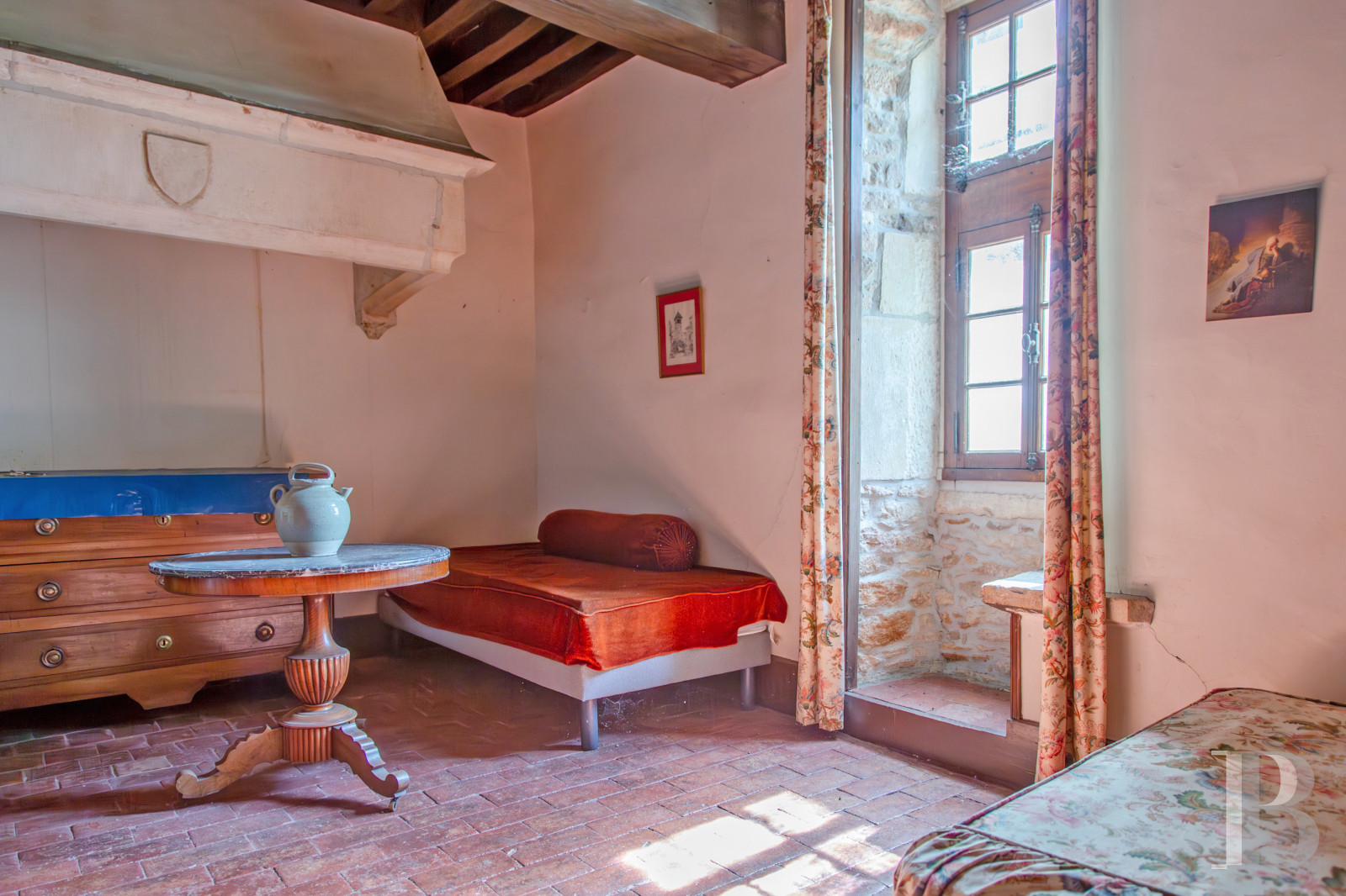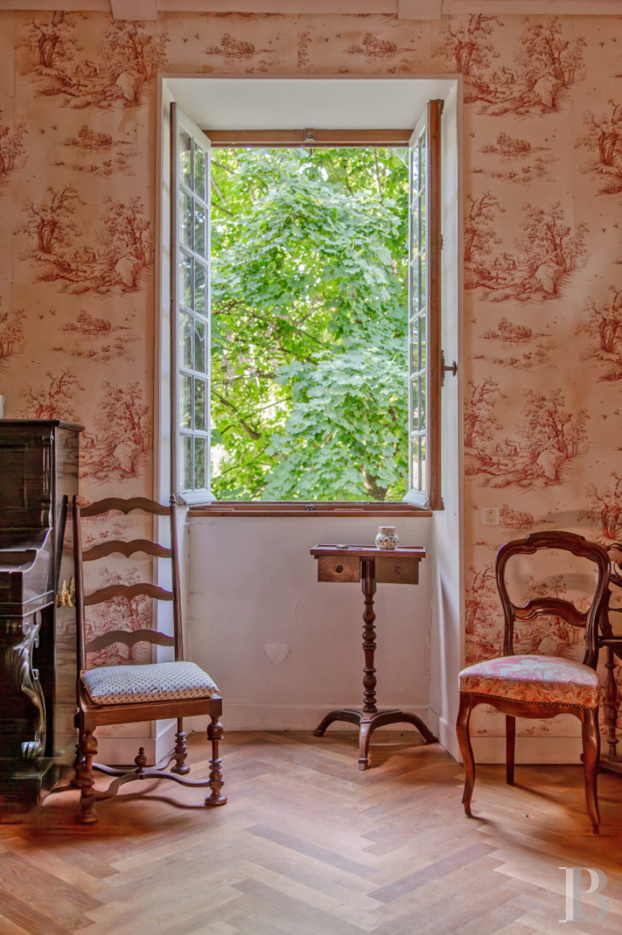 The layout is classic: technical rooms on the garden level, two grand rooms per floor above, and a final vaulted tower room at the top. French ceilings, mullioned windows, and fireplaces remain throughout.
