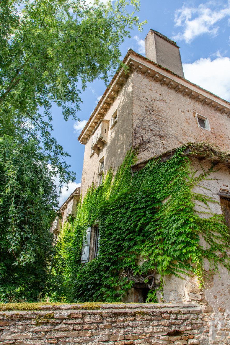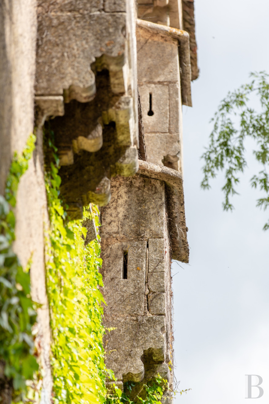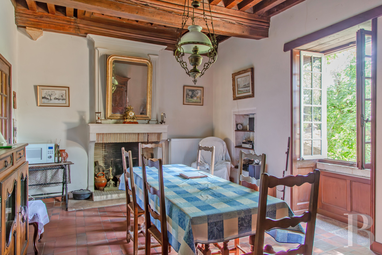 The layout is classic: technical rooms on the garden level, two grand rooms per floor above, and a final vaulted tower room at the top. French ceilings, mullioned windows, and fireplaces remain throughout.