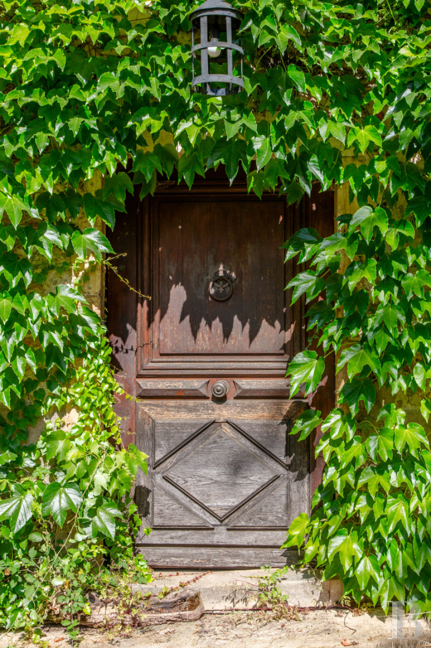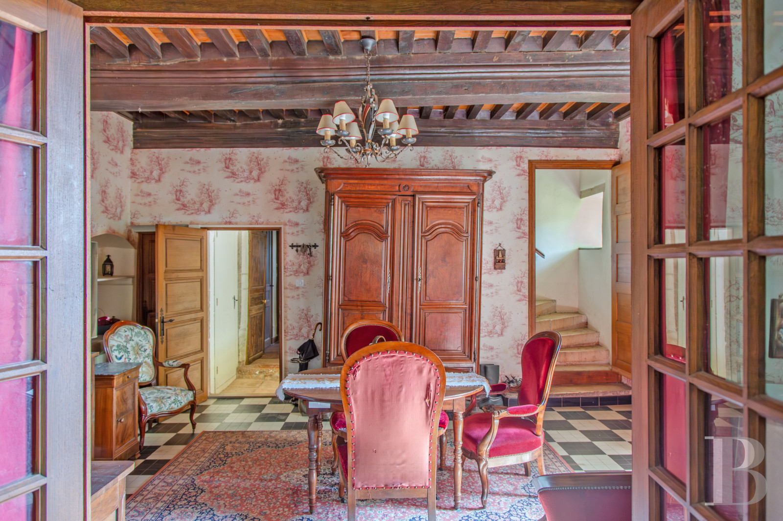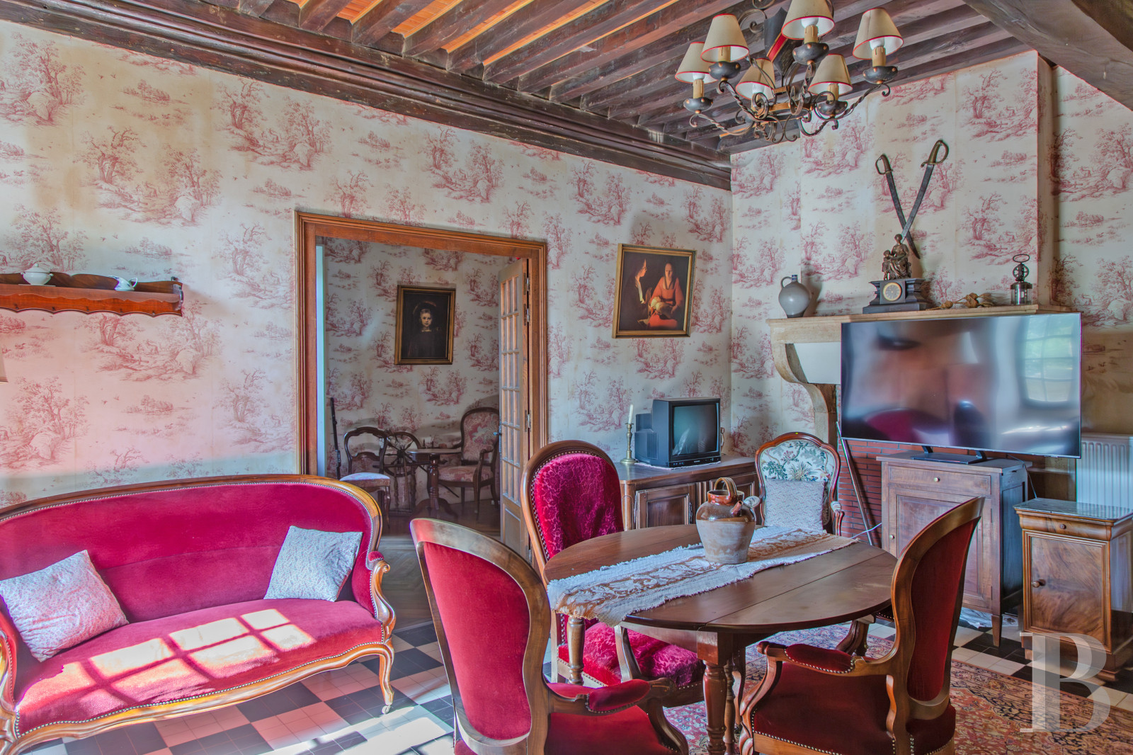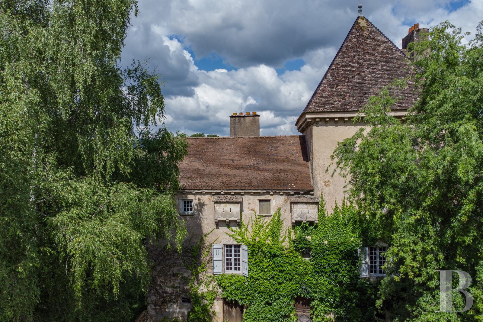The layout is classic: technical rooms on the garden level, two grand rooms per floor above, and a final vaulted tower room at the top. French ceilings, mullioned windows, and fireplaces remain throughout.