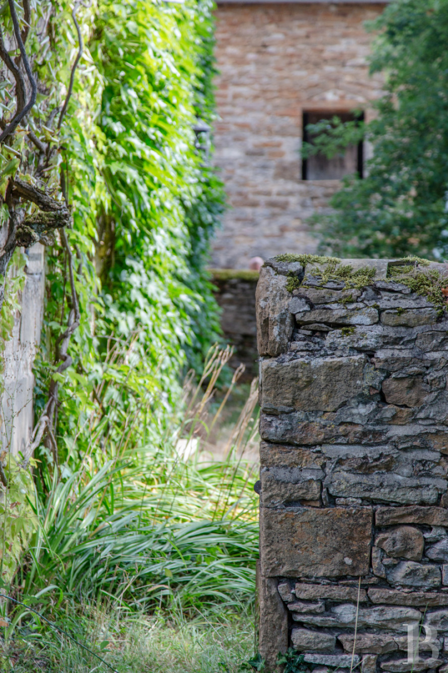Outside, stone walls and trees frame a shaded garden. At the entrance, a stone shed and bread oven add rustic charm.