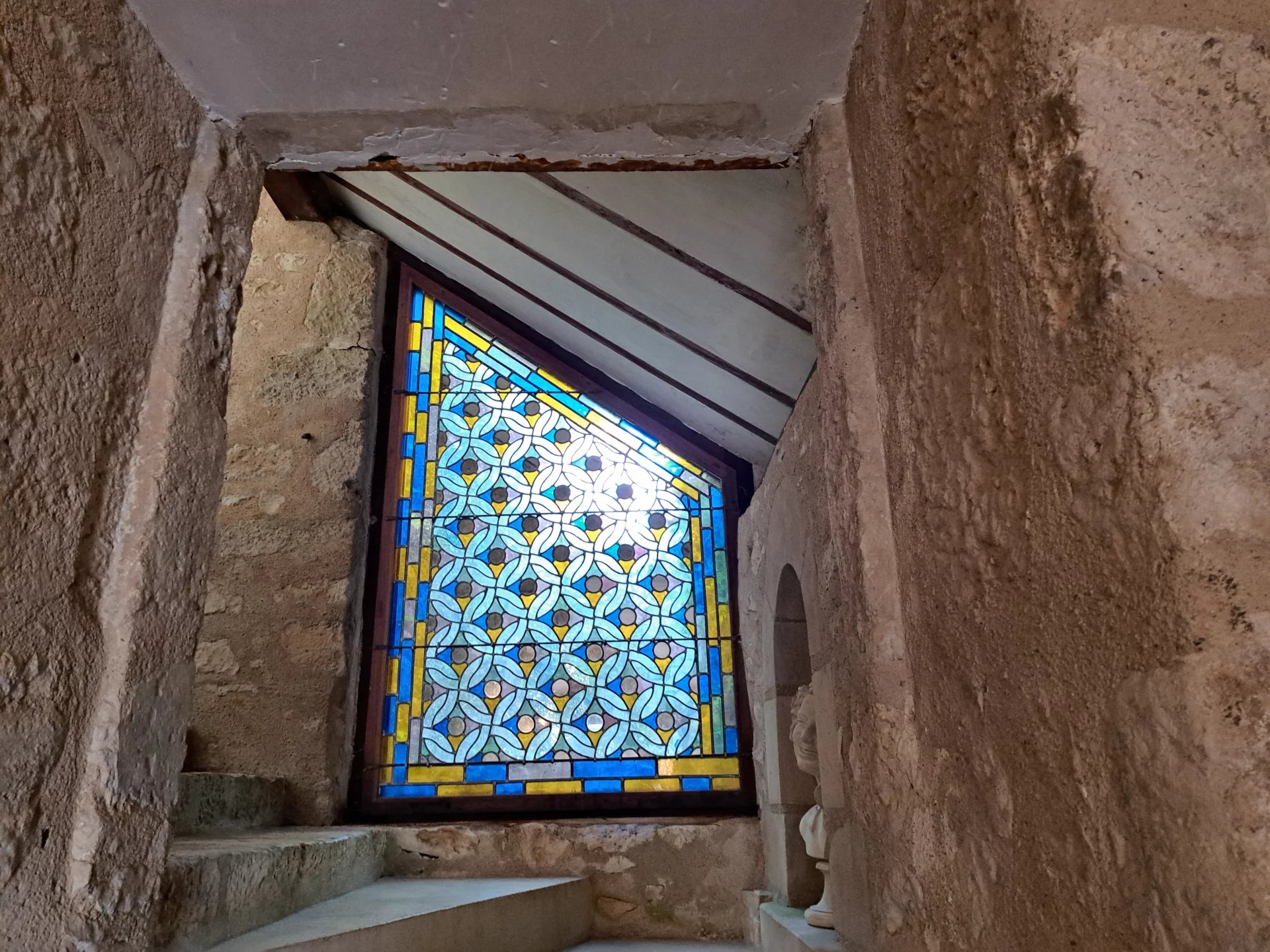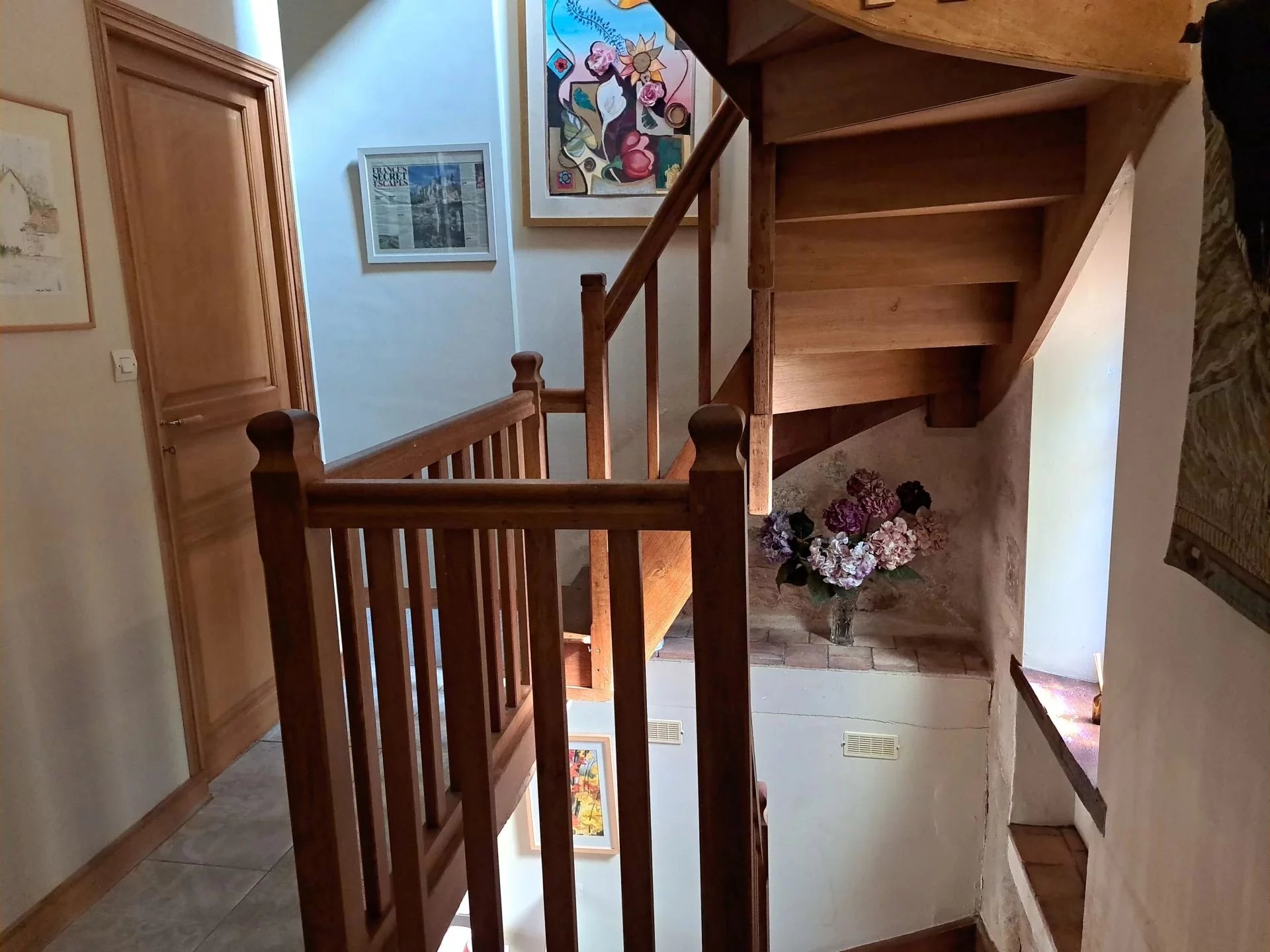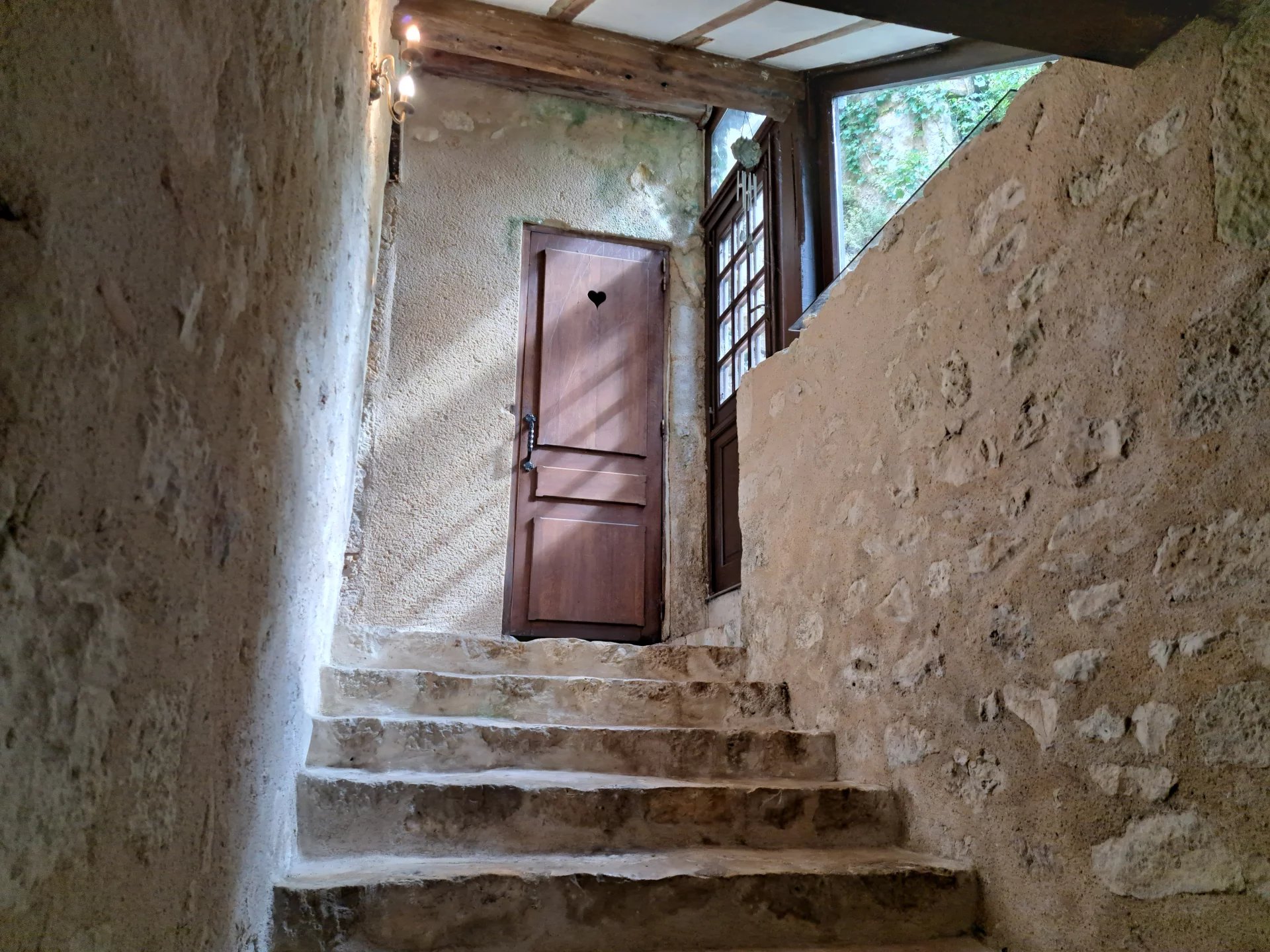 Through grand gates, enter a private courtyard with access to a double garage and original pigeonnier. Inside, a bright stone staircase rises from the utility room, passing a stained-glass window and a quirky WC built into the rockface.