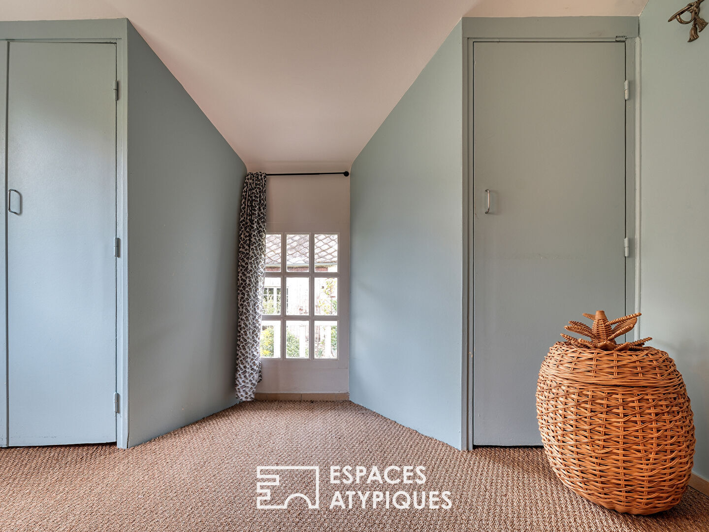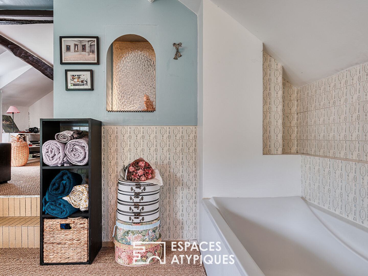 Upstairs are two charming bedrooms, a bathroom with WC, and a laundry room. The top floor offers a cosy attic retreat with garden views.