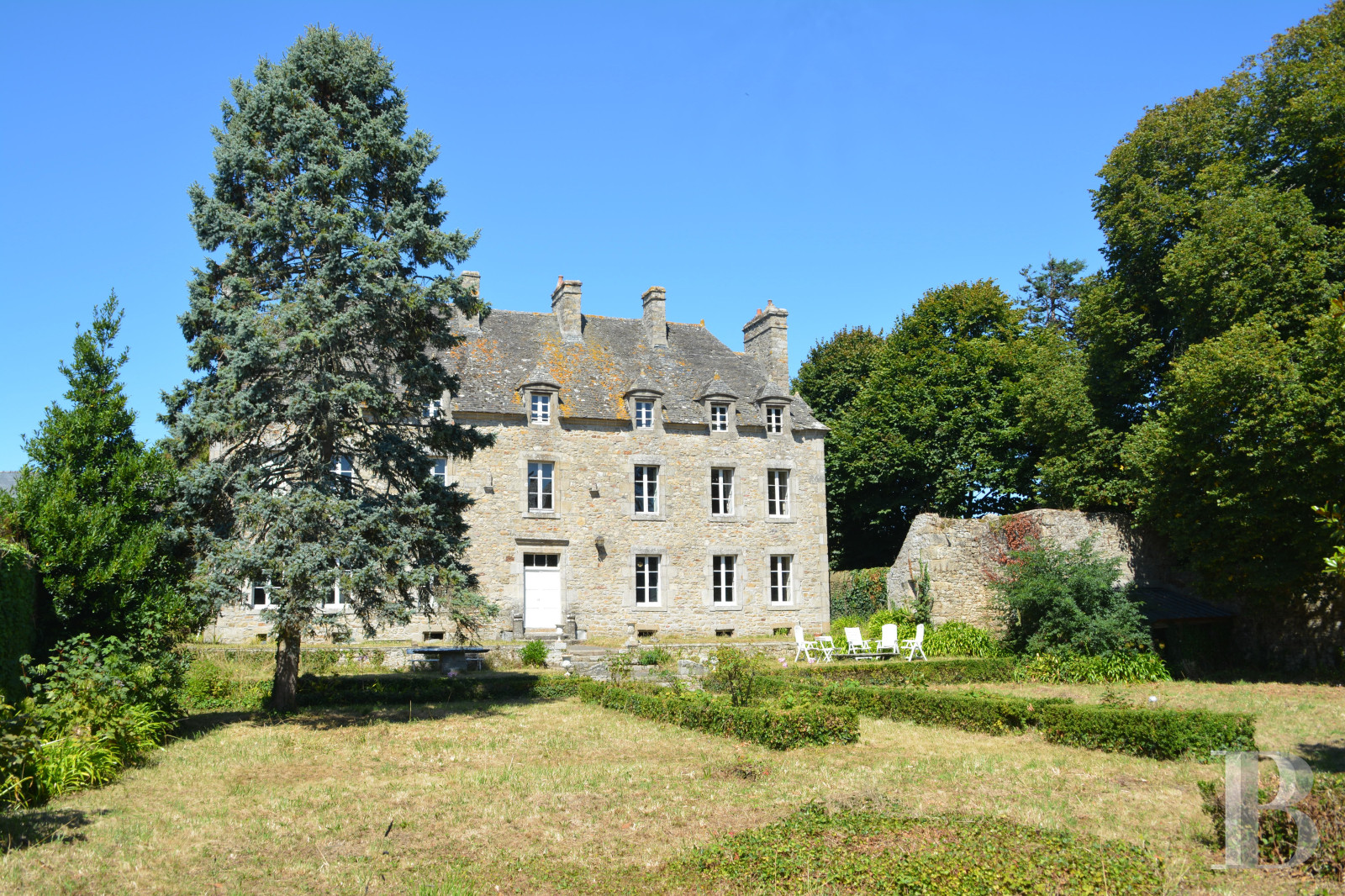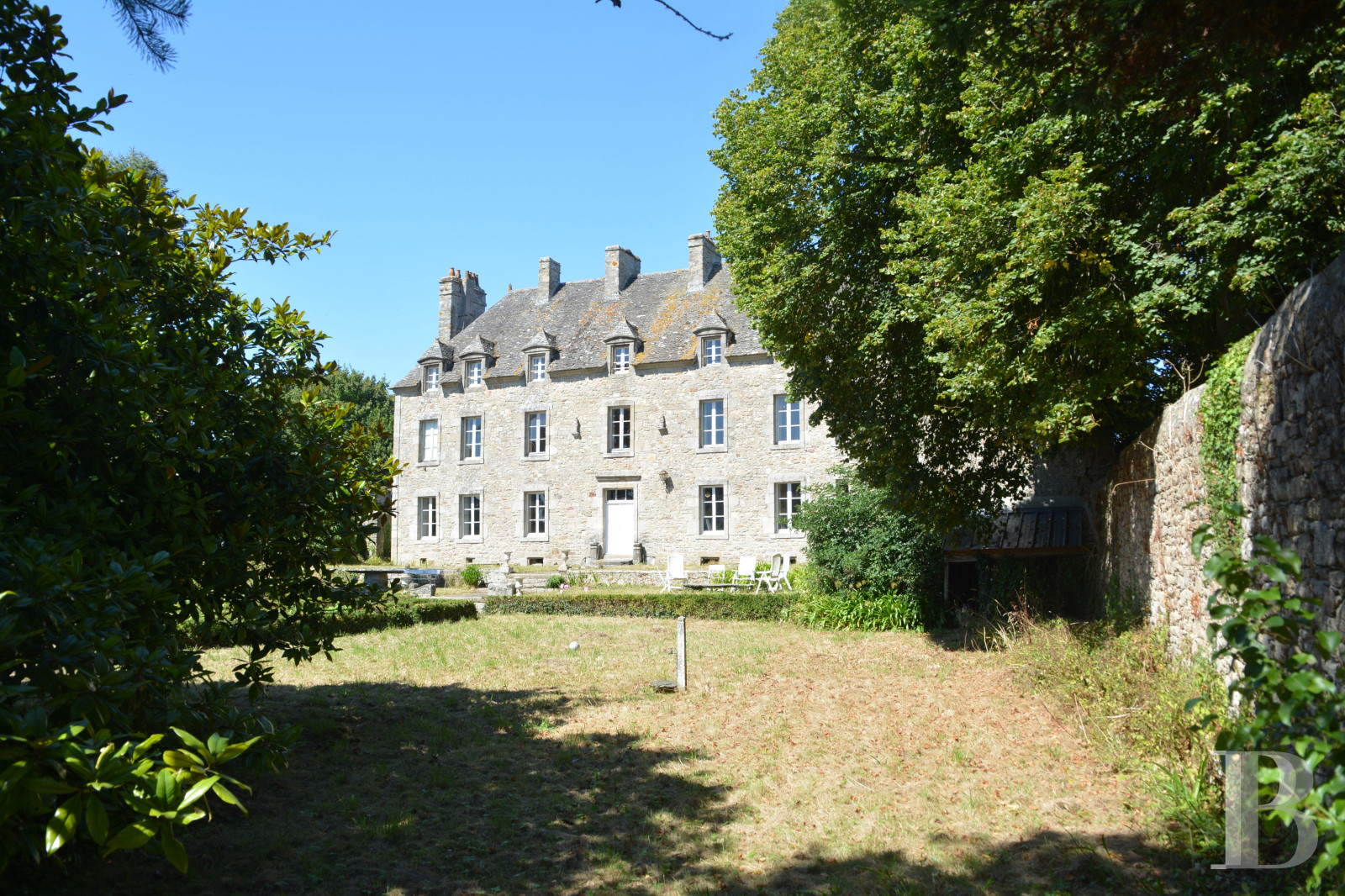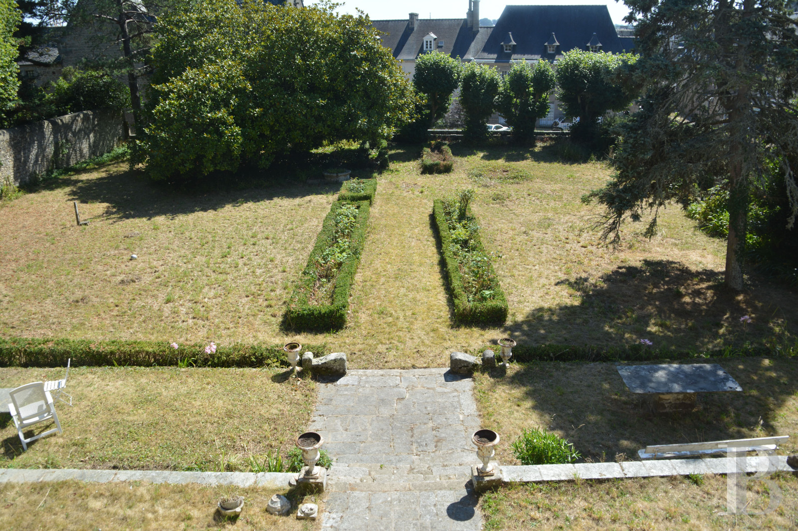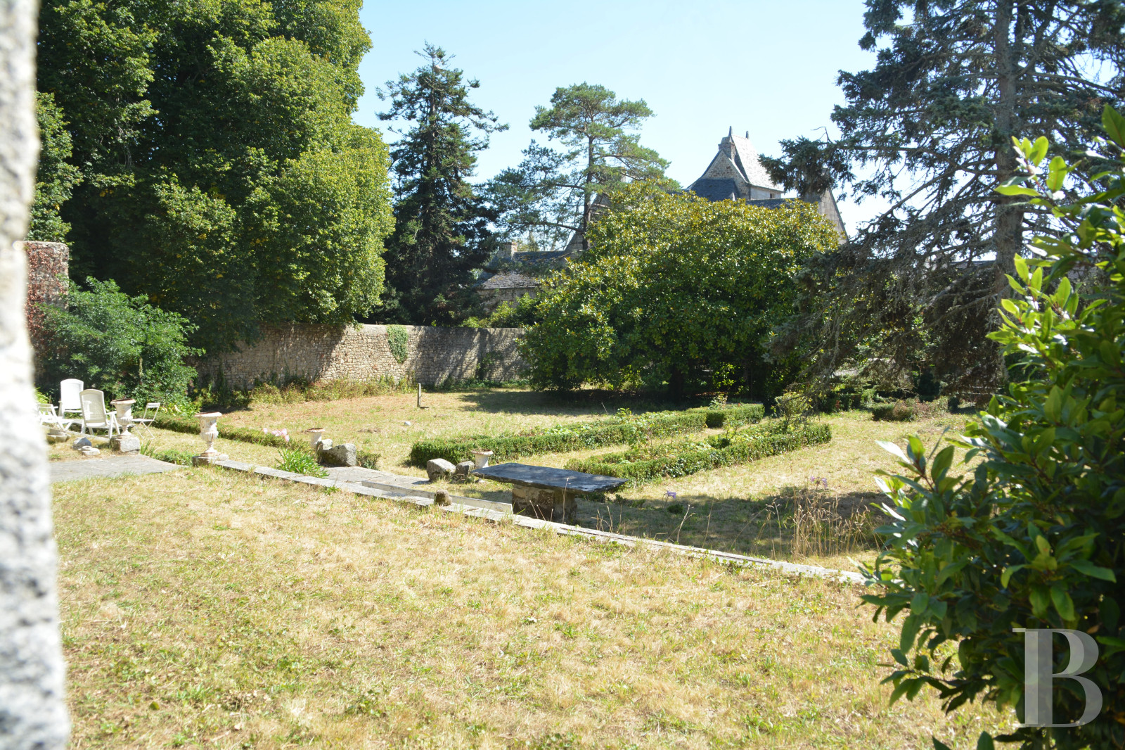 - 2,000 m² enclosed garden with French-style design, trees, and well