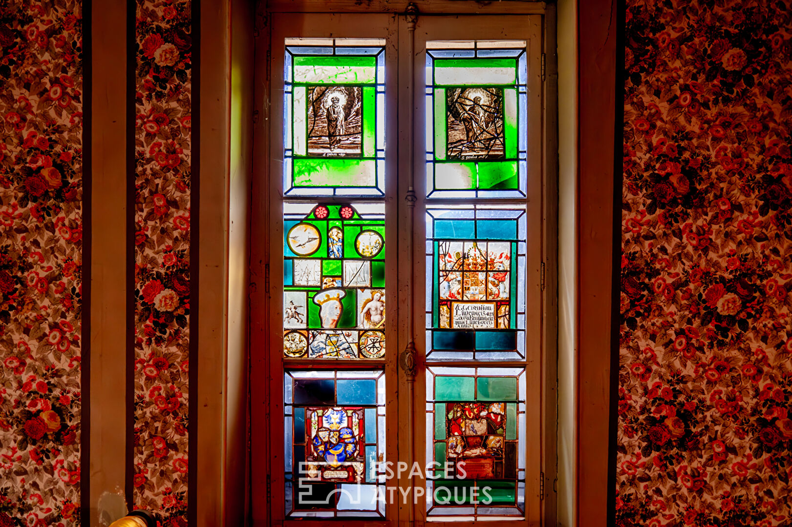- Burgundy stone fireplaces, stained glass, molded ceilings