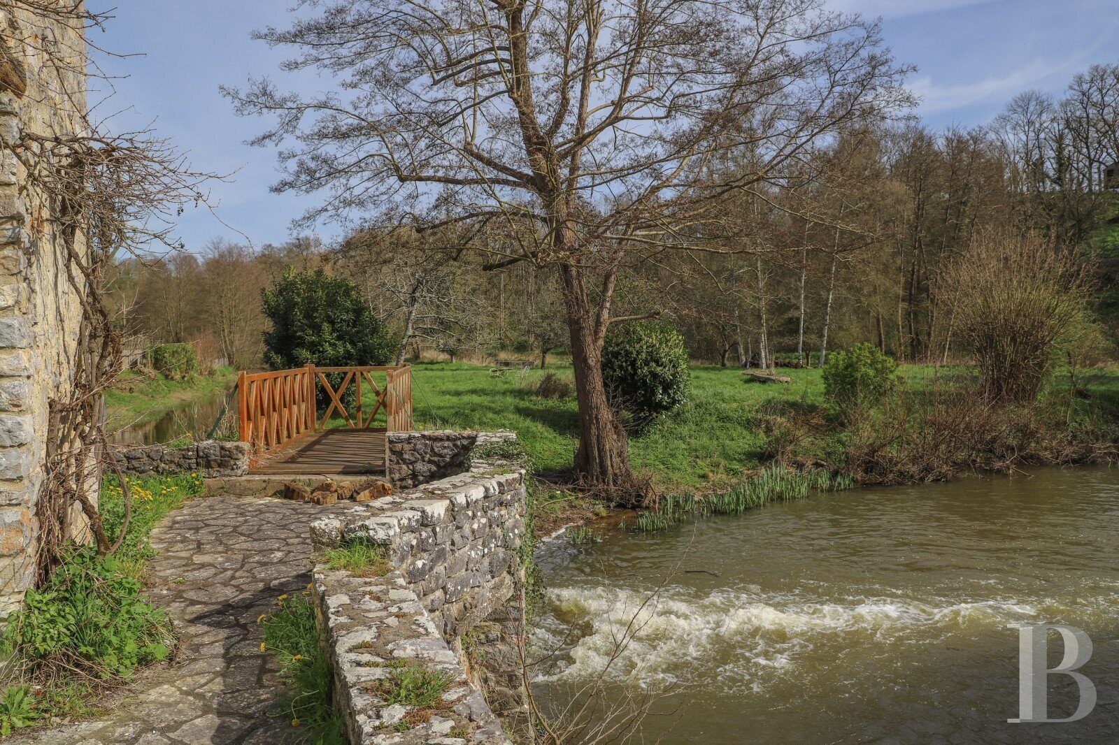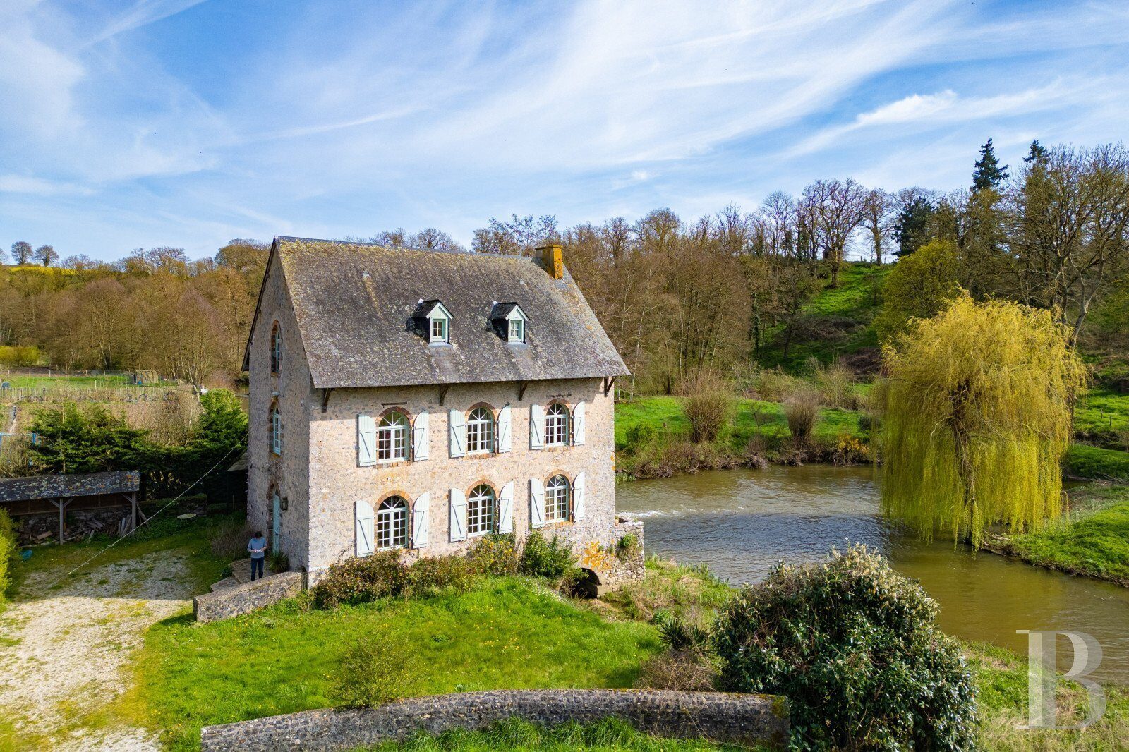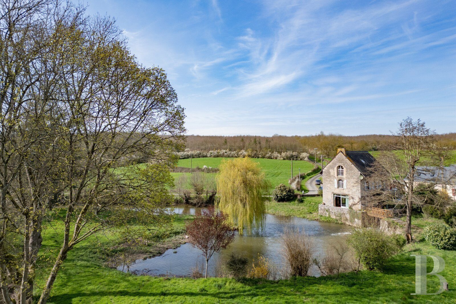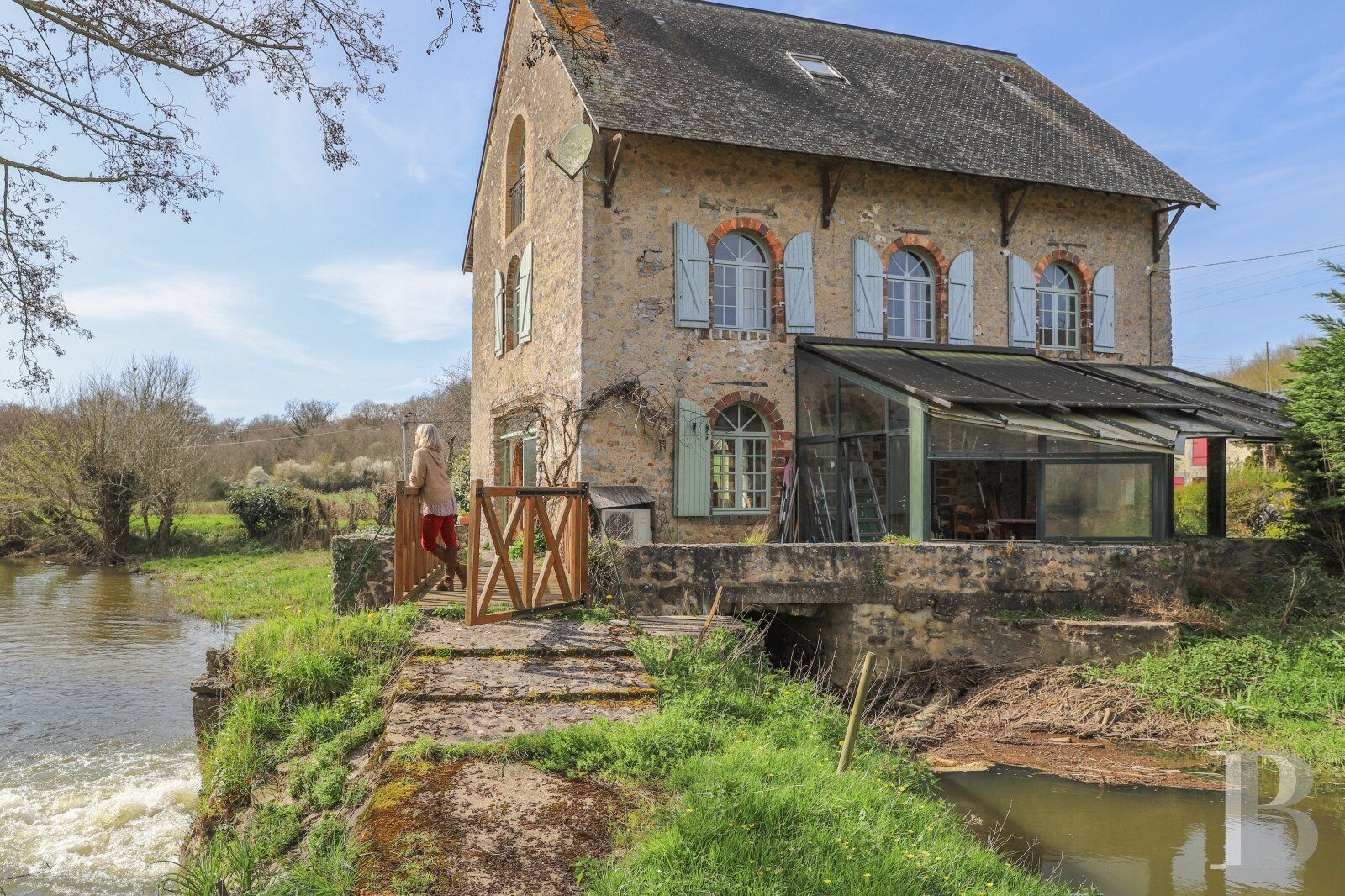 Stepping into the northern edge of Mayenne, this mid-19th century flour mill has been thoughtfully renovated into a striking home of character. The property stretches across gently rolling landscapes, overlooking the serene Erve valley and a small river that borders the estate.