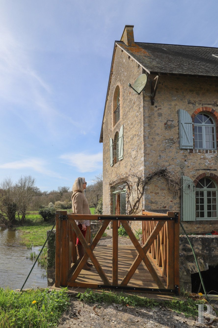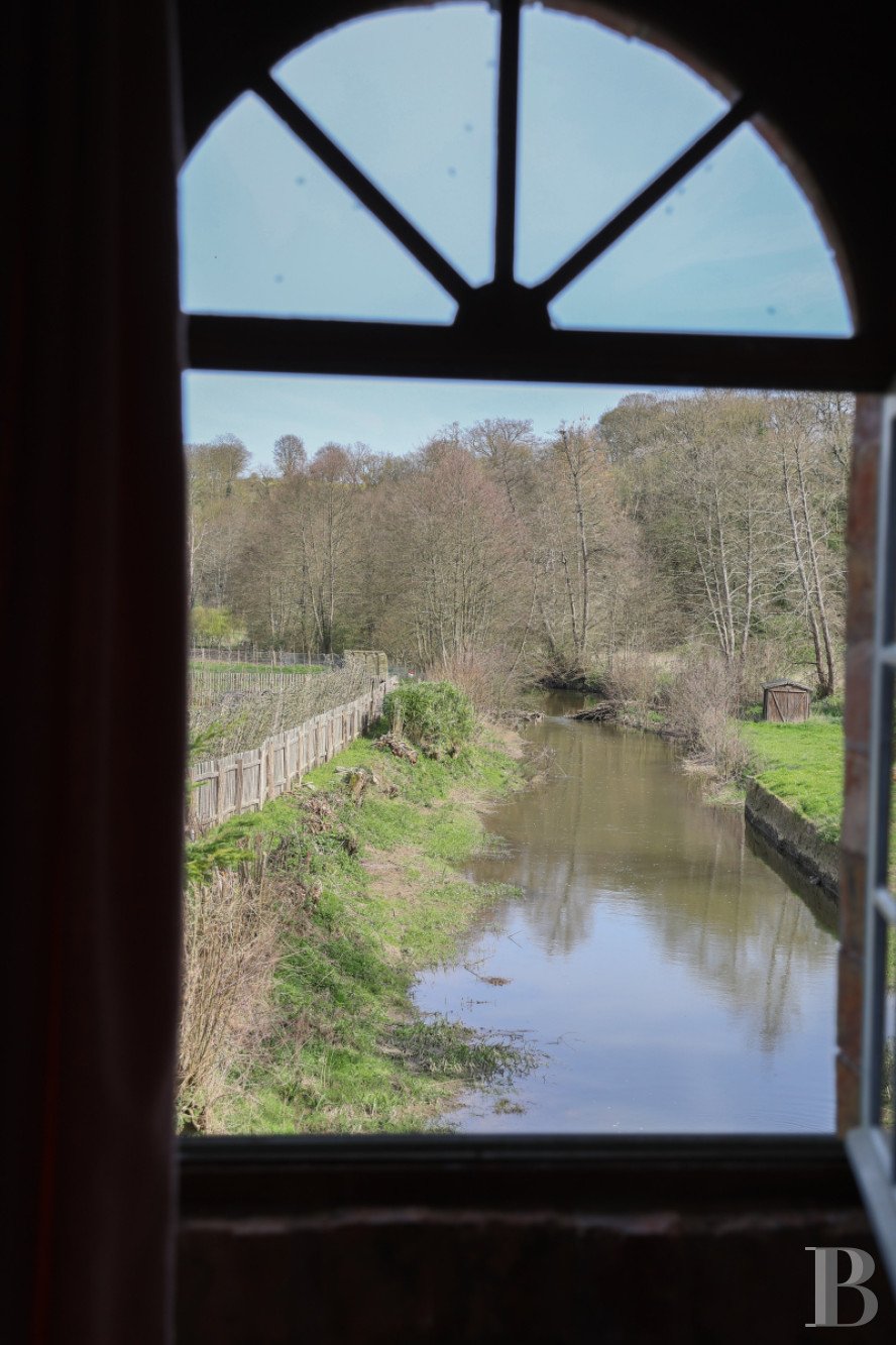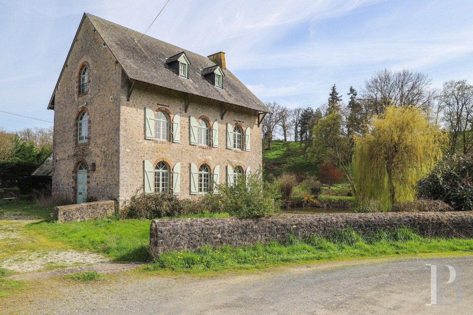 Stepping into the northern edge of Mayenne, this mid-19th century flour mill has been thoughtfully renovated into a striking home of character. The property stretches across gently rolling landscapes, overlooking the serene Erve valley and a small river that borders the estate.