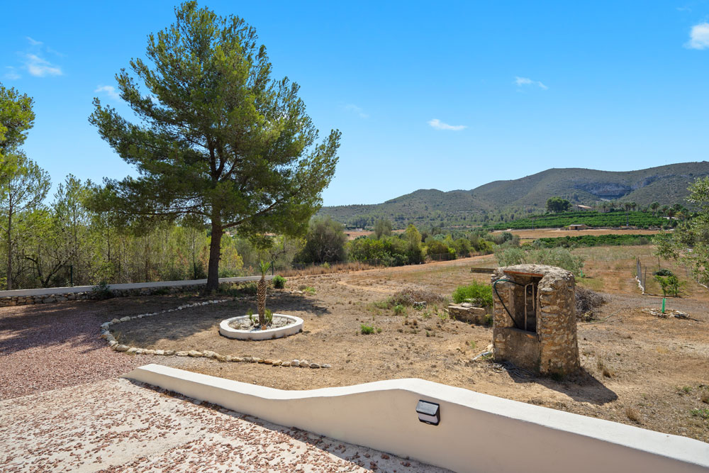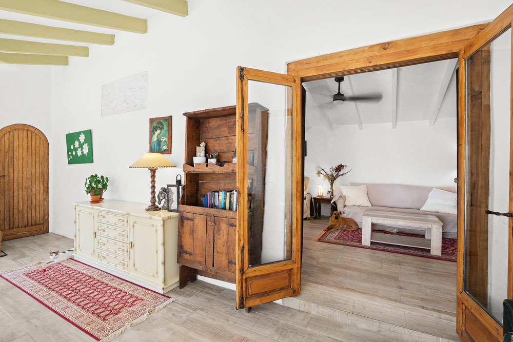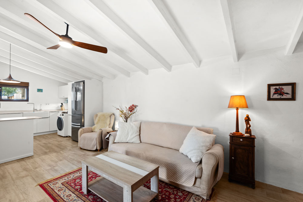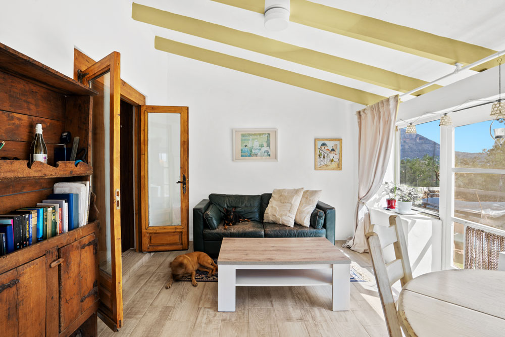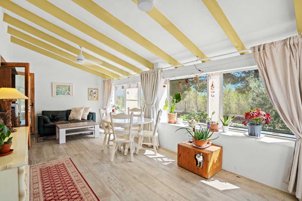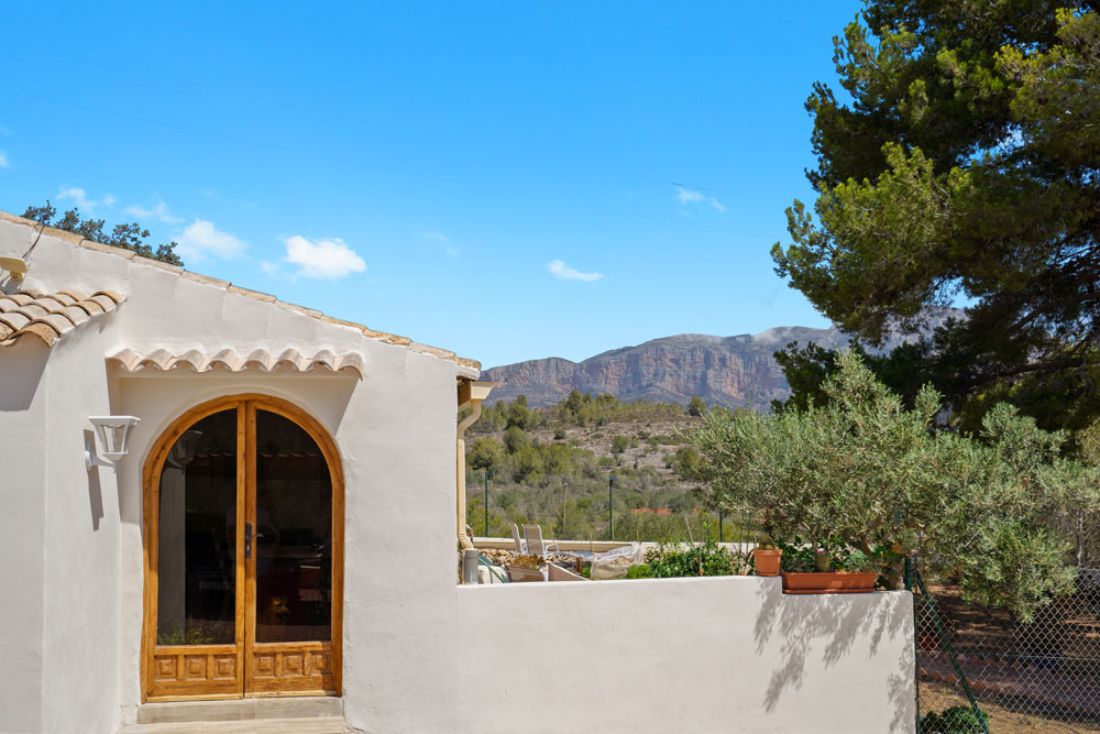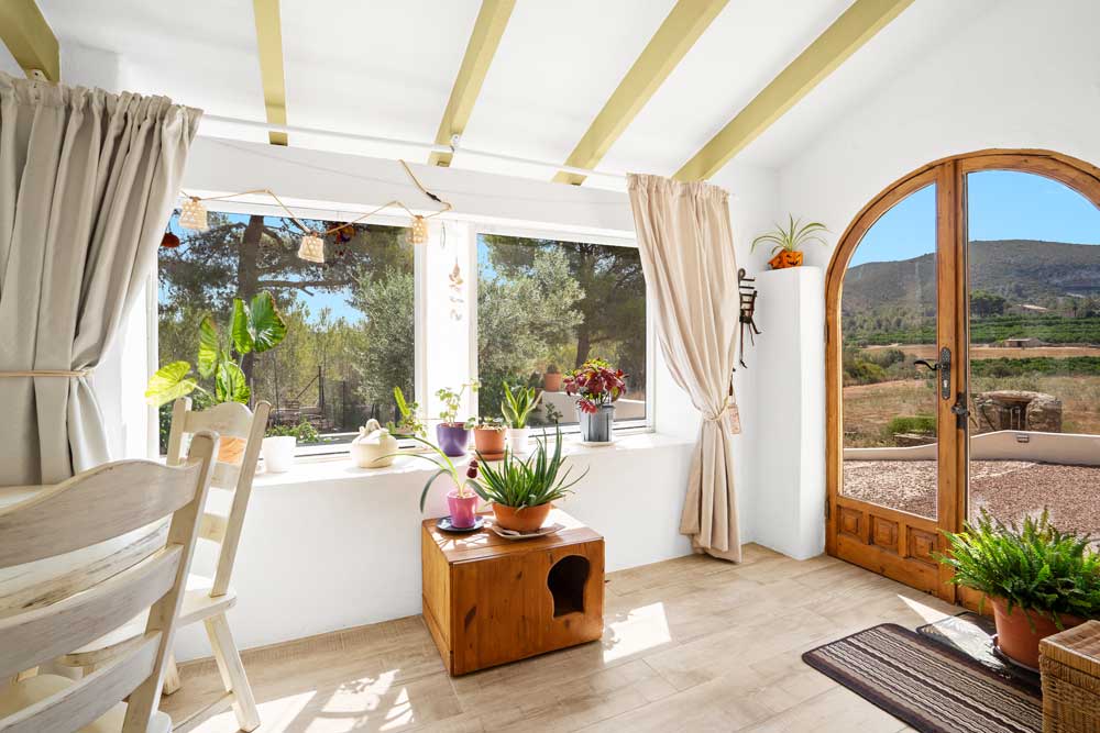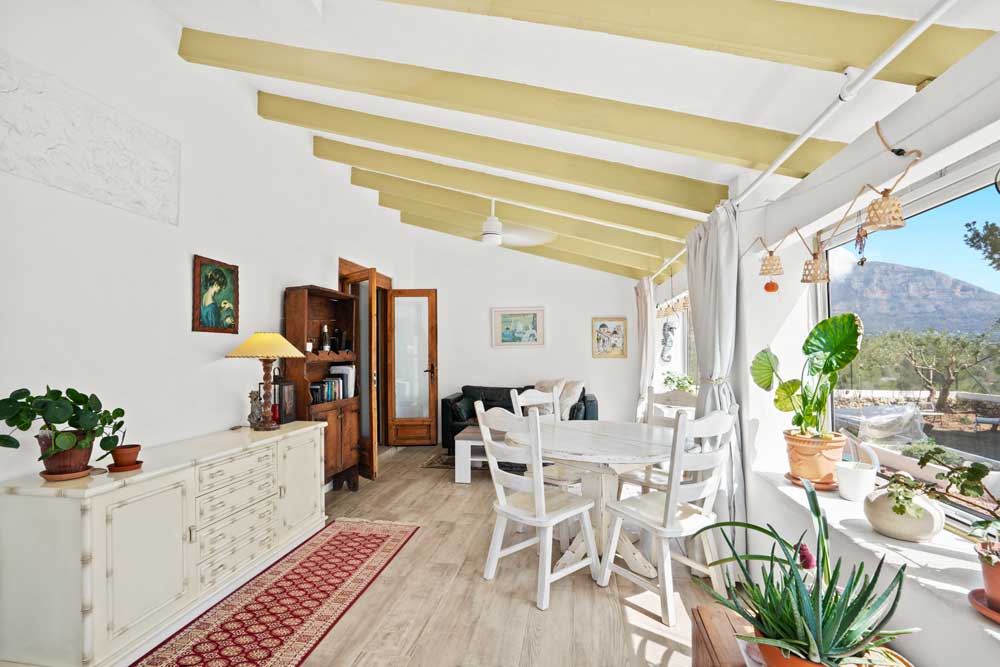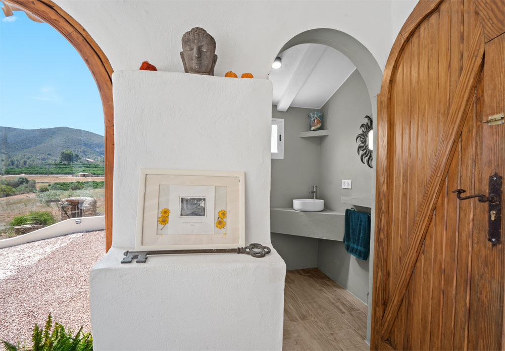 You enter the home through a generous porch that functions beautifully as an outdoor living room. From here, you can enjoy views of the garden as well as a glimpse of Montgó mountain. A guest toilet is also located in this space. Meanwhile, at the back, the home opens onto a quiet rural road with very little traffic—perfect for those seeking peace.