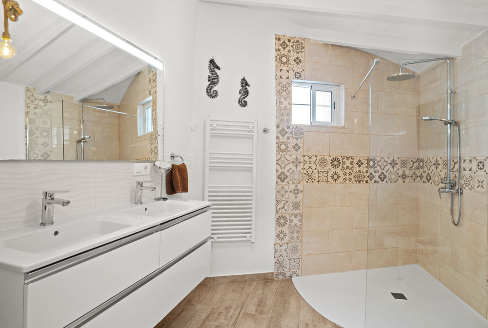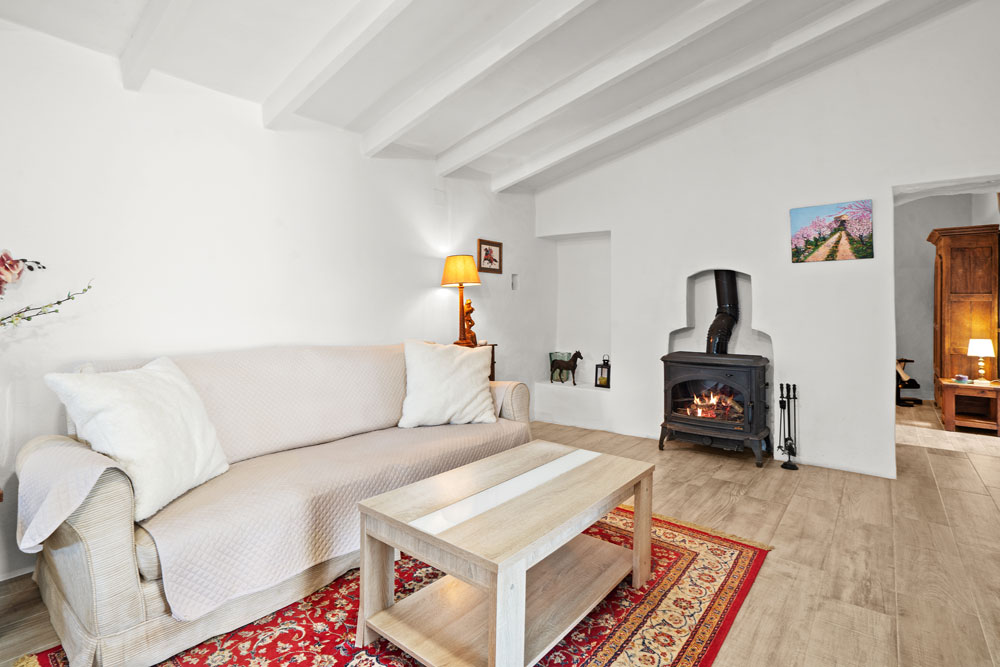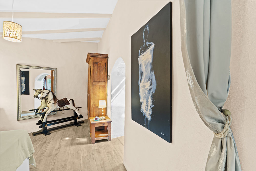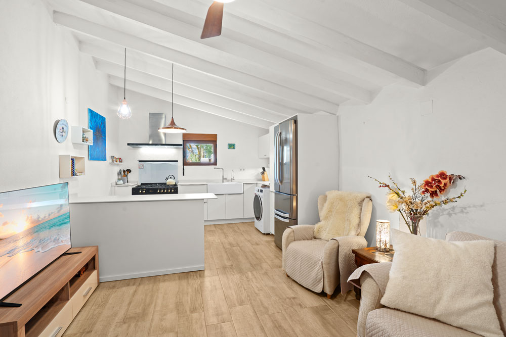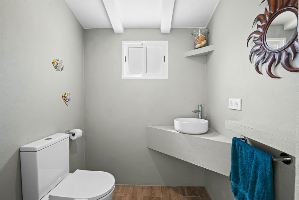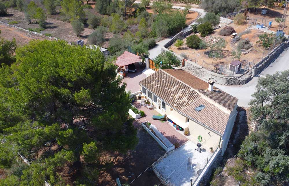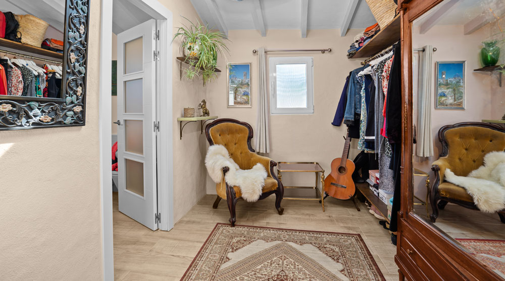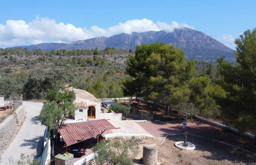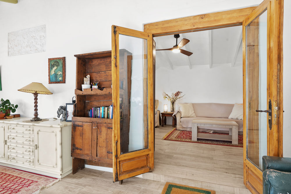 You enter the home through a generous porch that functions beautifully as an outdoor living room. From here, you can enjoy views of the garden as well as a glimpse of Montgó mountain. A guest toilet is also located in this space. Meanwhile, at the back, the home opens onto a quiet rural road with very little traffic—perfect for those seeking peace.
