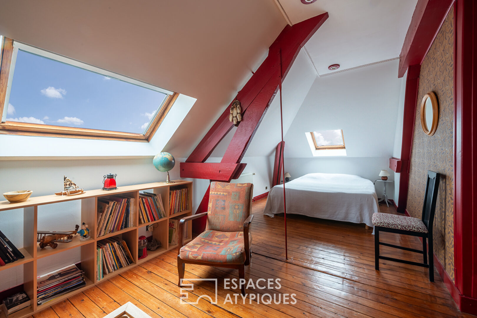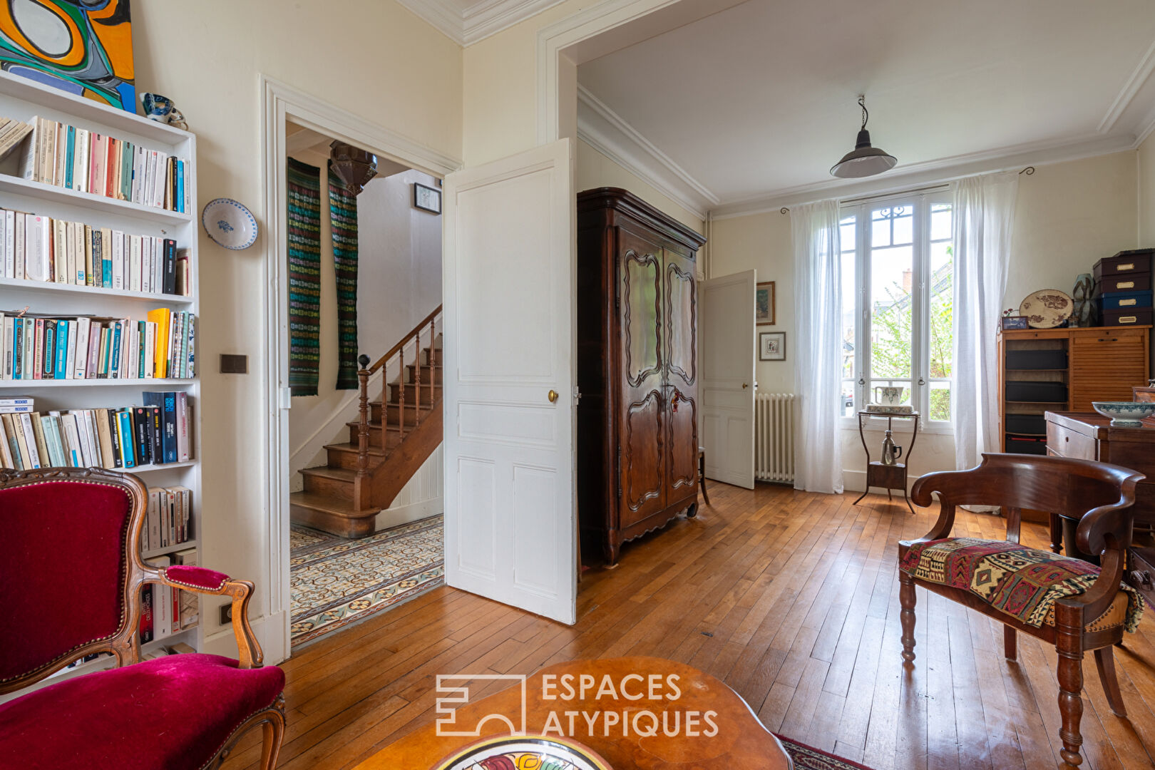 With its overhanging roof, decorative brickwork, and original cement tiles, the home radiates character. Inside, high ceilings, large windows, and a central hallway create a sense of brightness and flow.