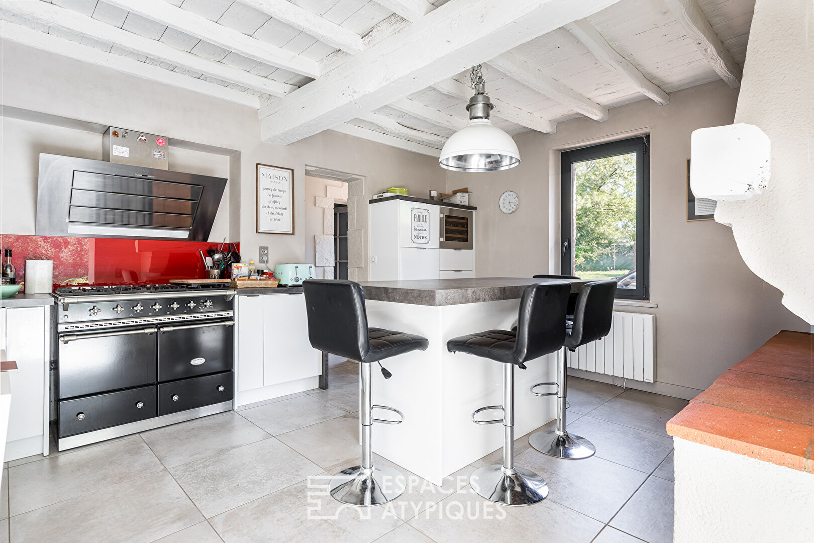 Next, the kitchen blends rustic charm with modern design. It includes a period fireplace, whitewashed beams, a central island, and updated appliances. Altogether, it’s the perfect space for cooking, gathering, and enjoying daily life.