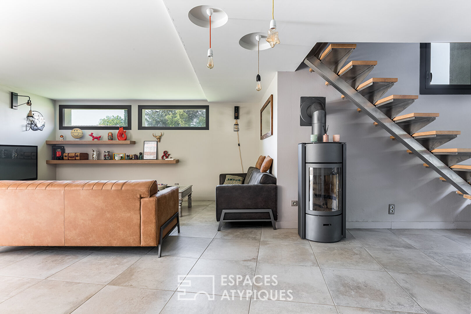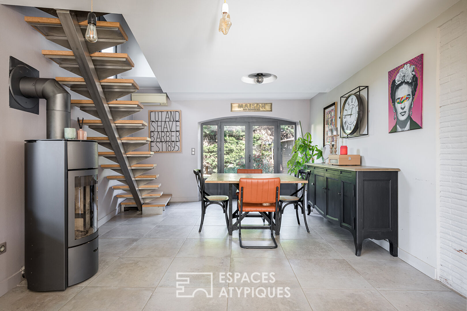 Right from the entrance, the home feels warm and inviting. The living room features a sleek wood stove and a striking metal-wood staircase. Large windows let in abundant light, creating a bright and cozy atmosphere.