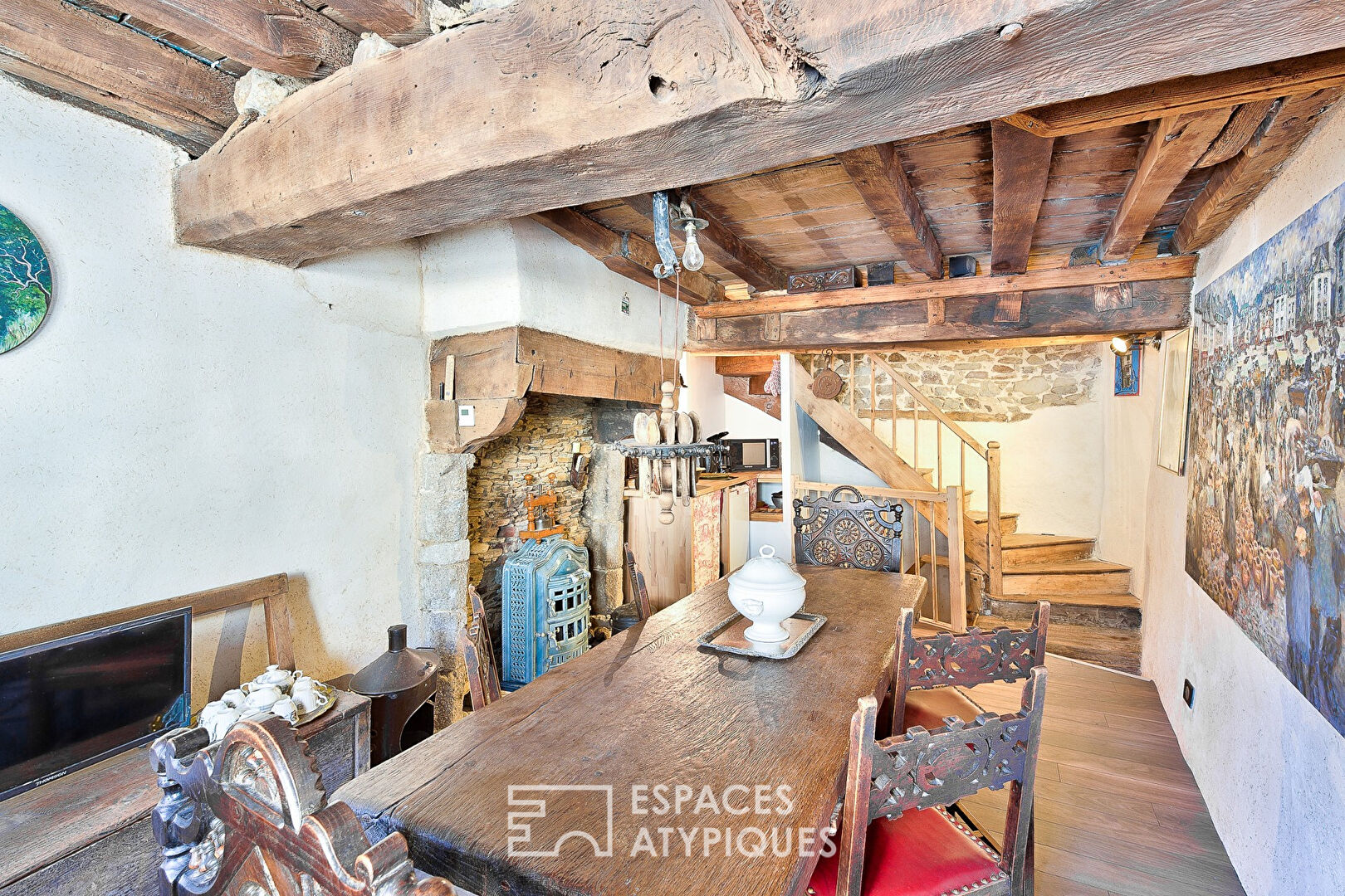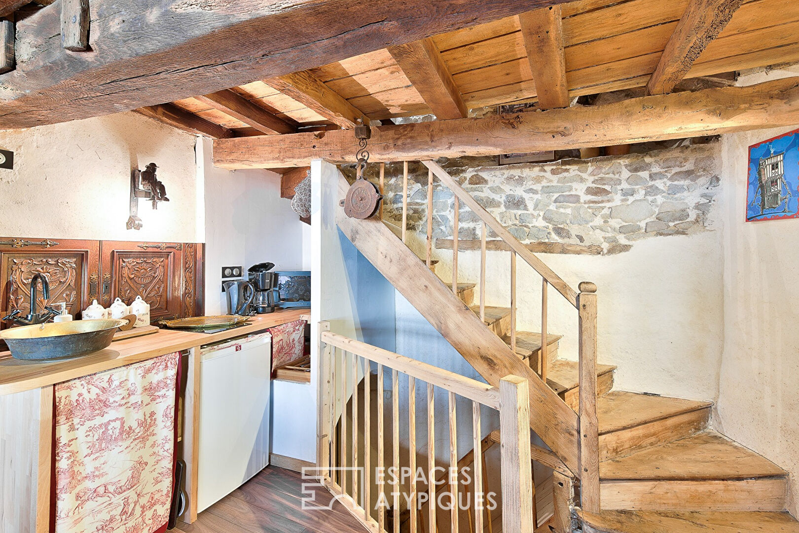 Inside, a winding staircase reveals cozy rooms full of charm. Exposed beams, stone details, and period features create a unique and inviting atmosphere.