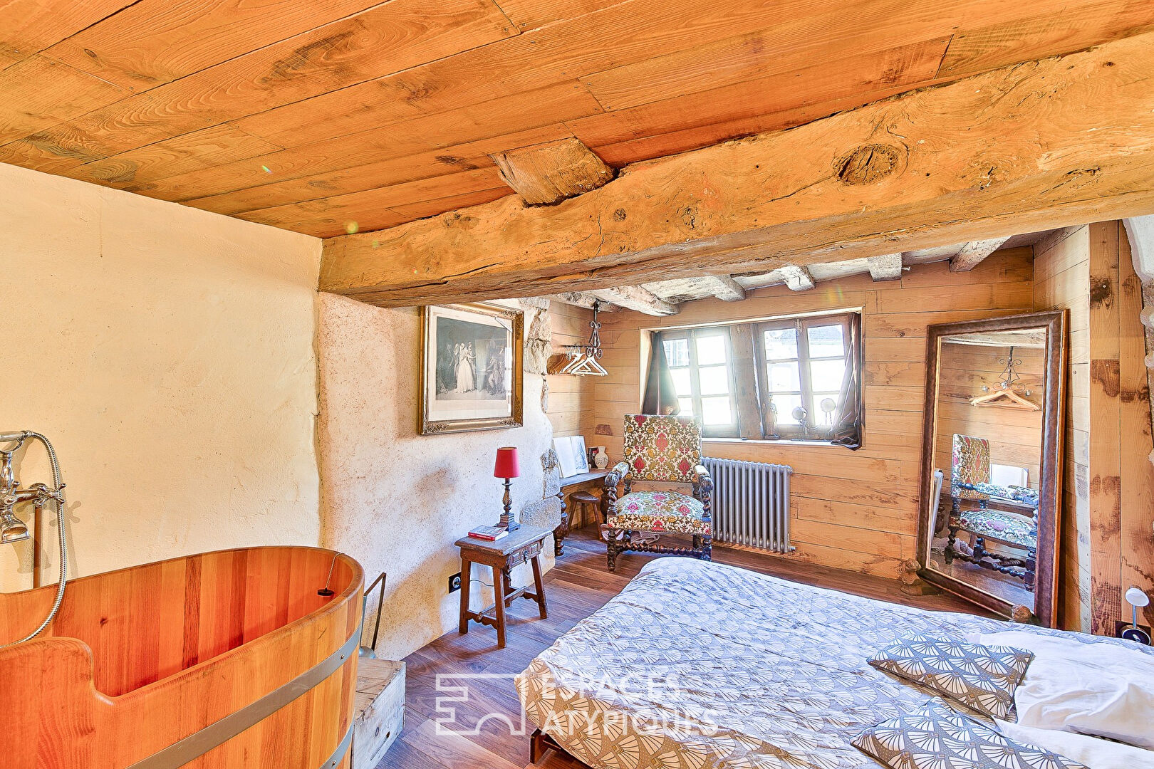- Wooden soaking tub in the main suite
