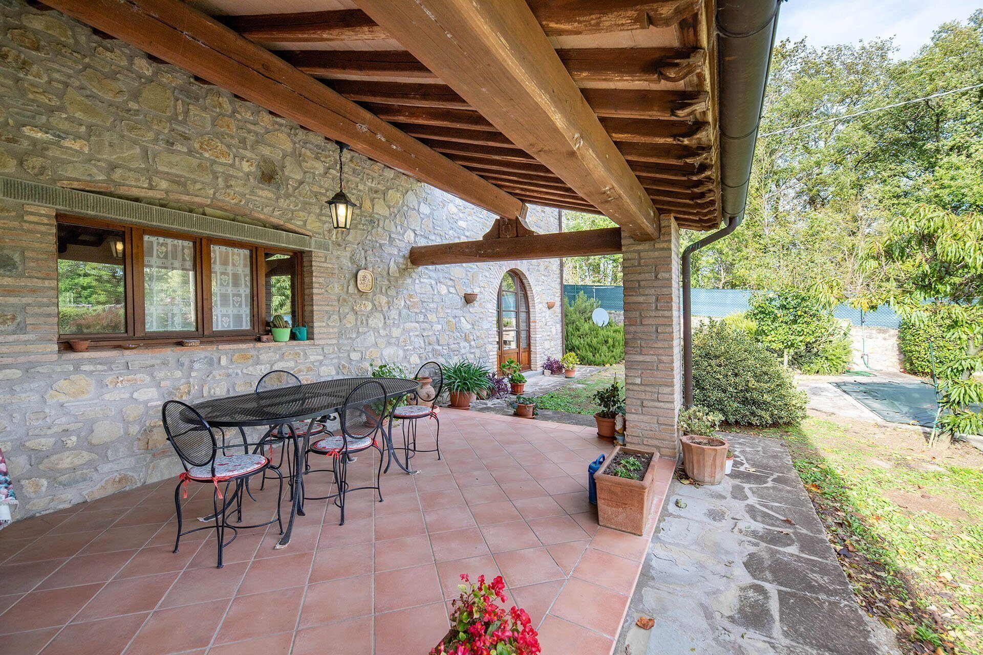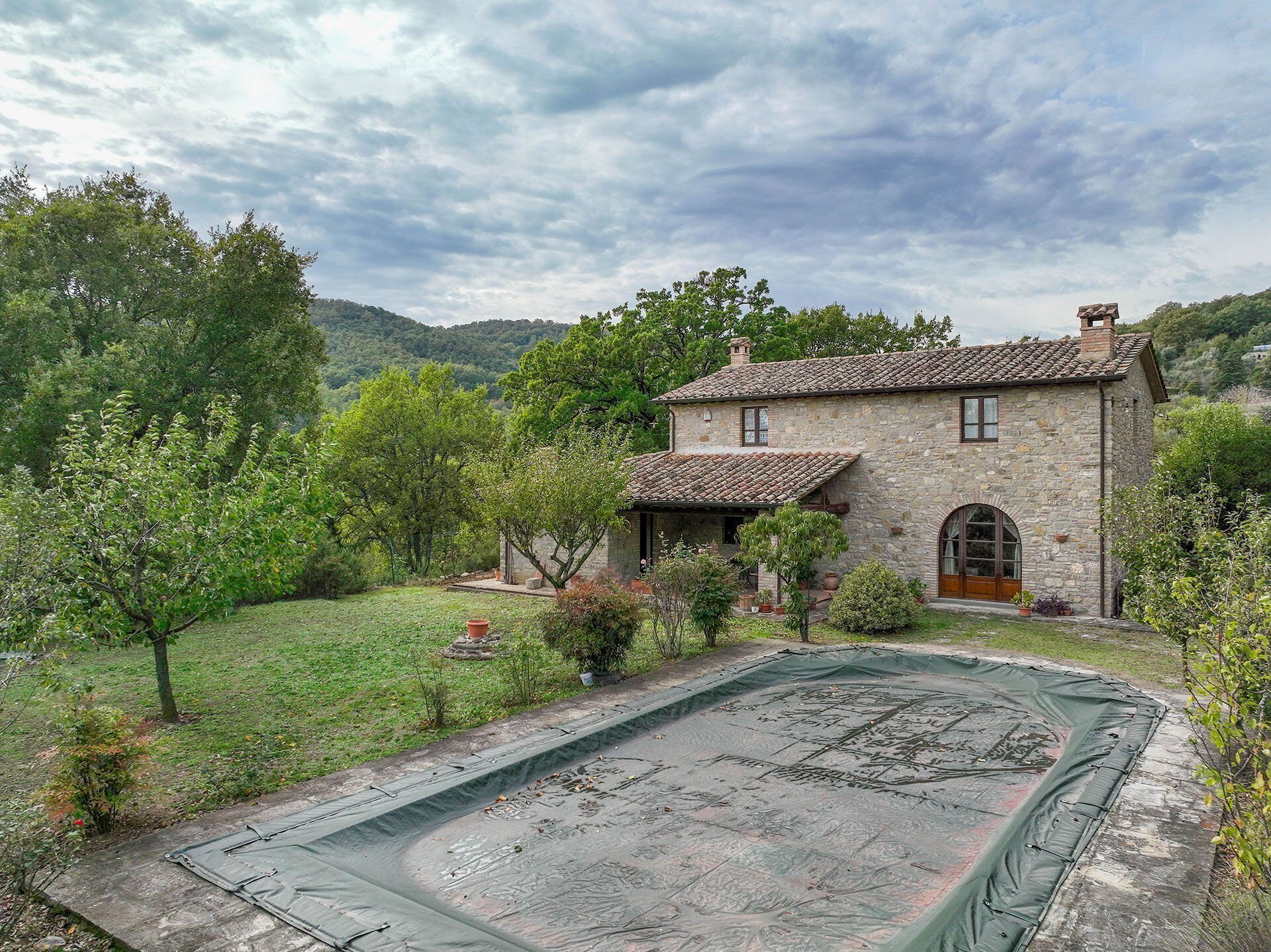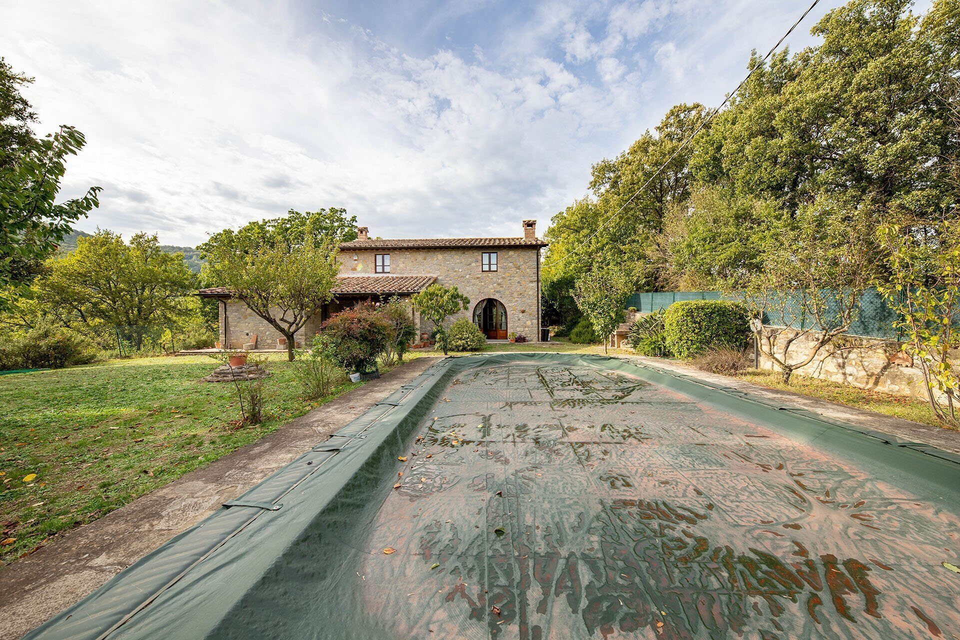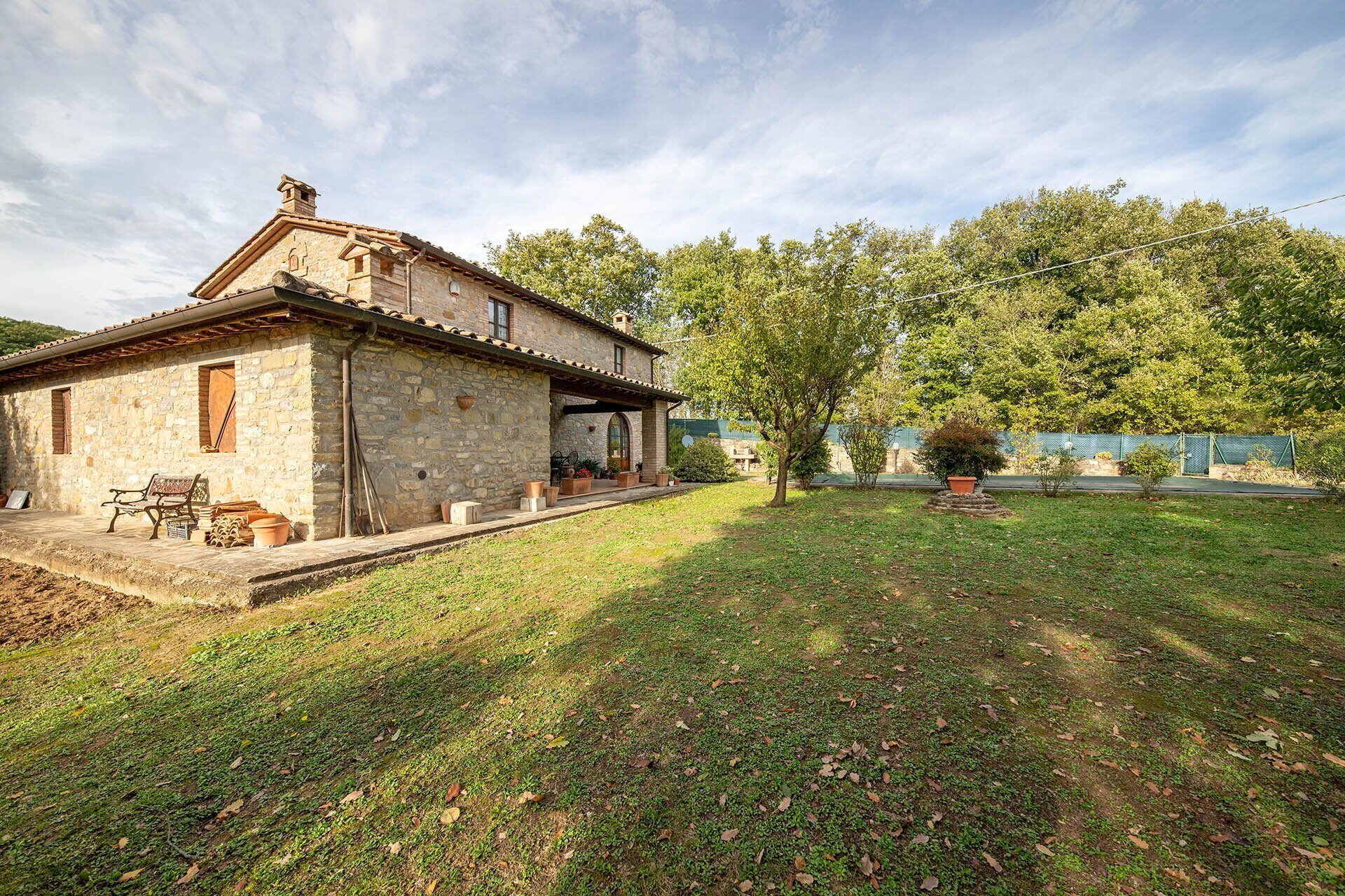 Outside, the fenced garden, mature trees, and private pool form a relaxing retreat, while proximity to Tuscany and major airports keeps travel easy.