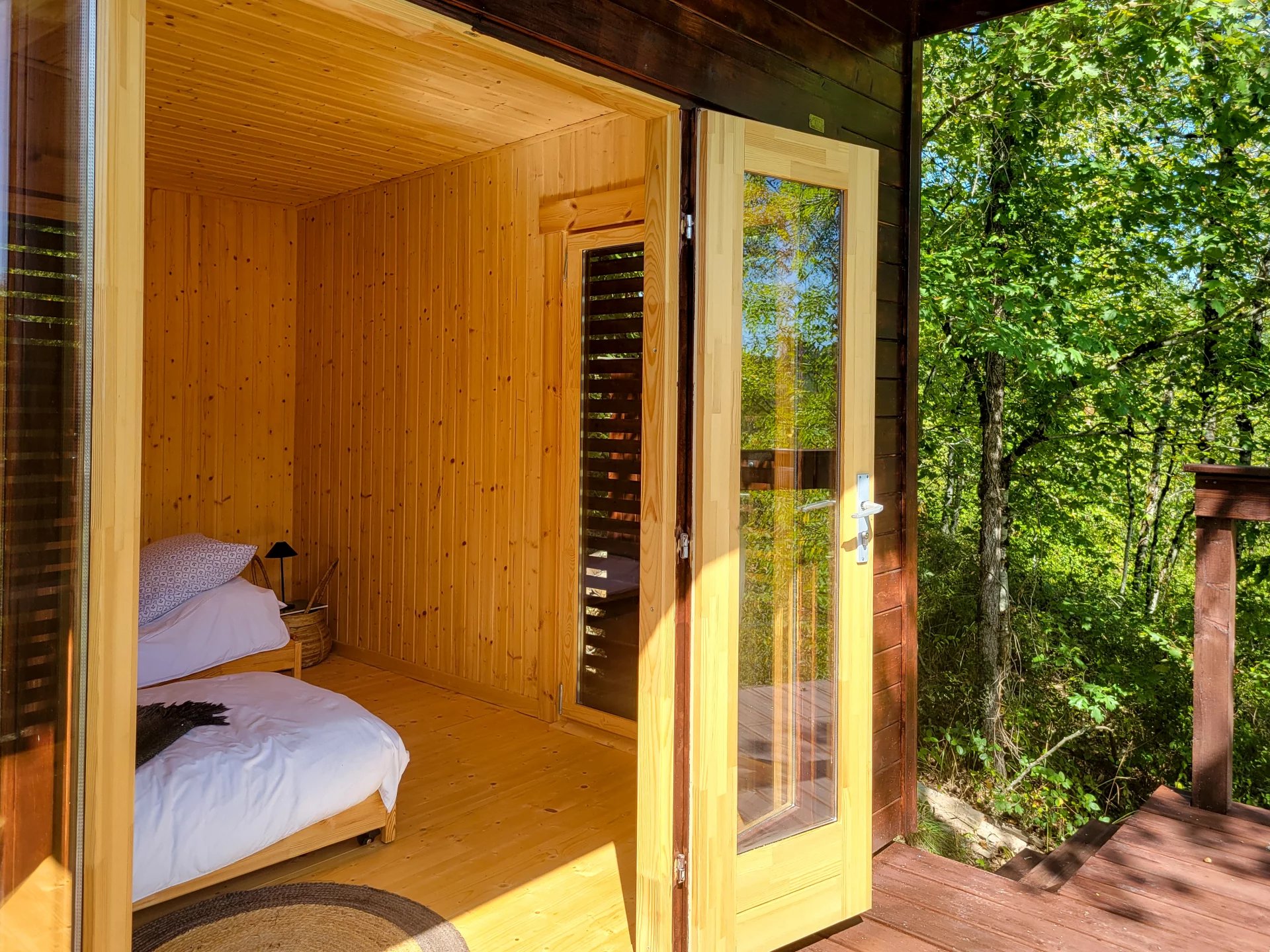 The newly built forest cabin offers a unique escape above the pool—ideal for guests or creative space.