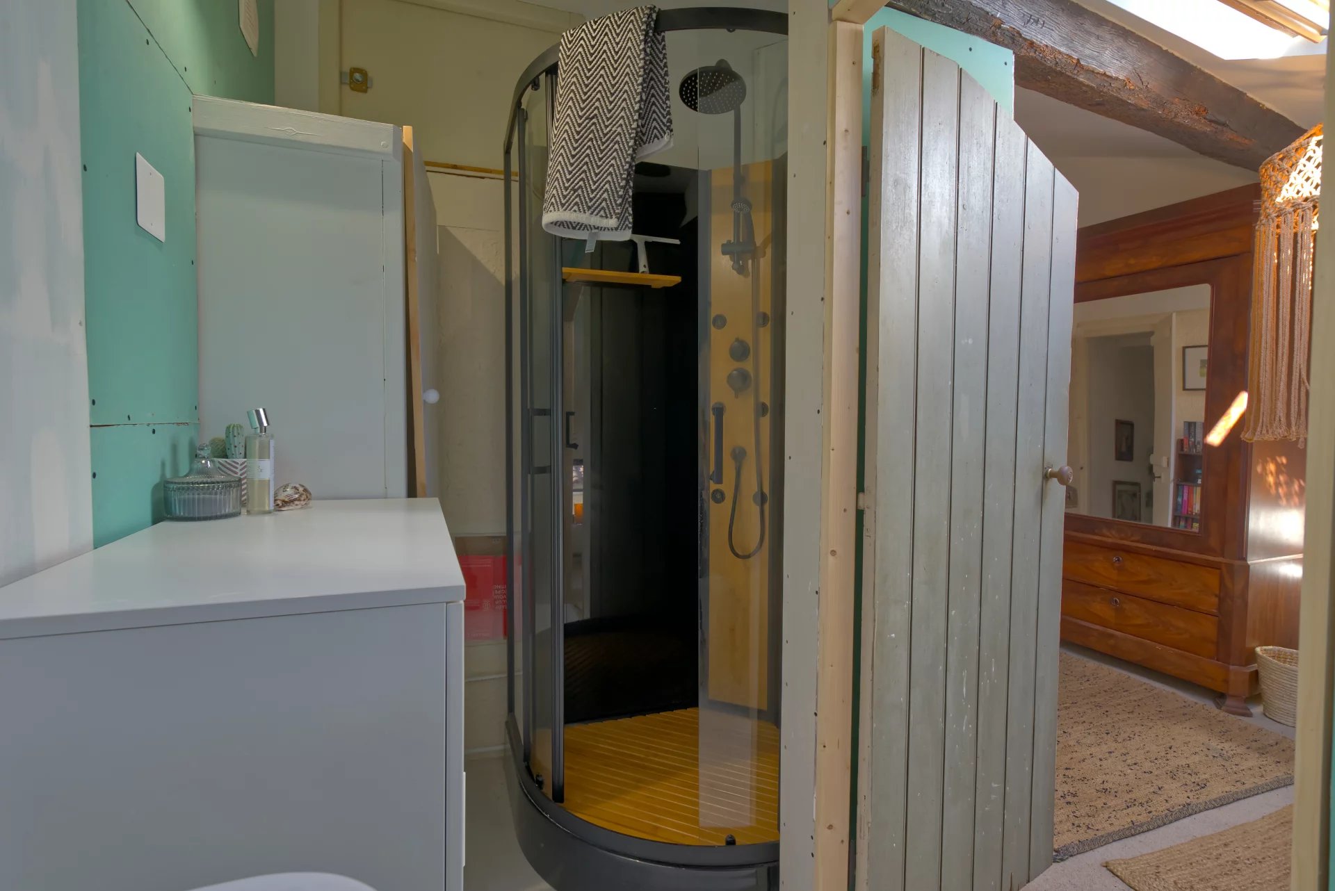 Inside, the living, dining, and kitchen area includes a cosy wood-burning stove. The first floor has a double bedroom and spacious bathroom with laundry. The top floor offers a second double bedroom with en suite shower and a smaller third bedroom or office with dressing room.