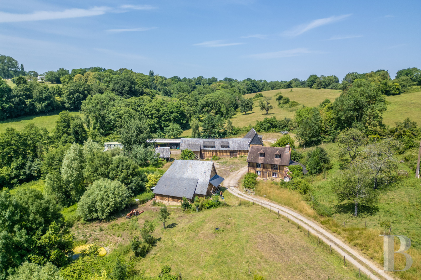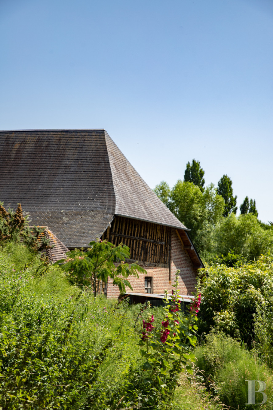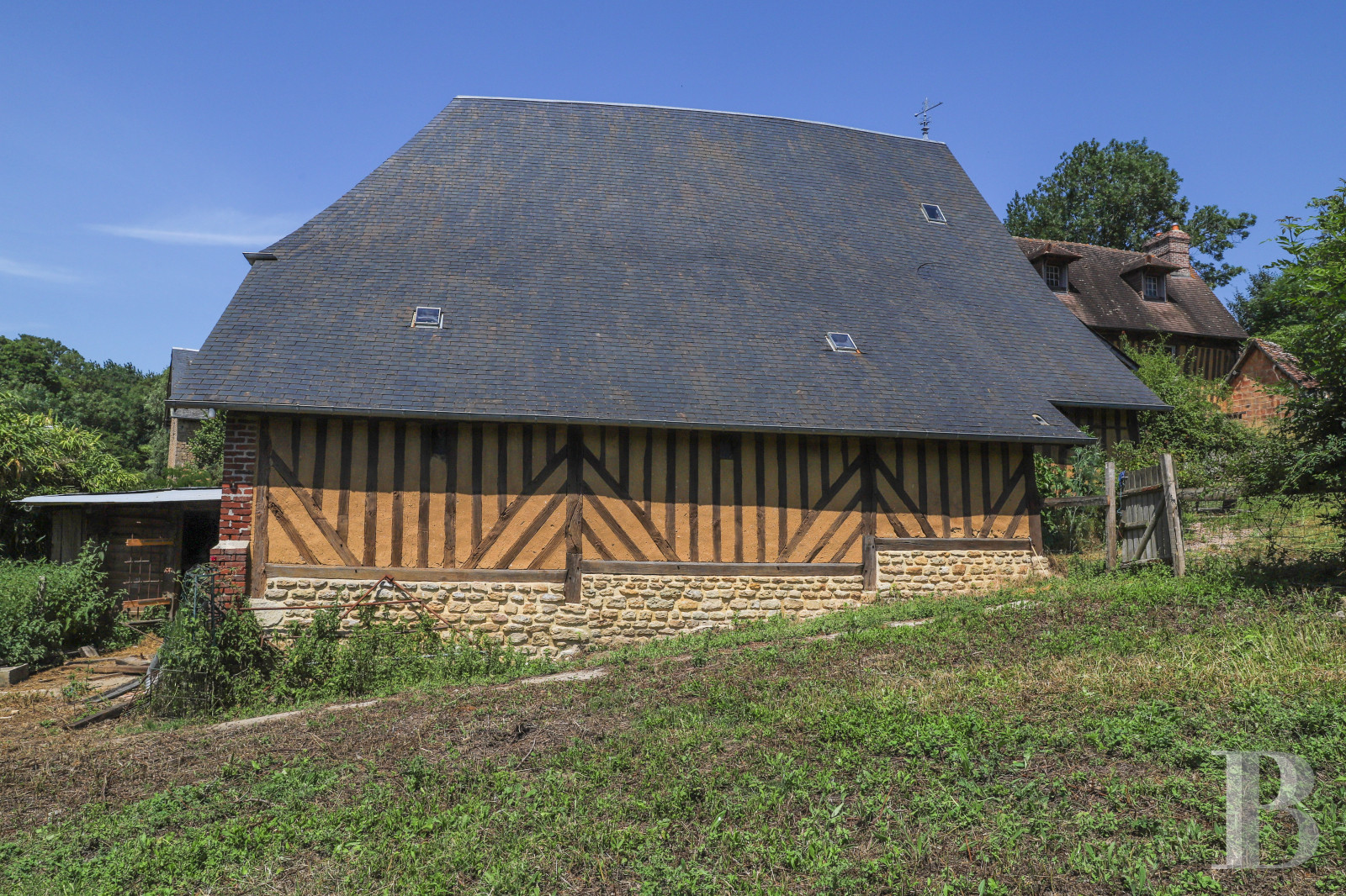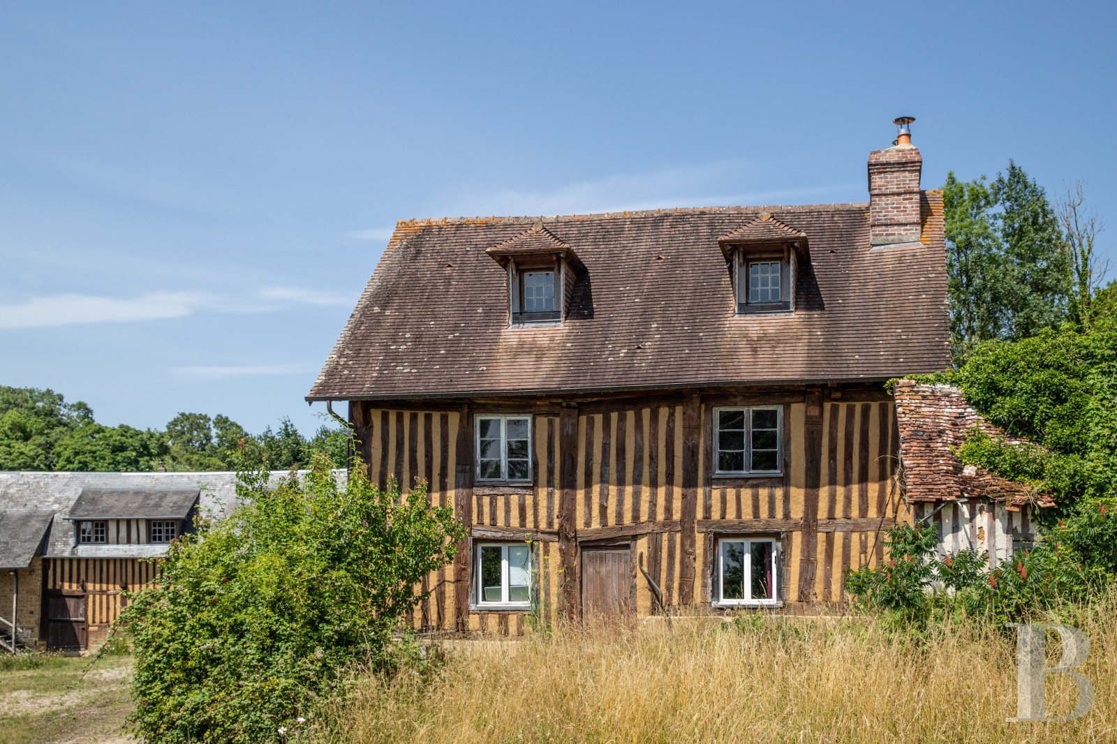 Approached by a long path, the estate unfolds around a central courtyard. The main house, with its half-timbering and stone gable, is complemented by a large barn, an old farmhouse, and smaller outbuildings. Each structure reflects the region’s enduring rural architecture.