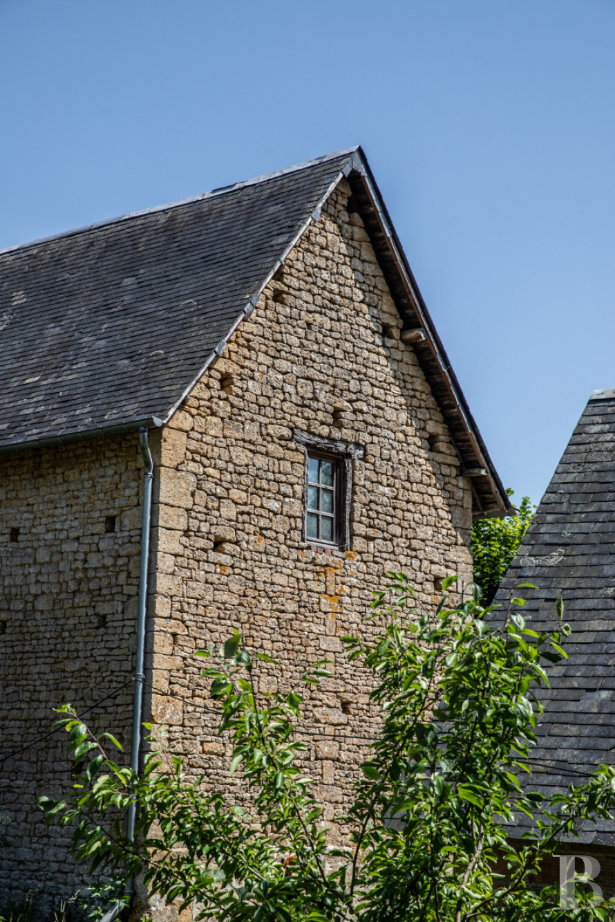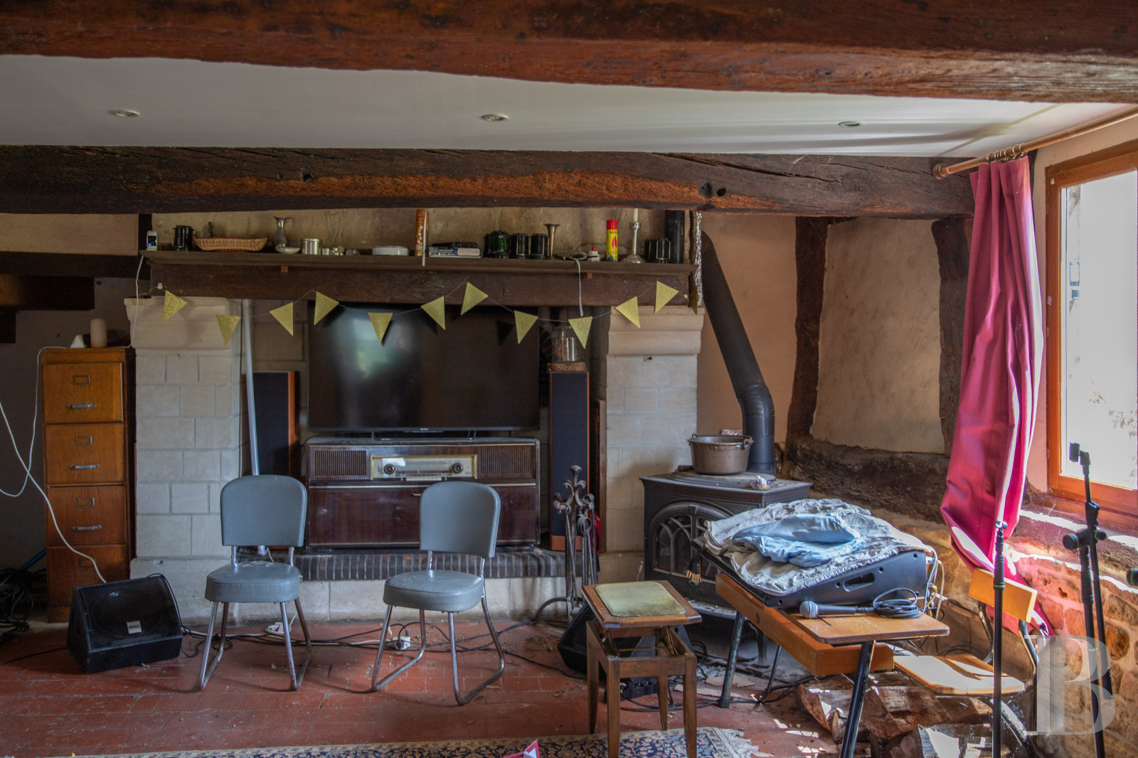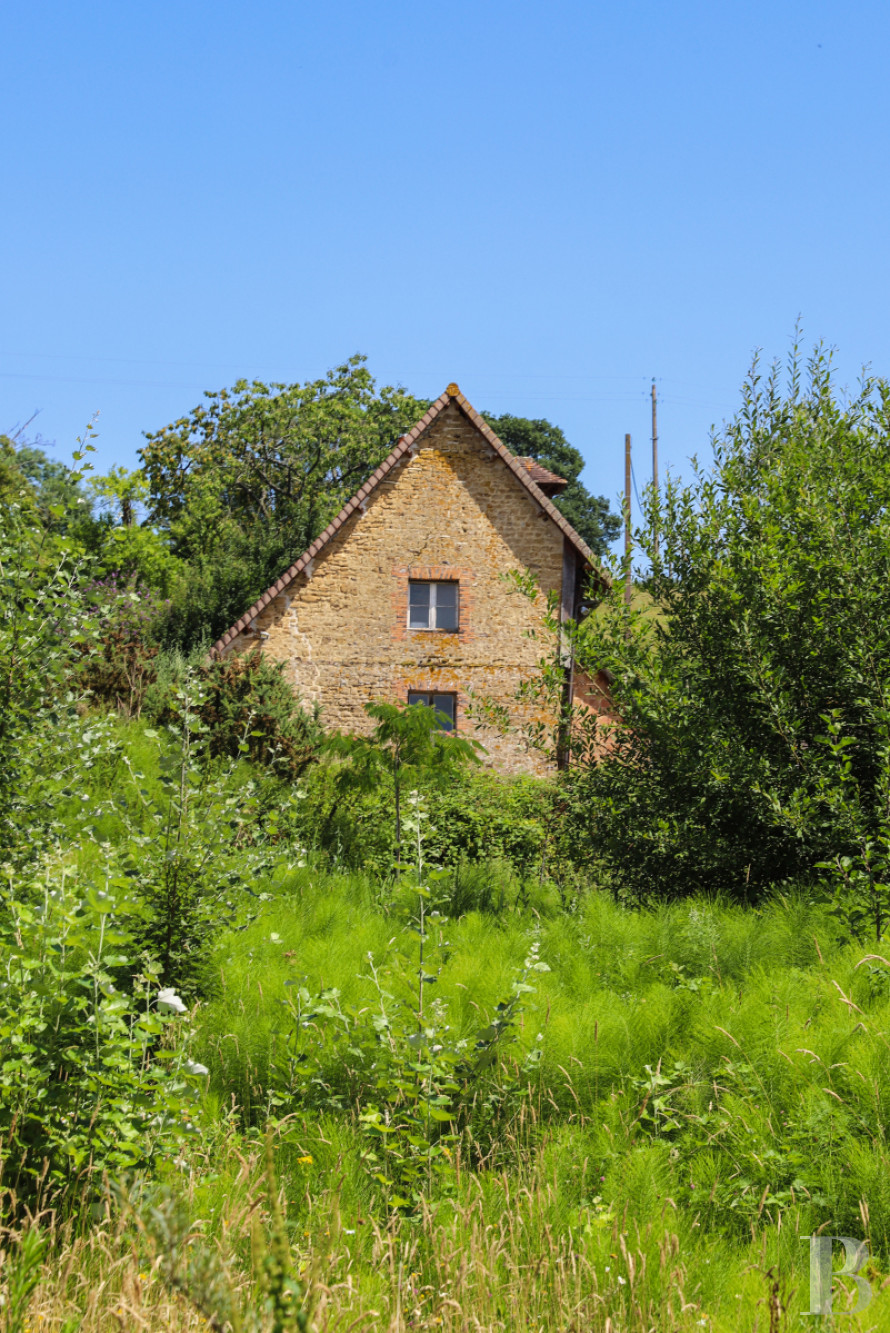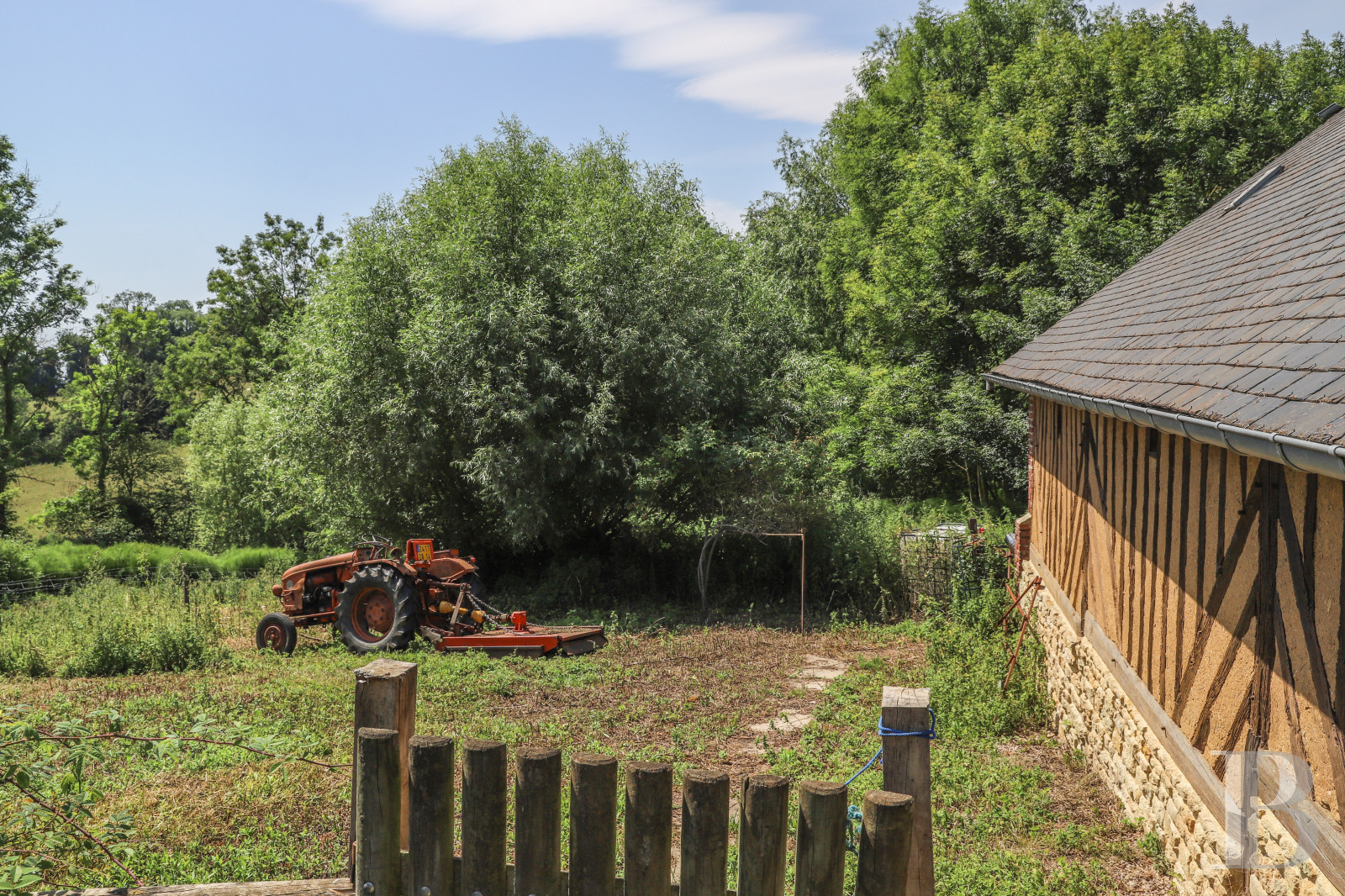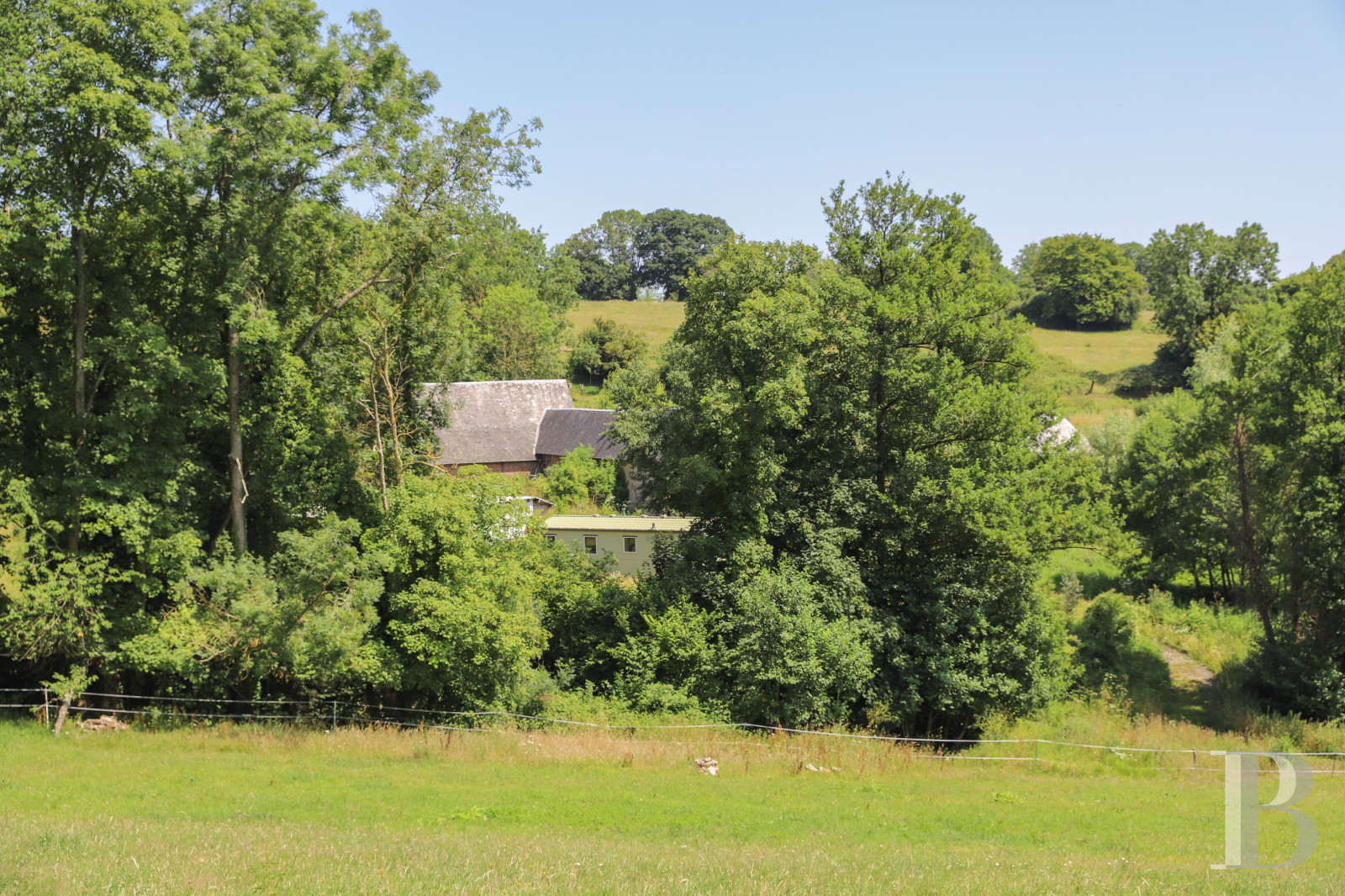 Approached by a long path, the estate unfolds around a central courtyard. The main house, with its half-timbering and stone gable, is complemented by a large barn, an old farmhouse, and smaller outbuildings. Each structure reflects the region’s enduring rural architecture.