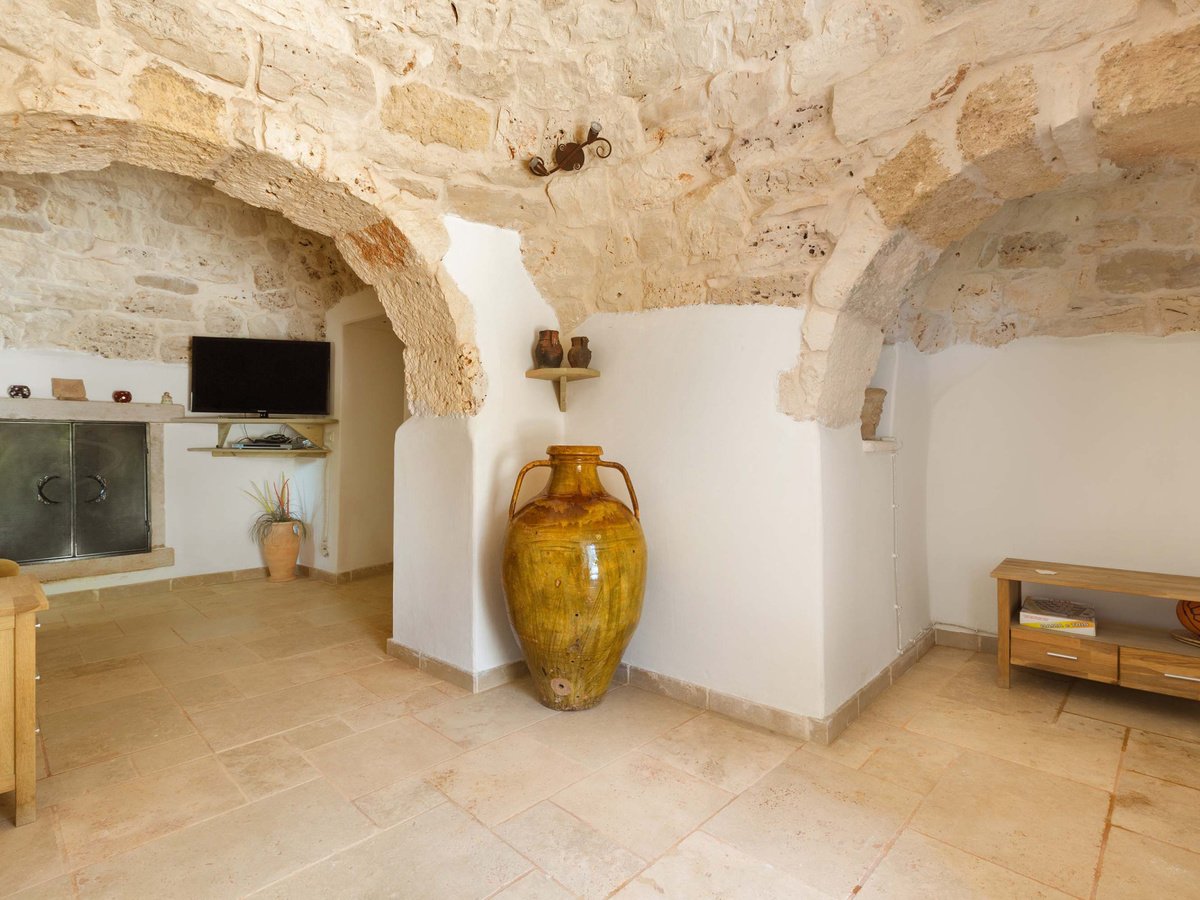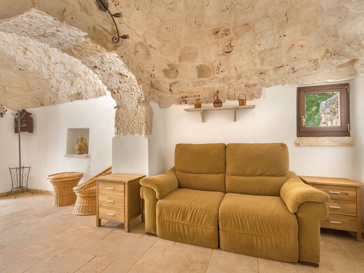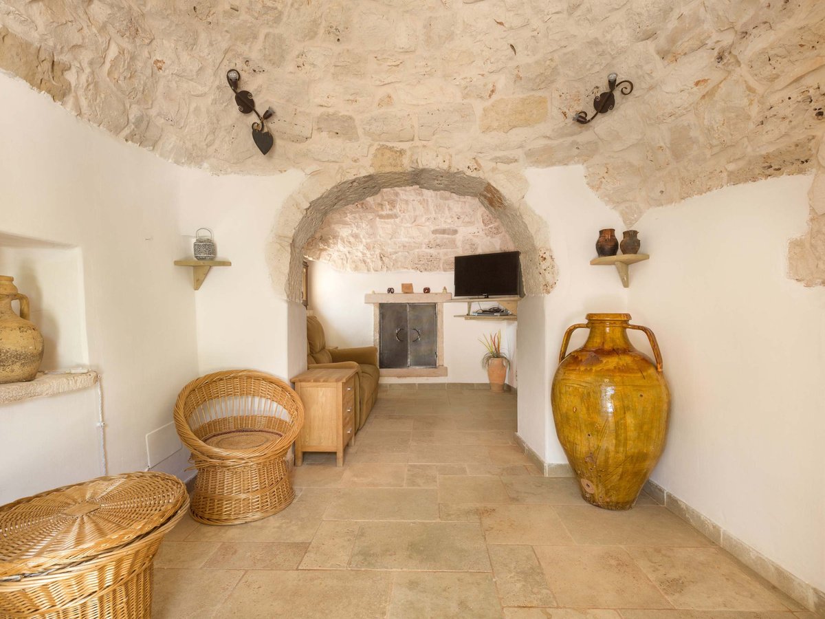 The home features classic trullo cones and a bright, functional layout. Inside, you’ll find a cozy sitting area, a well-equipped kitchen, three bedrooms (two in the trullo, one in the lamia), and two bathrooms. The kitchen opens onto a shaded veranda—perfect for easy indoor-outdoor living.