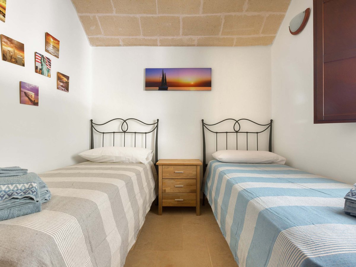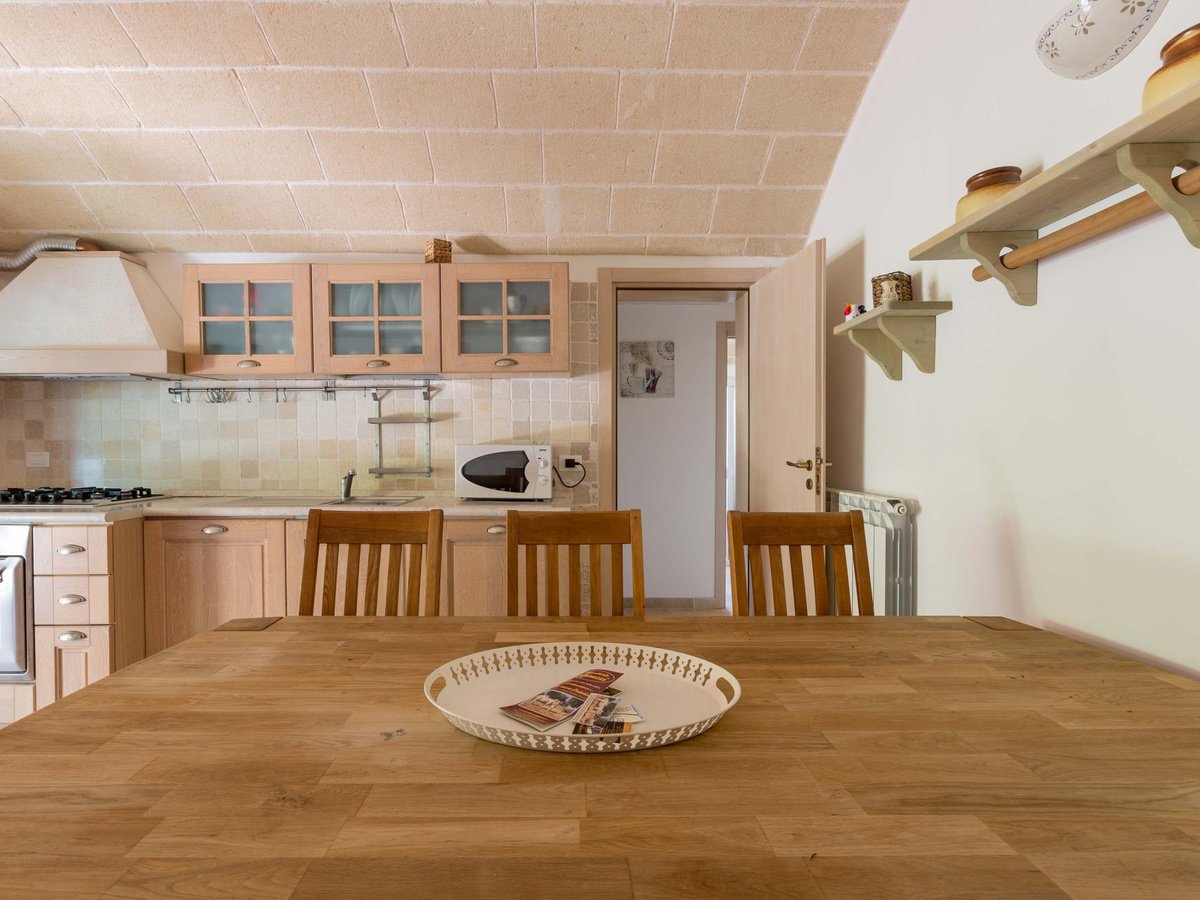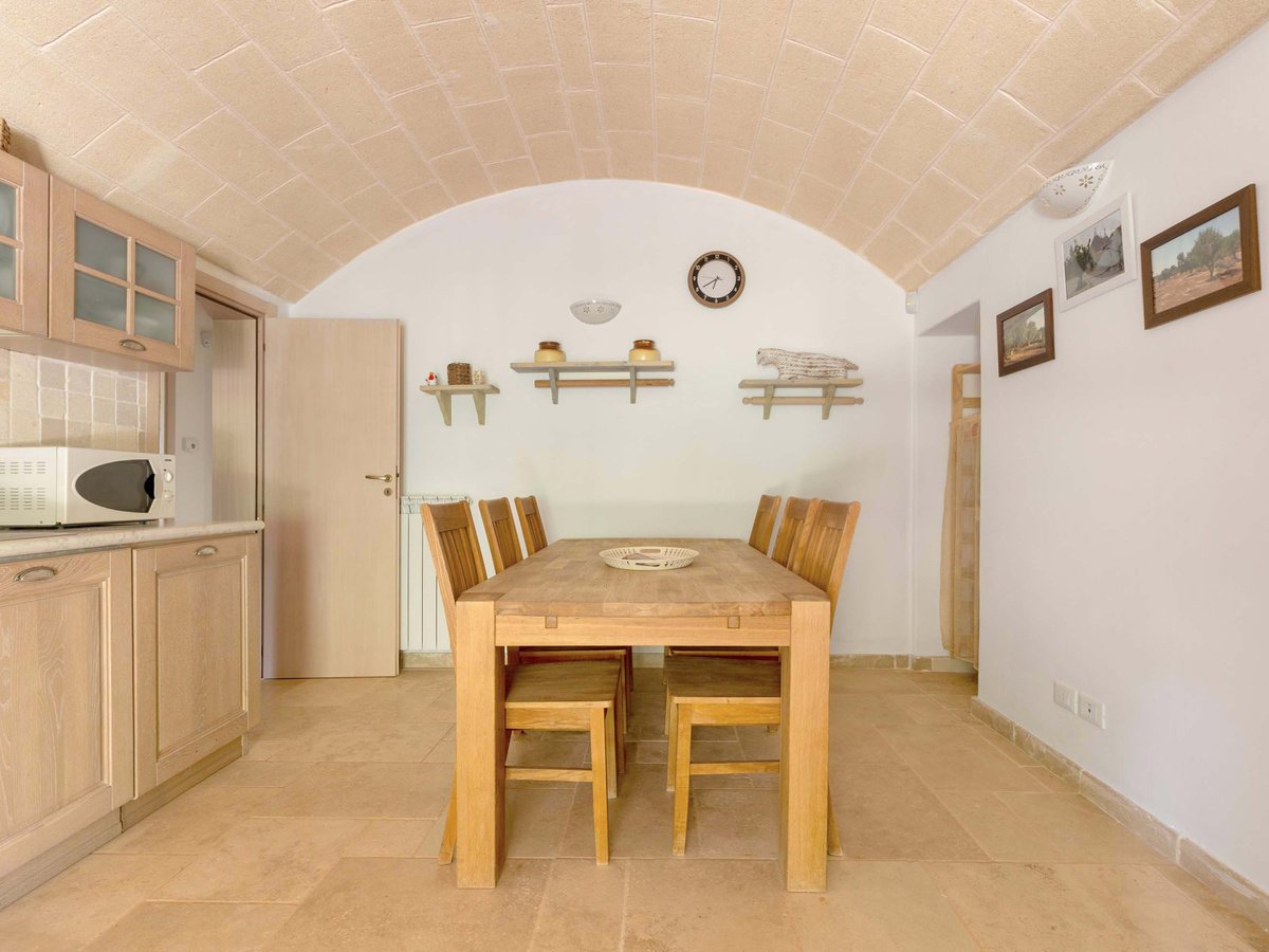 The home features classic trullo cones and a bright, functional layout. Inside, you’ll find a cozy sitting area, a well-equipped kitchen, three bedrooms (two in the trullo, one in the lamia), and two bathrooms. The kitchen opens onto a shaded veranda—perfect for easy indoor-outdoor living.