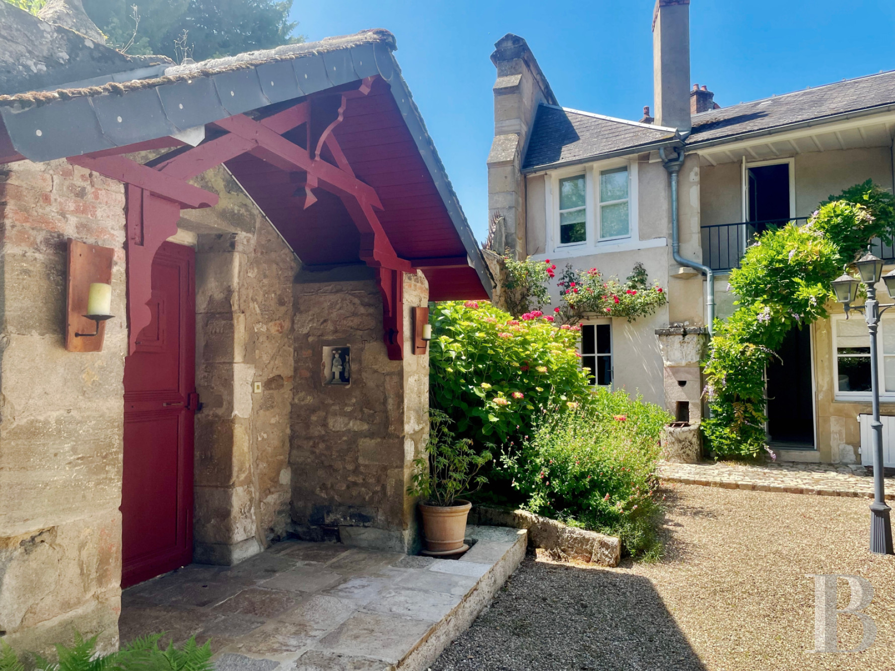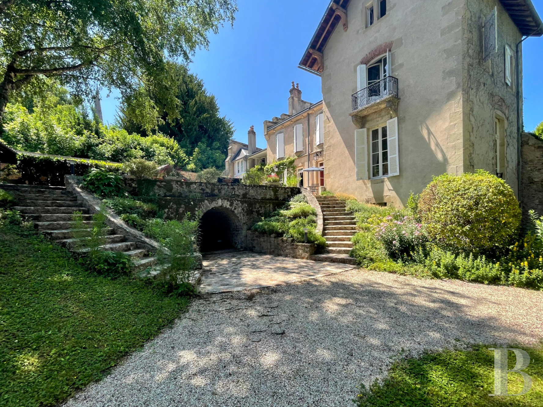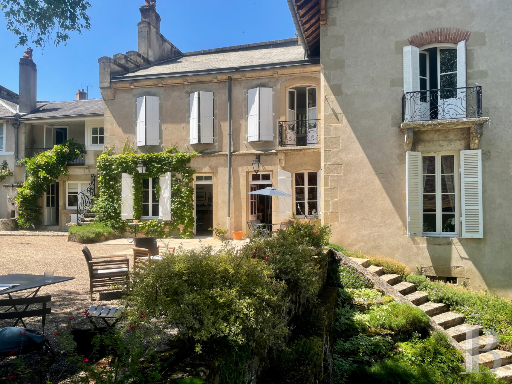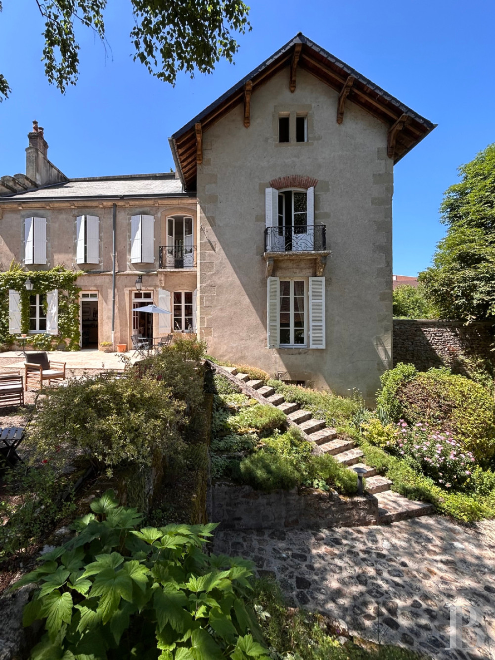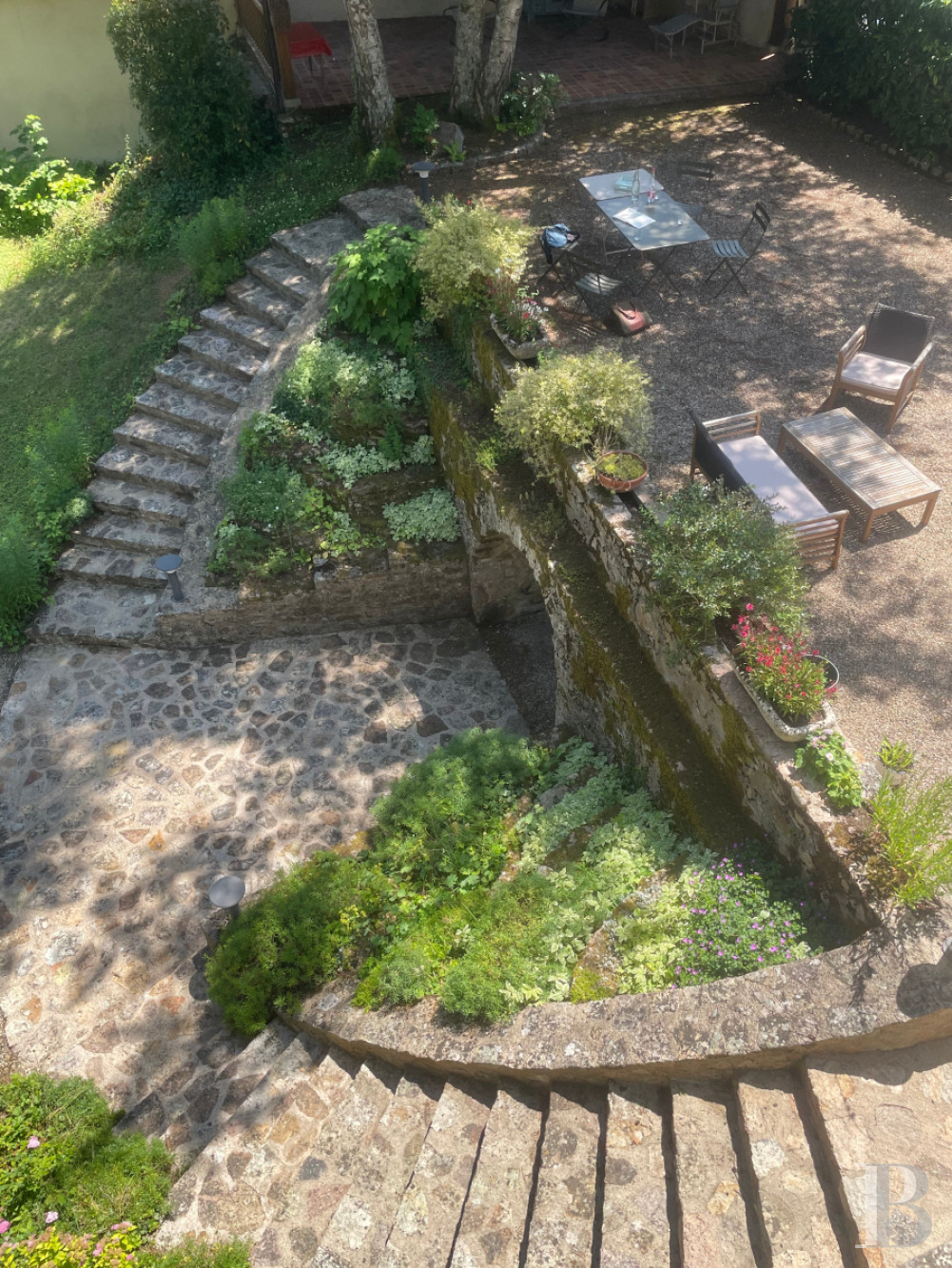 A vaulted cellar, attic, and outbuildings add storage and versatility. The garden, framed by stone walls and shaded by mature trees, offers year-round beauty and privacy—a hidden refuge in the center of town.