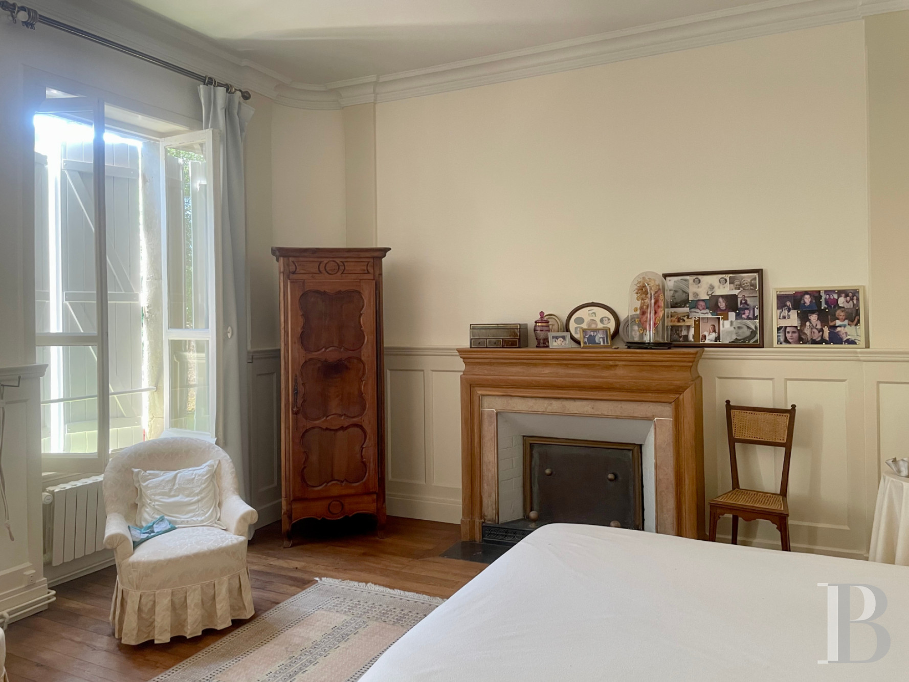 Inside, the home flows from a central hall to light-filled salons with fireplaces and oak parquet. The kitchen opens to the courtyard for easy outdoor living, while the west wing includes service areas and a secondary entrance.