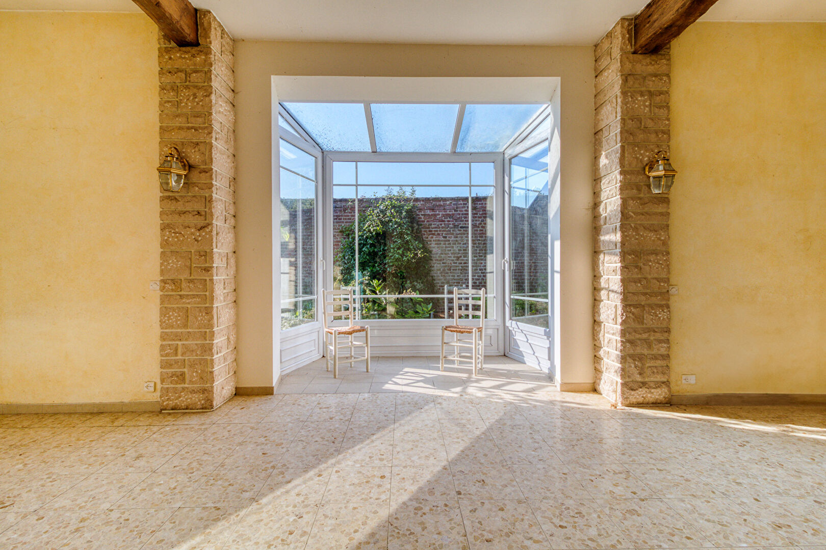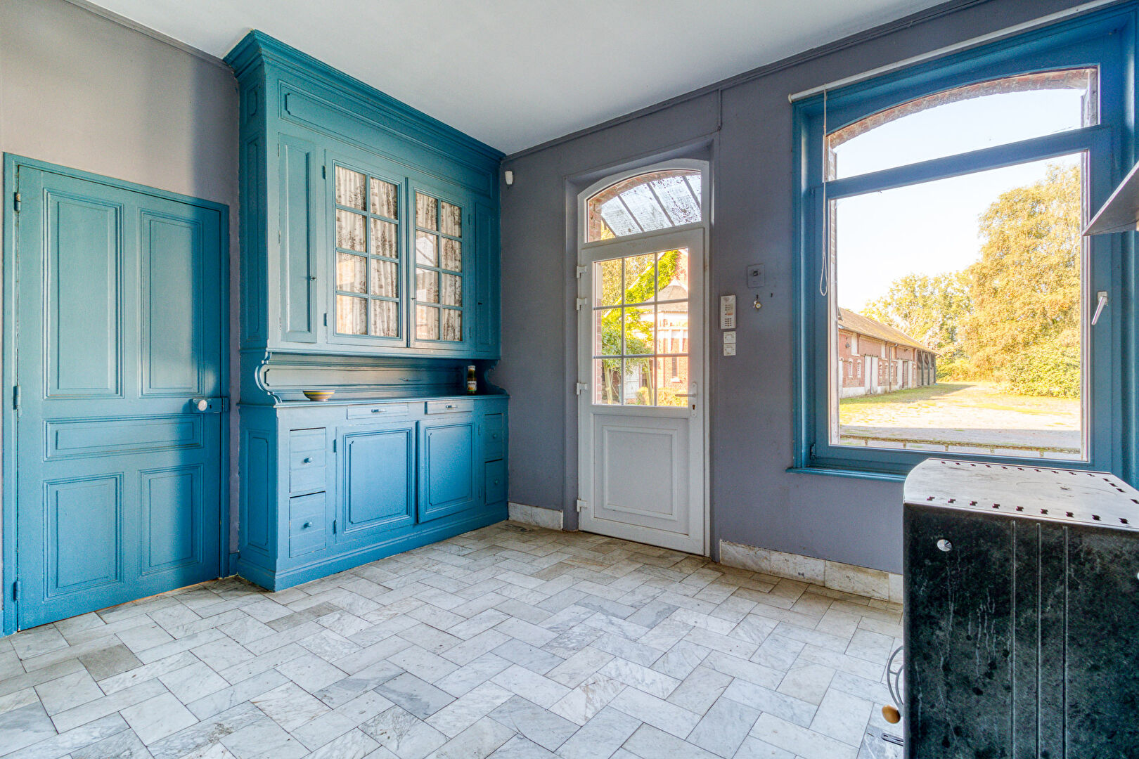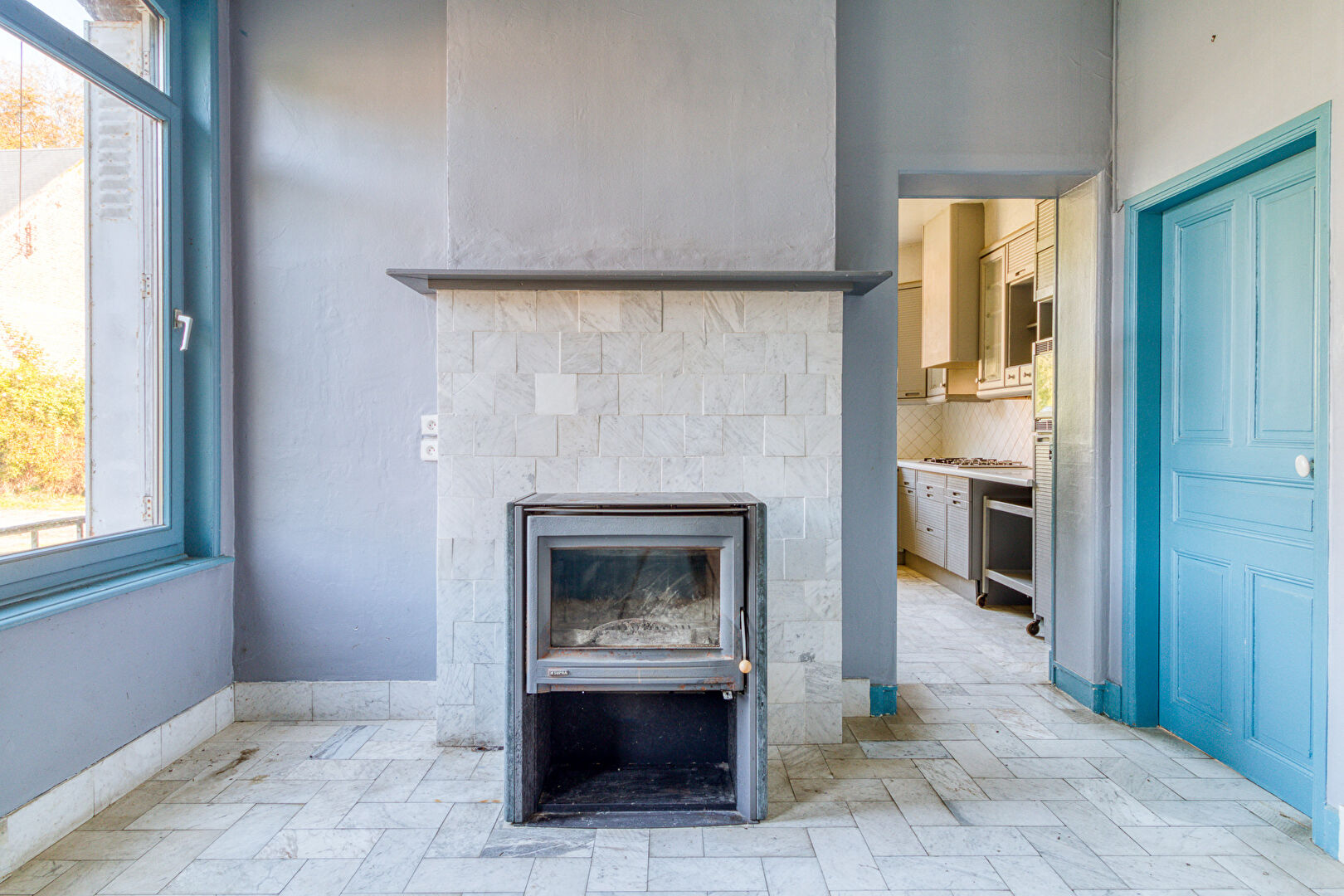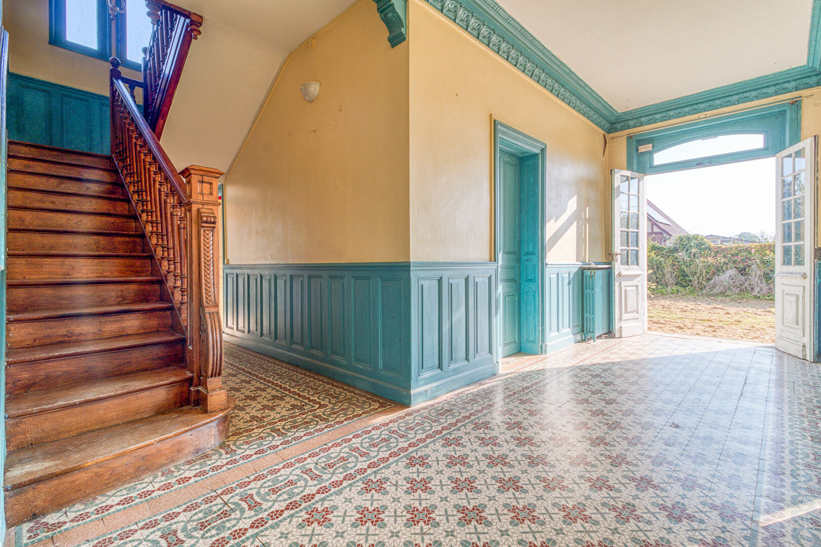 Inside, original charm shines through. The entrance hall, with its vintage cement tiles, leads to a spacious layout ideal for family life or creative use.