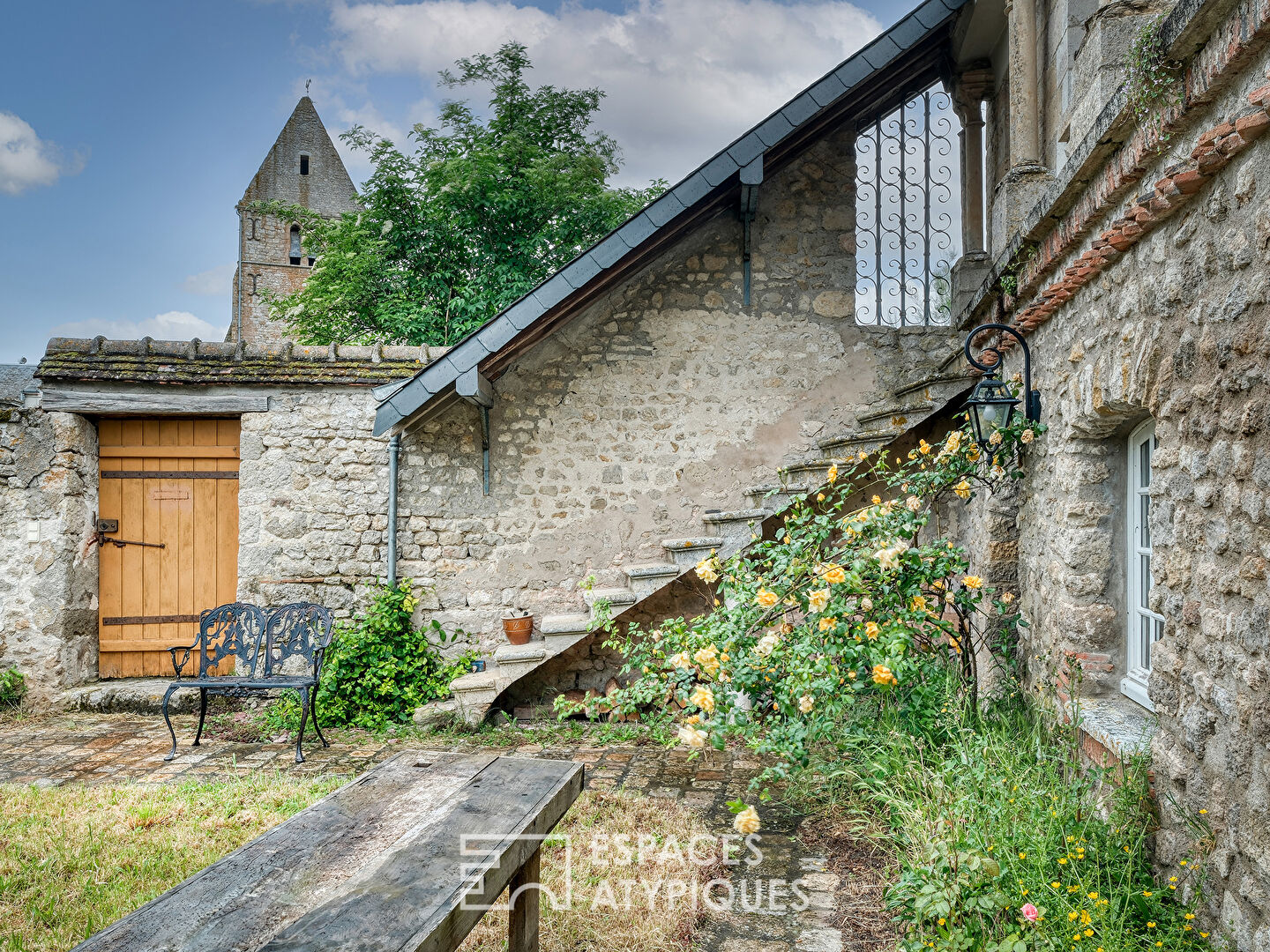 The chapel (approx. 50 sqm) features stained glass, exposed beams, and vibrant walls—ideal for a guest house, studio, or retreat. Just across the courtyard, the main residence combines original charm with modern comfort. Upstairs, a serene master suite includes a spa and offers views of the village church.