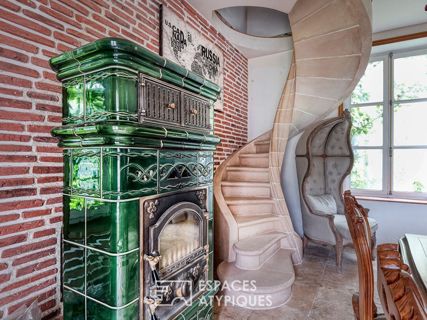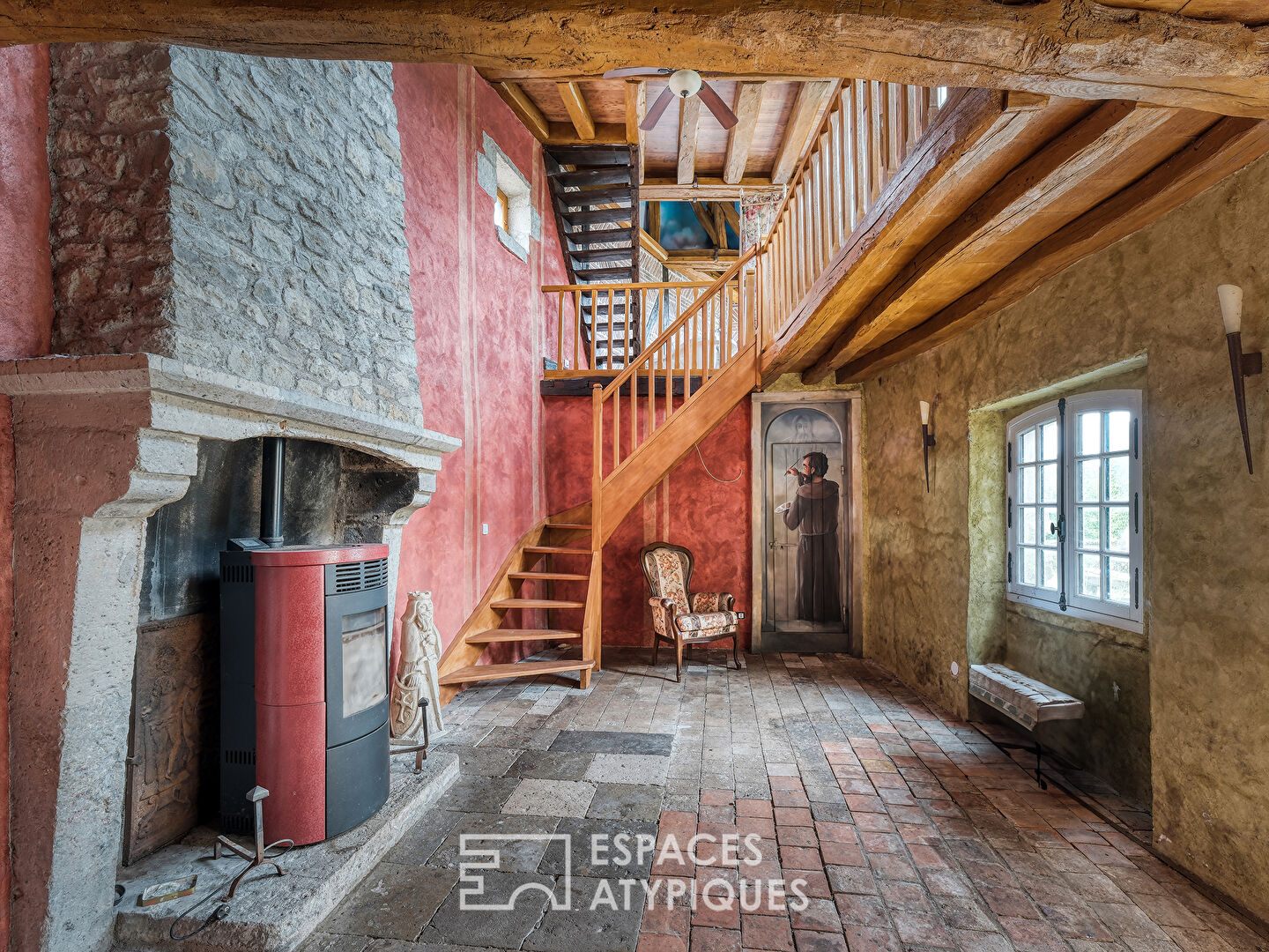 - Vaulted kitchen, Alsatian stove, and grand staircase