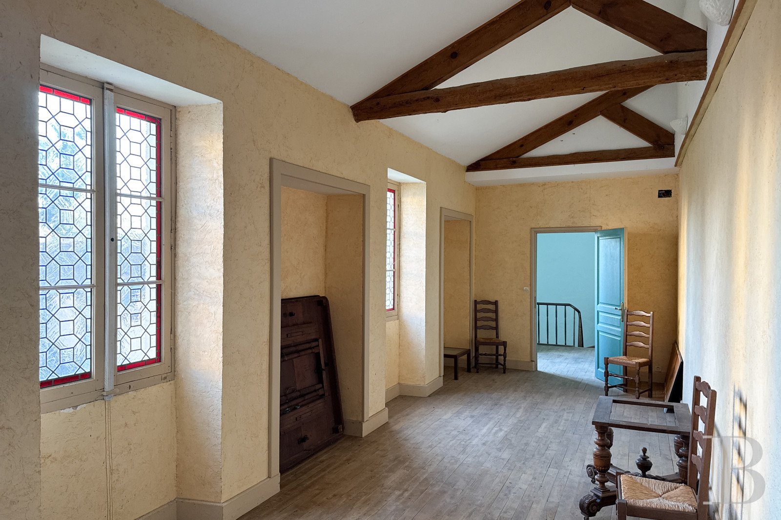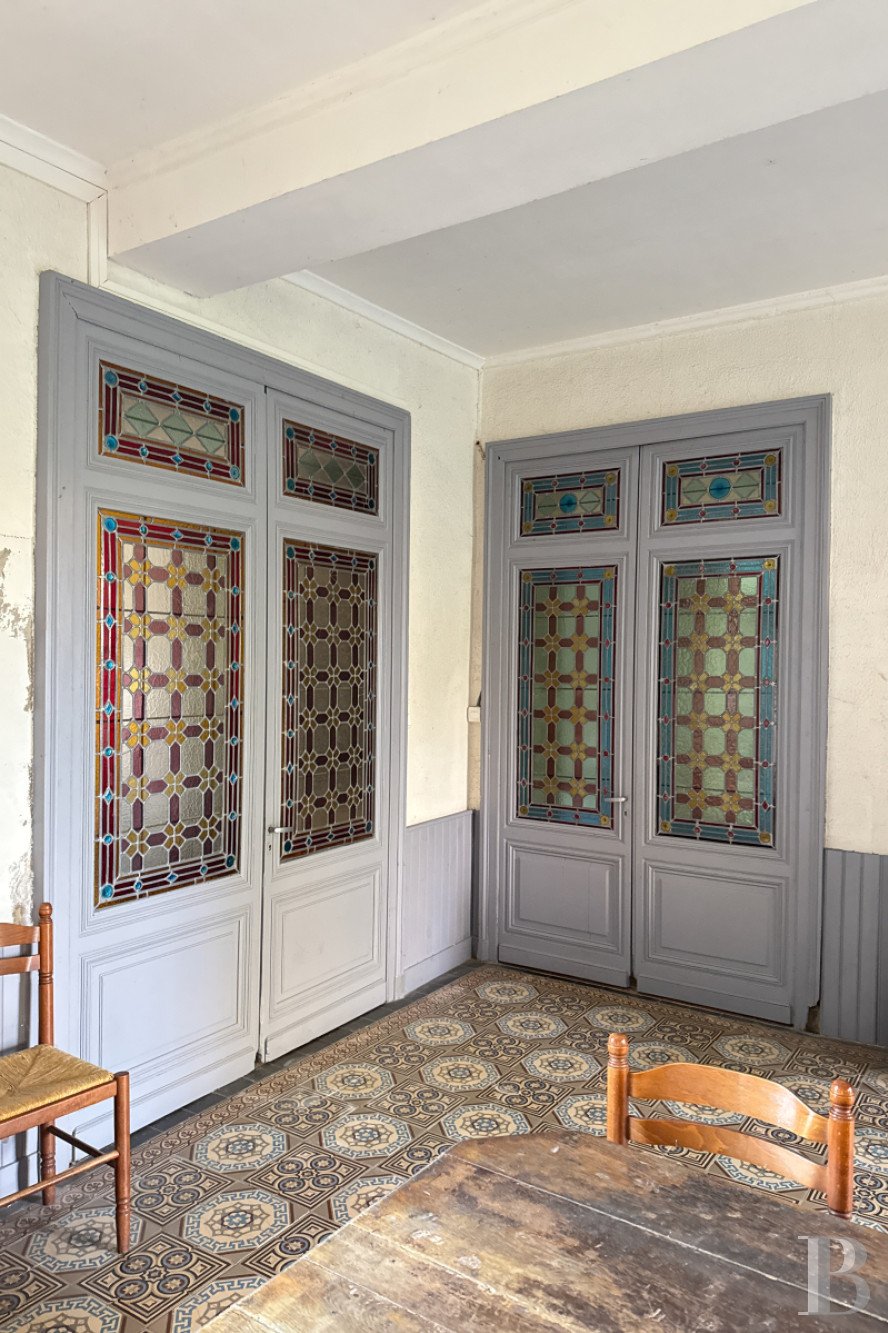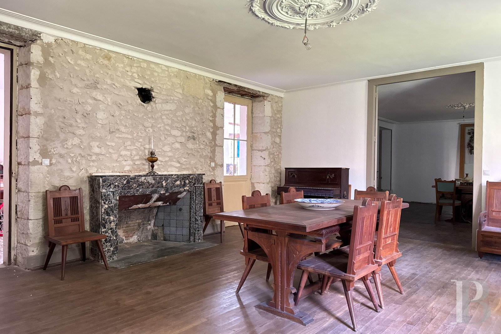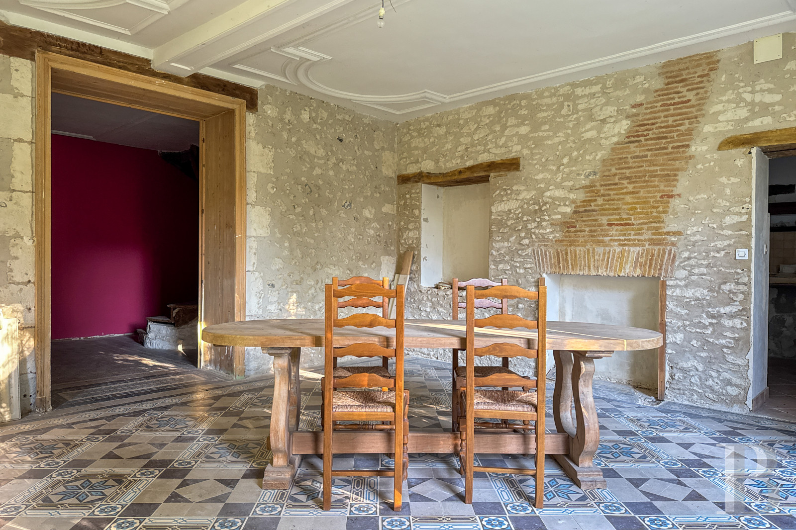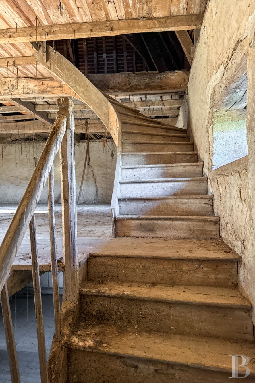 Interiors are generous and full of character, featuring exposed beams, stone walls, parquet floors, and fireplaces. The main house spans over 600 m² and is currently divided into three units, easily combined into a single residence. Additional pavilions and outbuildings offer flexibility for renovation or creative projects.