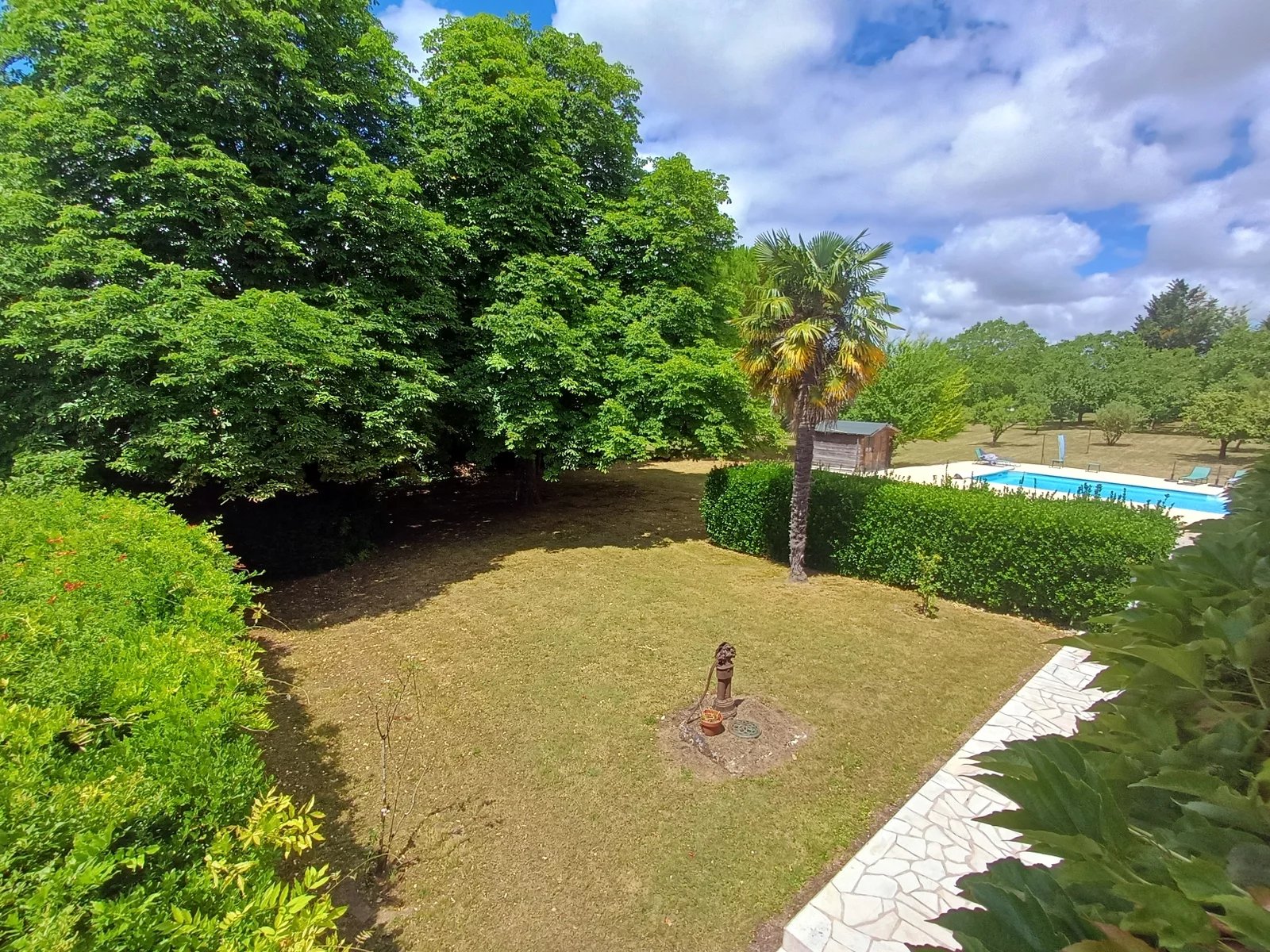 The grounds are a delight, offering over 7,000 m² of enclosed gardens. A flourishing orchard brings seasonal bounty, while the pool enjoys the sunny microclimate of this corner of southwest France. Mature trees, well-kept lawns, and private gates create a sense of seclusion without isolation.