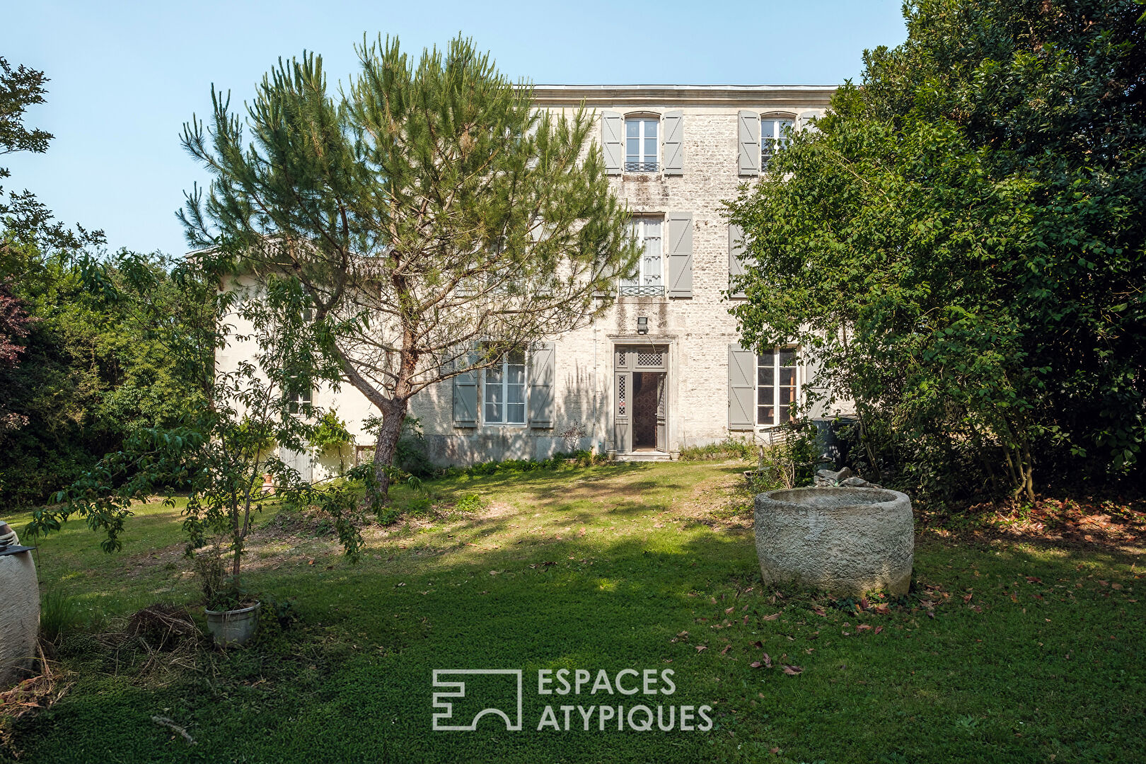 The garden is fully enclosed and beautifully landscaped. Gray shutters frame the light stone facade, and the setting is both peaceful and private.