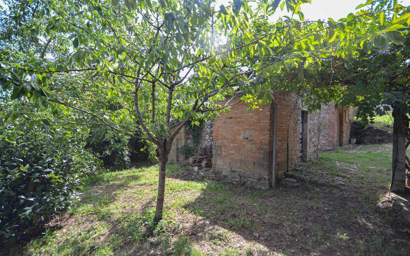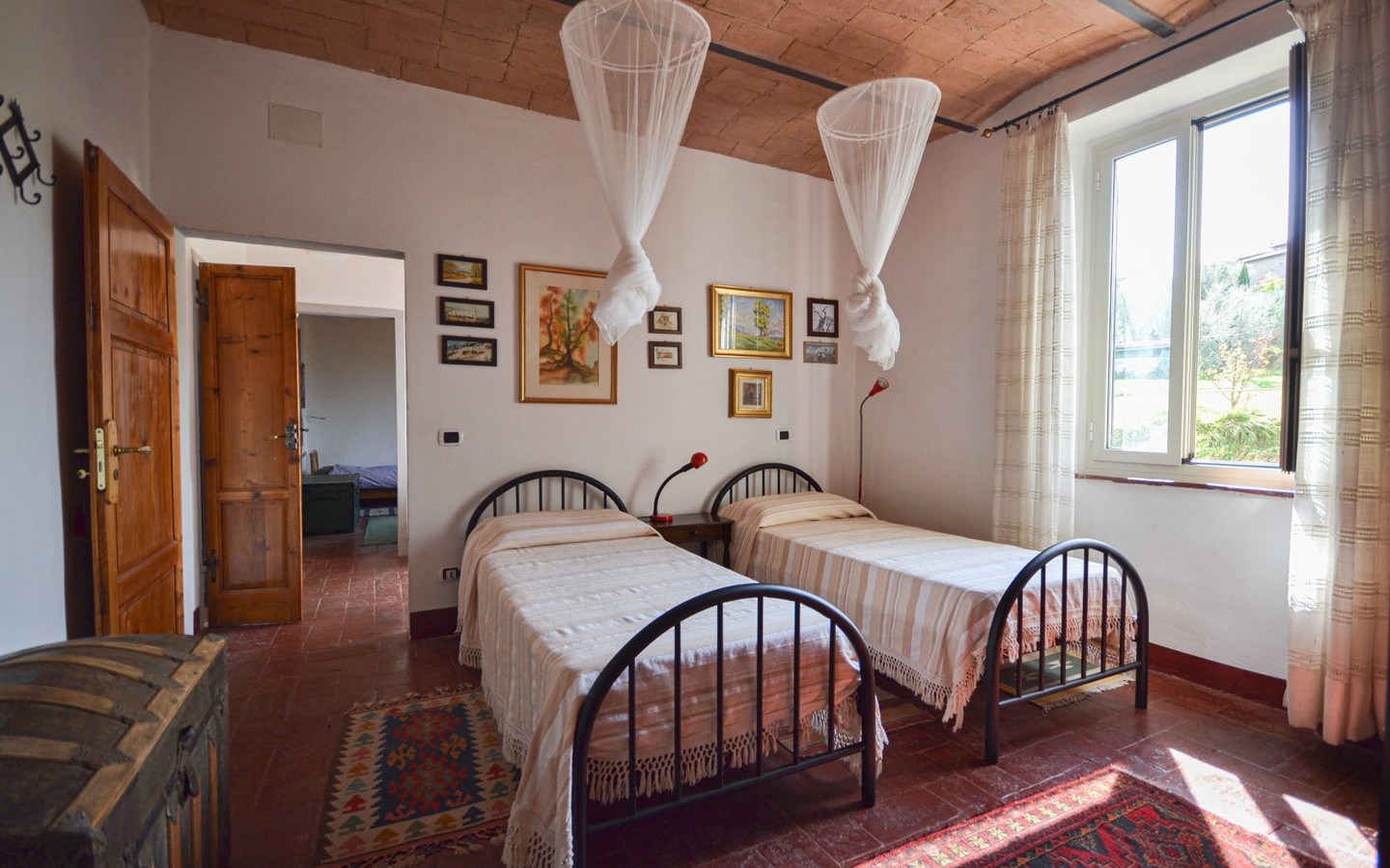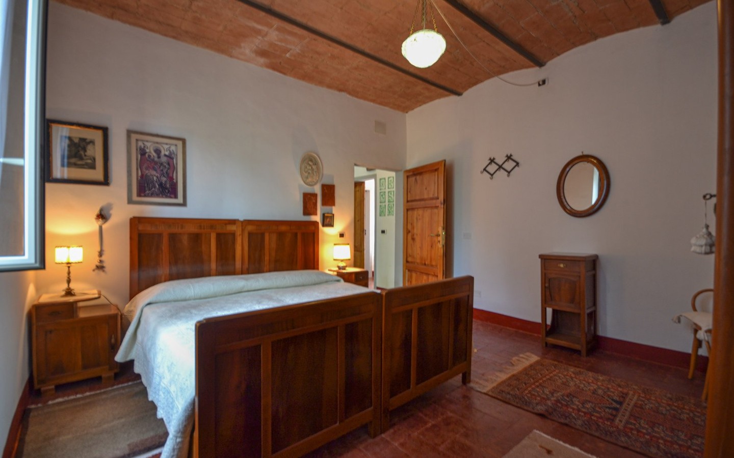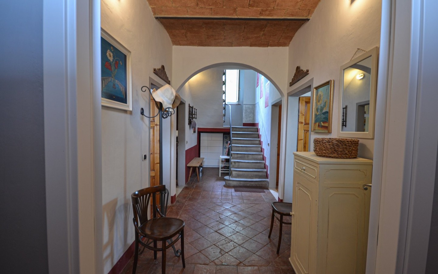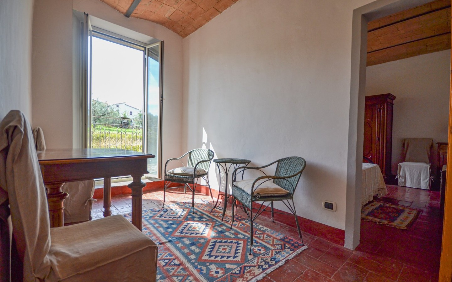 Warm interiors feature terracotta floors, exposed brick, and vaulted ceilings. The layout is flexible, offering potential for independent living areas—perfect for guests or multi-generational living.