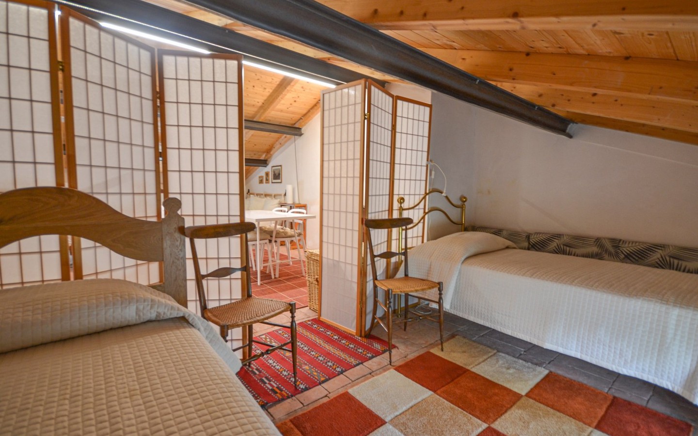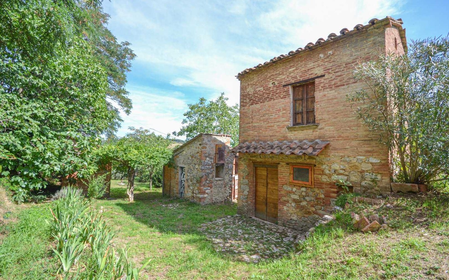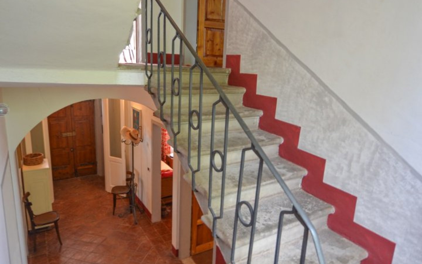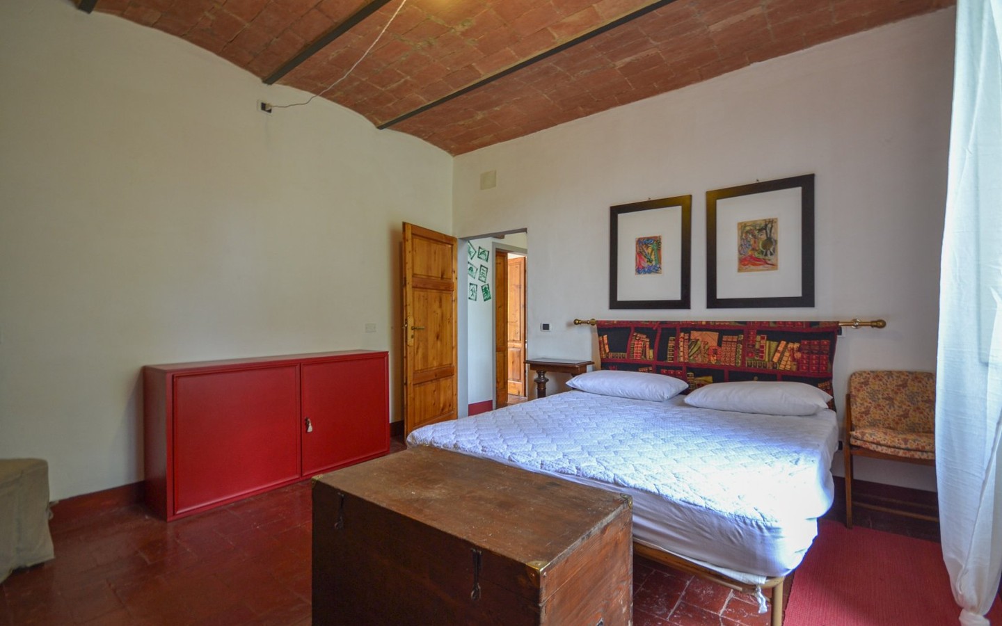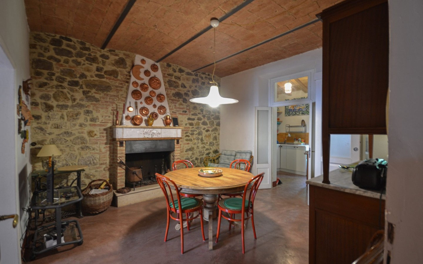 Warm interiors feature terracotta floors, exposed brick, and vaulted ceilings. The layout is flexible, offering potential for independent living areas—perfect for guests or multi-generational living.