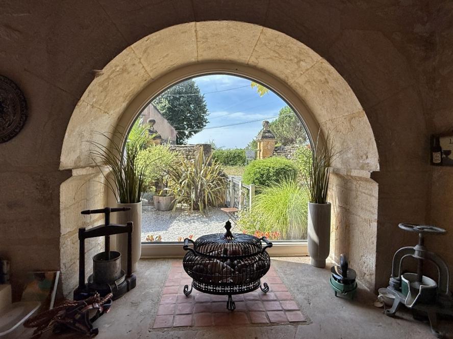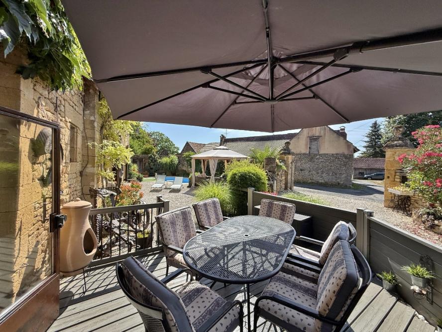 Outside, the low-maintenance garden invites relaxation. The terrace and pool create a peaceful retreat, surrounded by stone walls and greenery, which is ideal for enjoying the Dordogne sunshine.