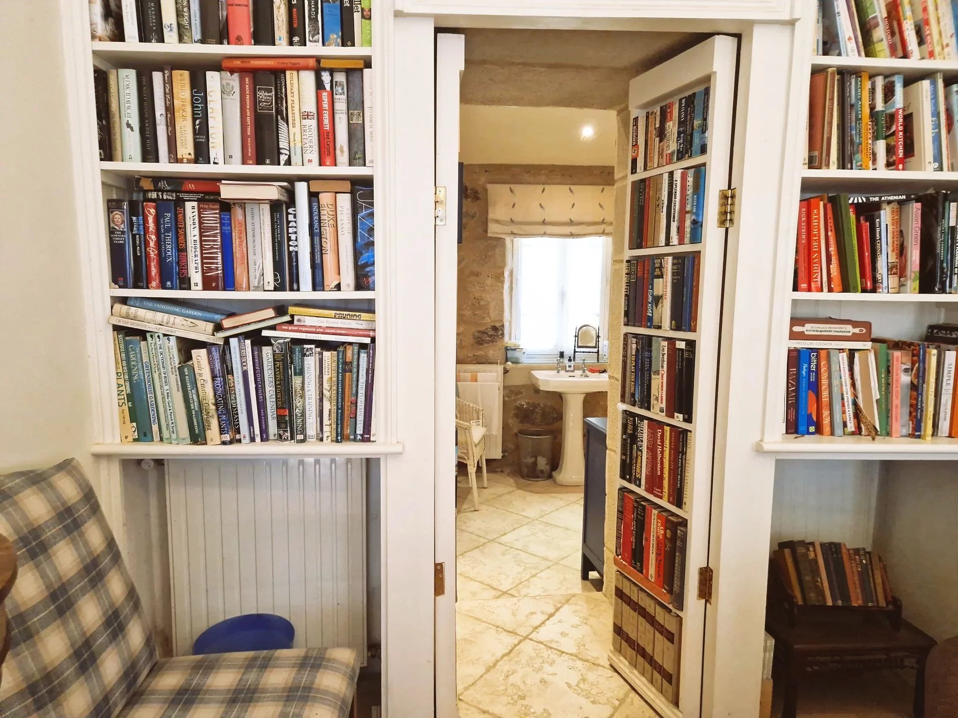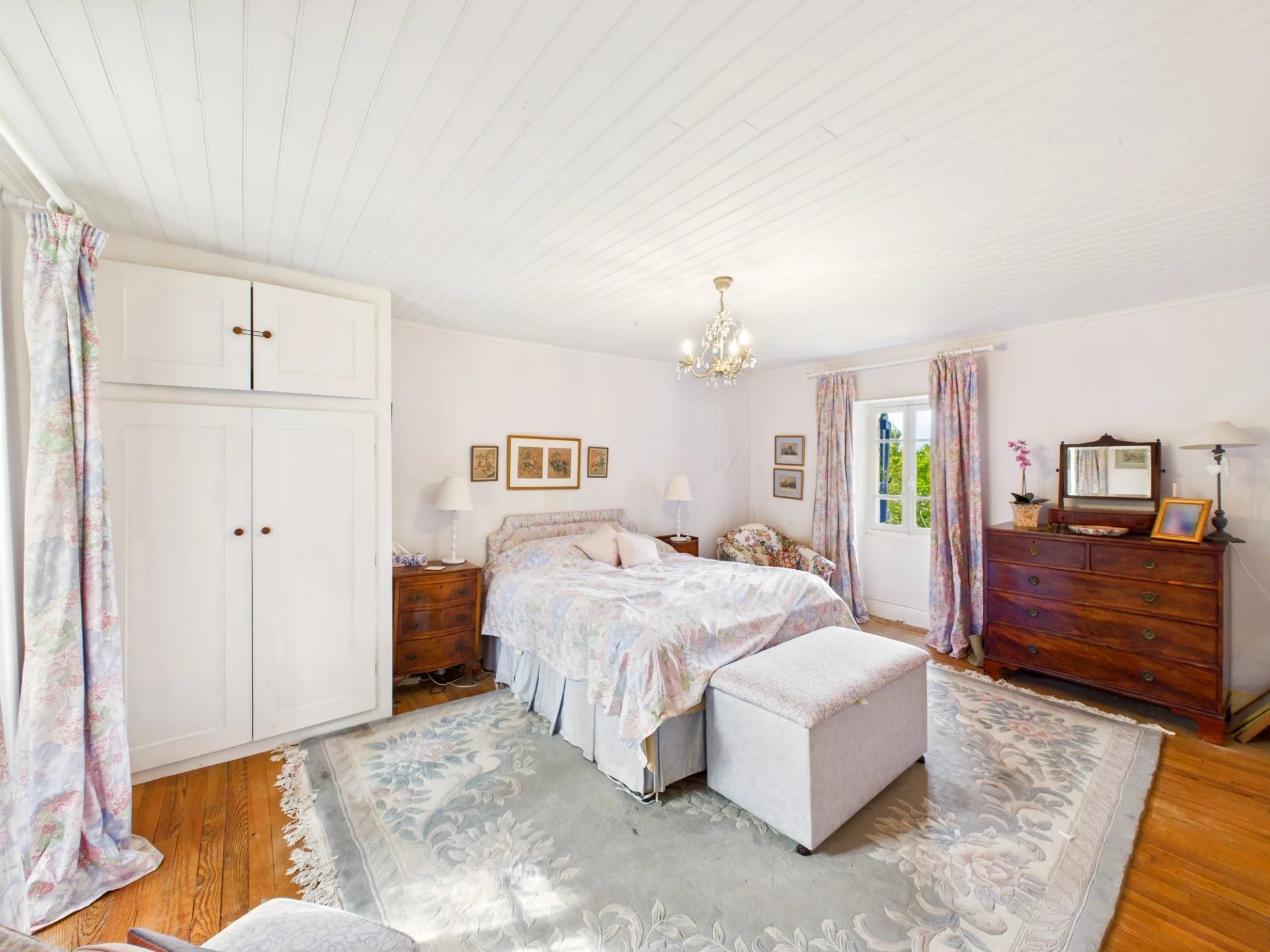 Inside, spacious rooms and high ceilings create a bright, airy flow. A hidden bookcase door reveals a secret shower room, adding a touch of whimsy to this elegant home.