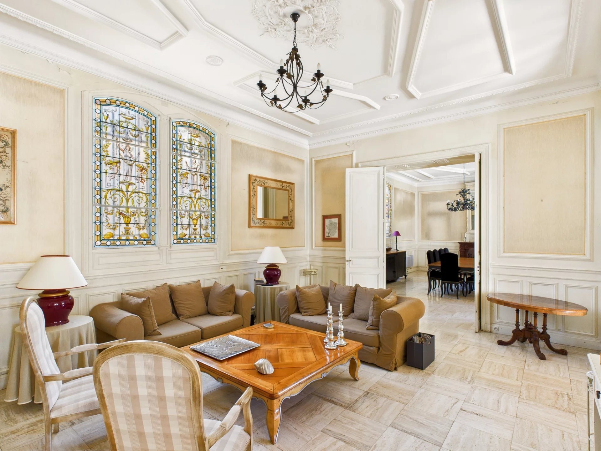 Behind its elegant iron gates stands a grand stone façade, once featured on an early 20th-century postcard. Inside, high ceilings, stained glass from 1899–1900, encaustic tiles, marble fireplaces, and a carved staircase preserve its timeless character. Restored with care, the home blends original features with thoughtful modern updates.