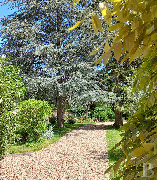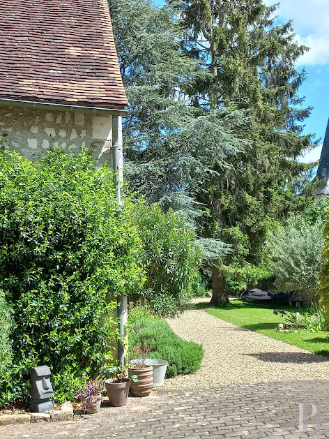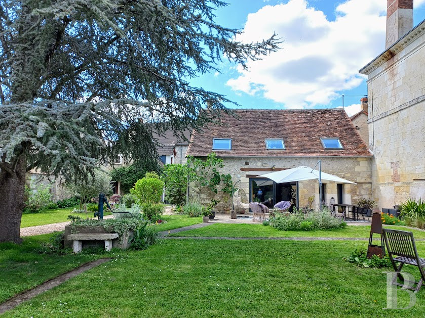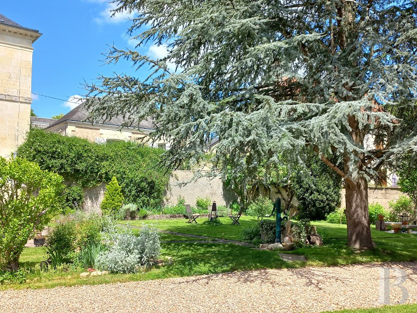 On its 1,100 m² plot, the property unfolds between a courtyard and a garden, accessed by two gates. It includes a main residence, a guest house, and a small outbuilding, each with terraces and stone façades framed by tuffeau. The garden is filled with flowers, fruit trees, and a majestic cedar that casts summer shade.