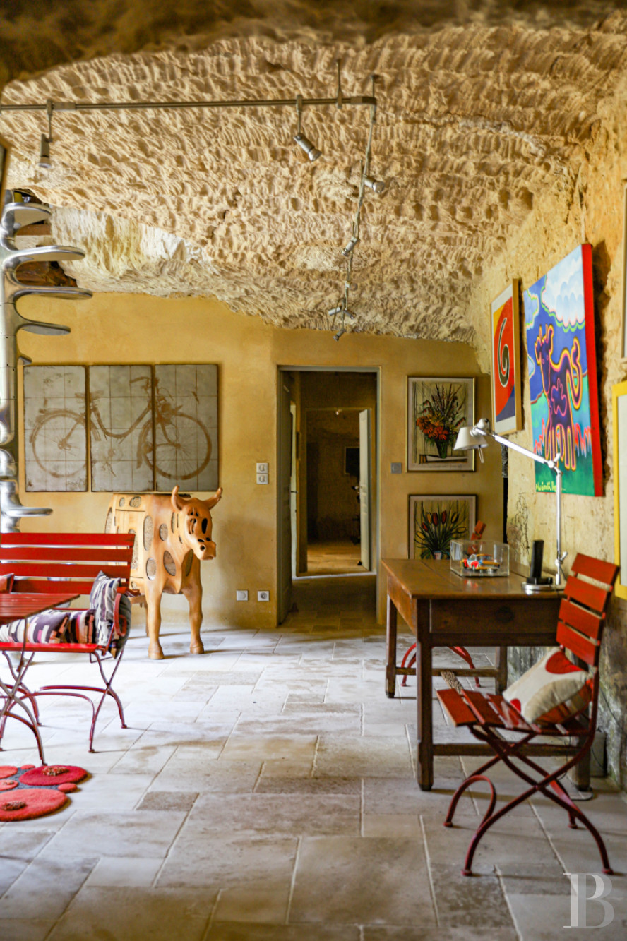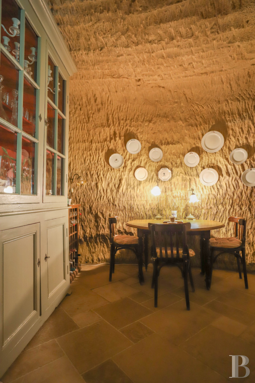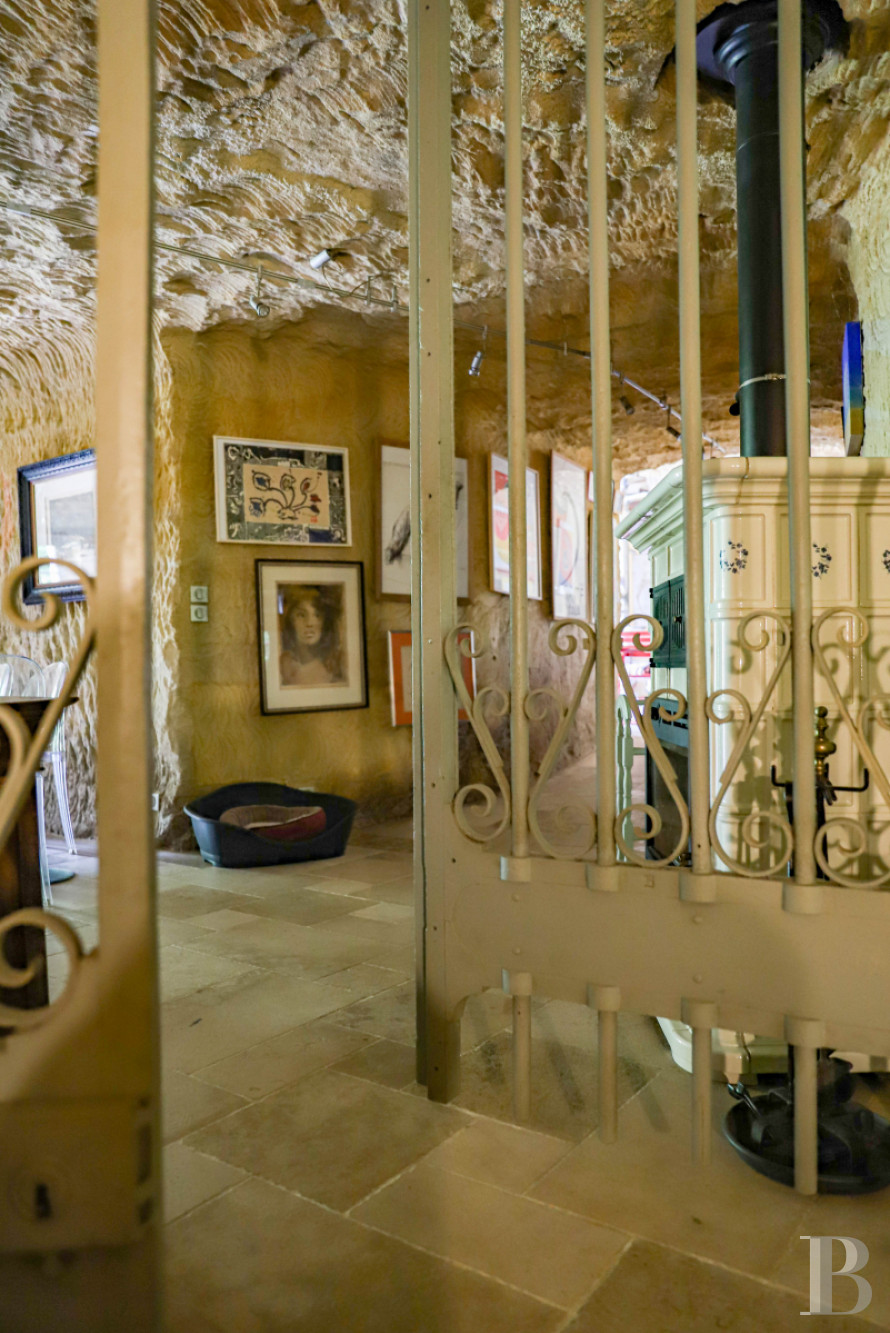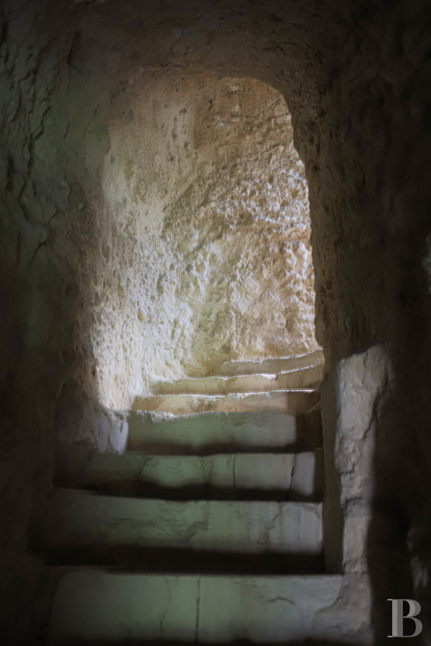 Built into the hillside, the home combines two tuffeau stone façades with original rock-hewn rooms. Multiple terraces face the valley, while a promontory terrace offers sweeping views.