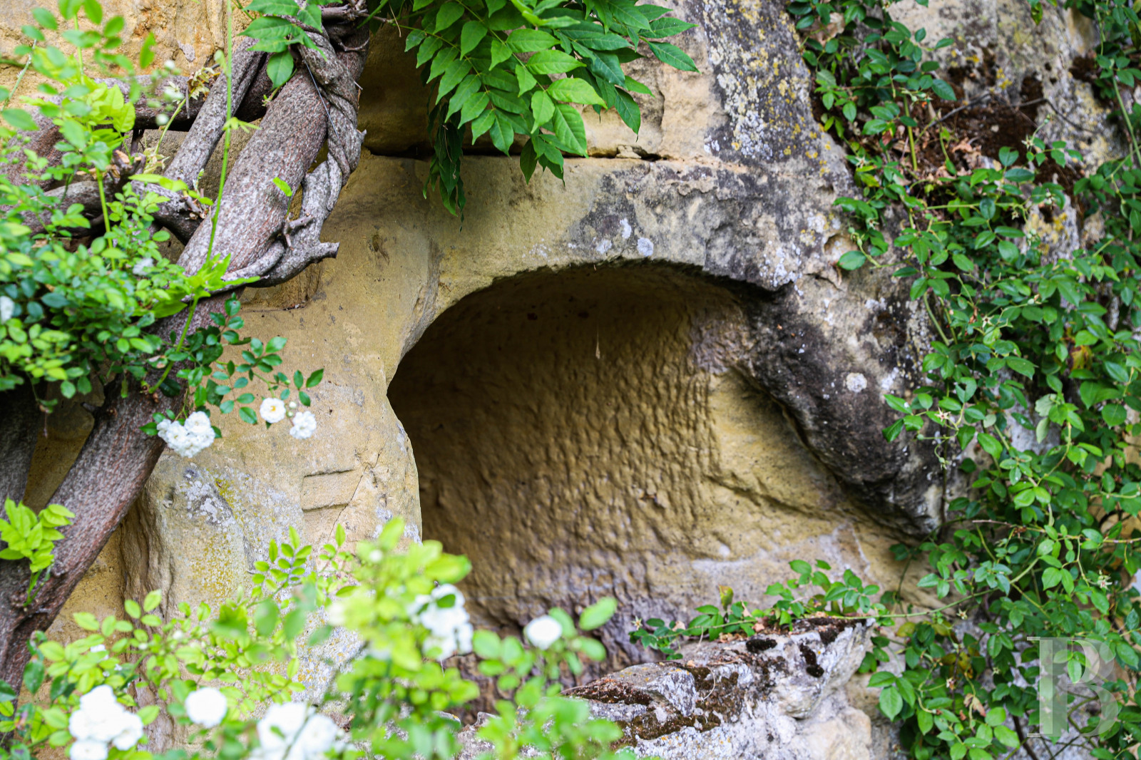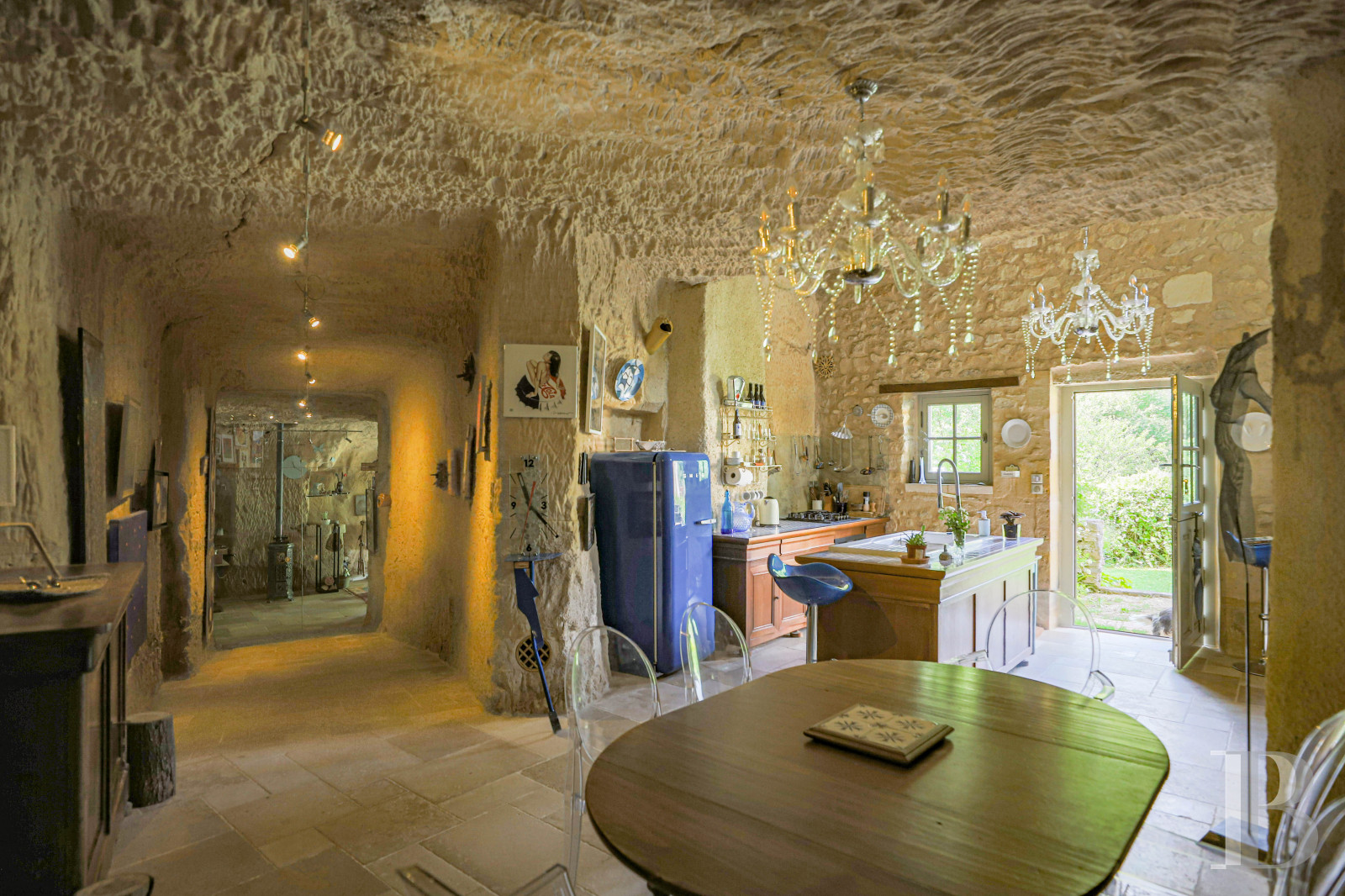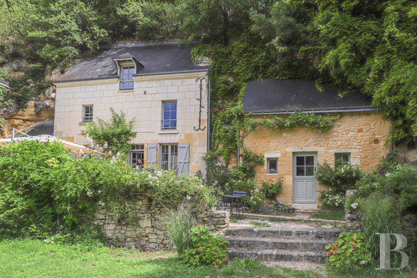 Built into the hillside, the home combines two tuffeau stone façades with original rock-hewn rooms. Multiple terraces face the valley, while a promontory terrace offers sweeping views.