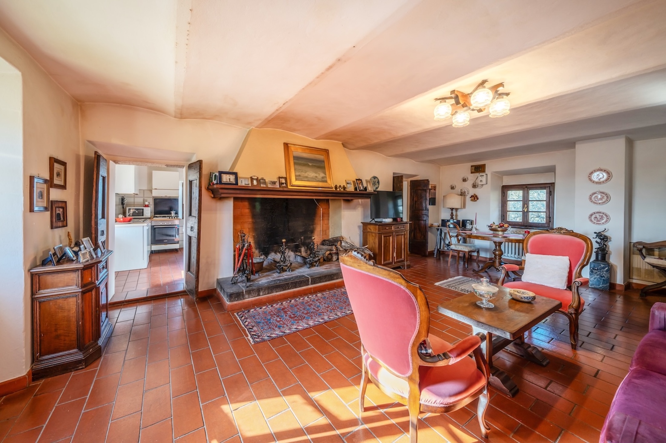 Inside, you’ll find terracotta floors, chestnut windows, and exposed beams. The ground floor features a spacious living room with a beautiful brick arch. Upstairs, a second living area with a fireplace, two bedrooms, and two bathrooms offer cozy country living. The top-floor attic is already fitted with utilities and can be converted into additional rooms.