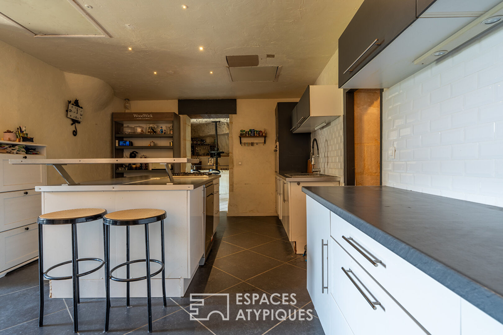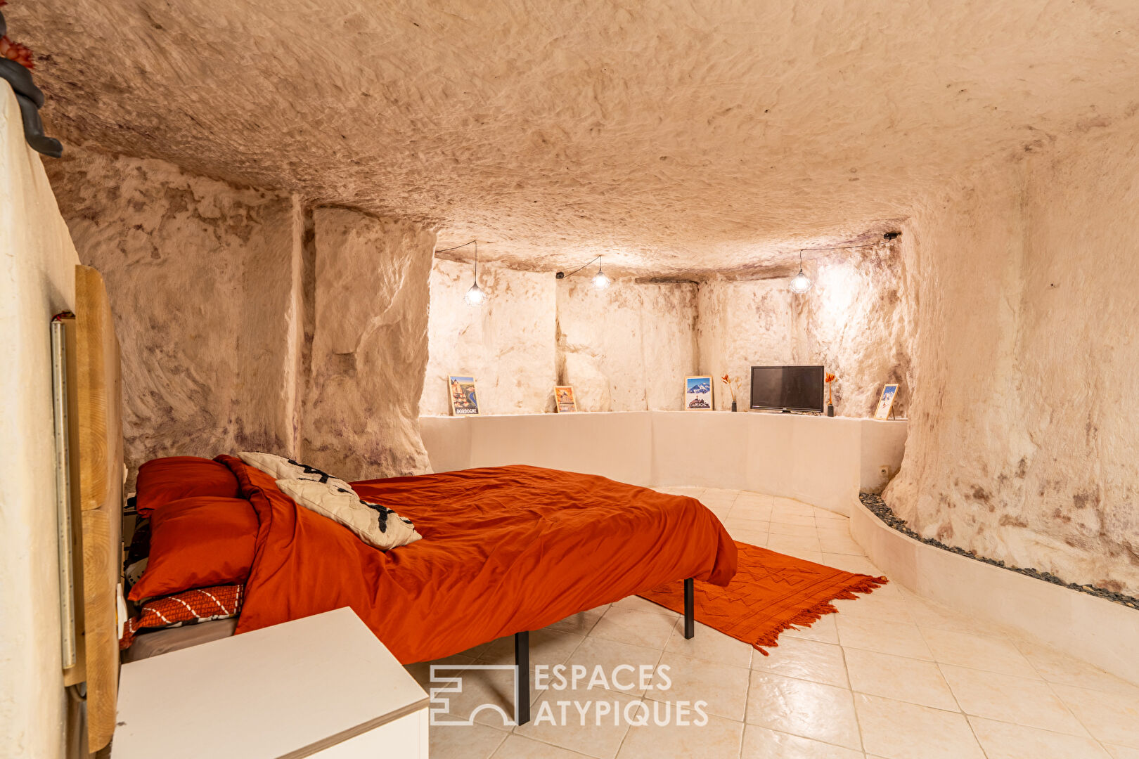East of Tours, in the peaceful commune of Reugny (37380), this rare troglodyte home offers 250 sqm of living space carved into the stone. Nestled on a 1,127 sqm plot, it combines rustic charm with modern comfort—and stays cool in summer, mild in winter thanks to its natural insulation.