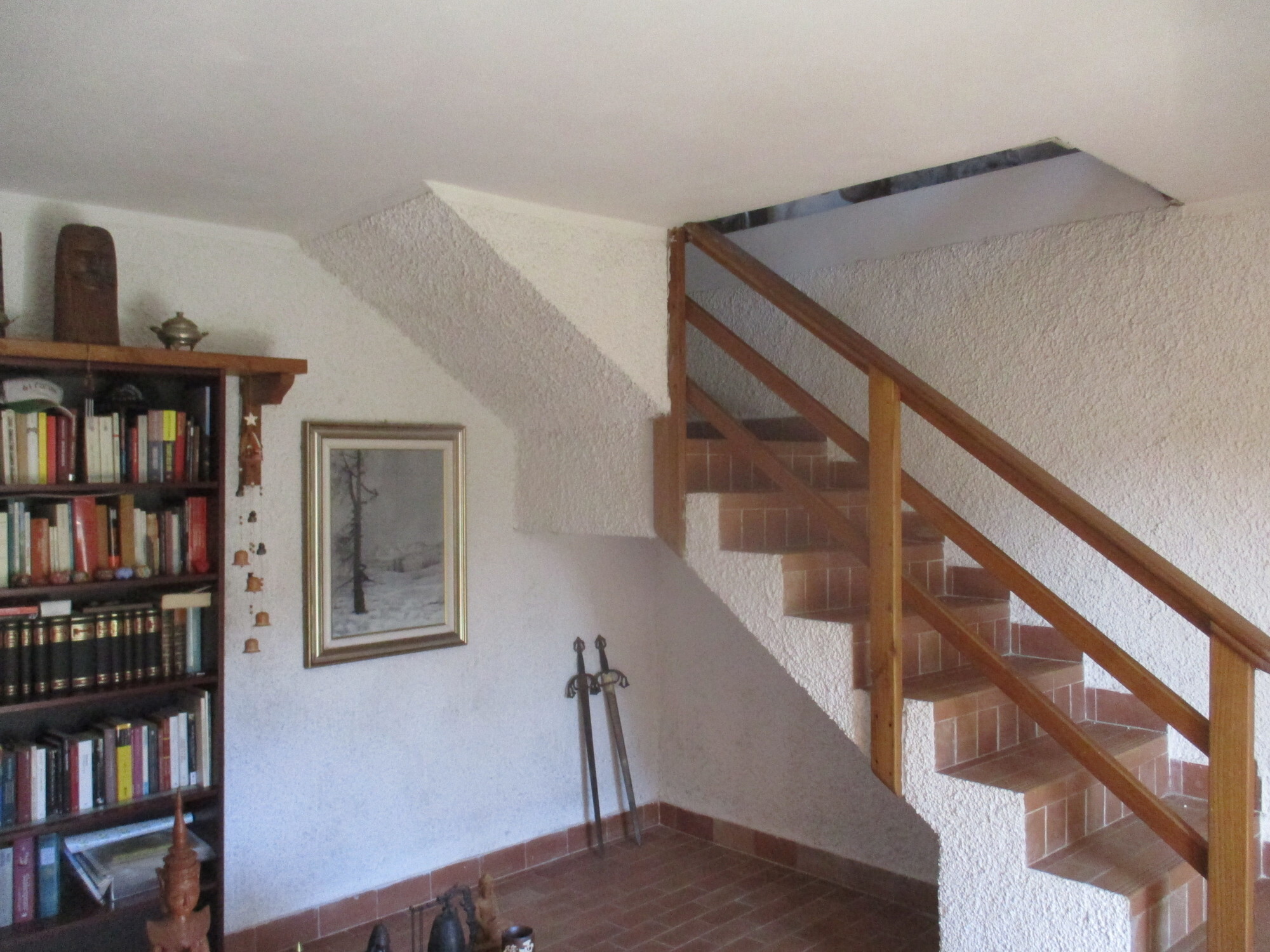 A wooden staircase leads to a small upper room—once a signal tower—and then to the covered terrace above.